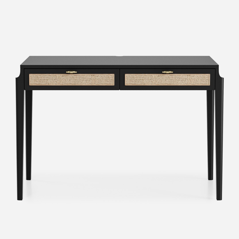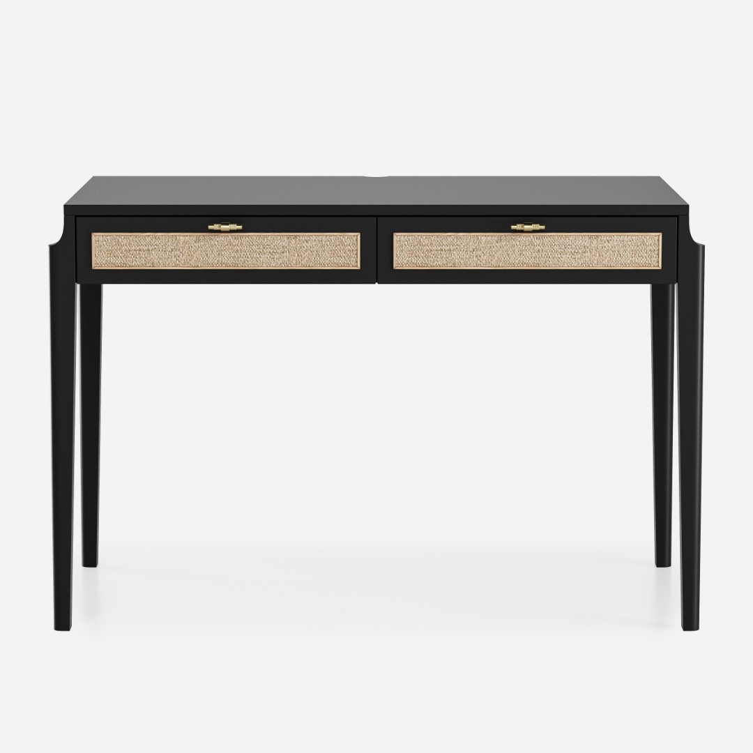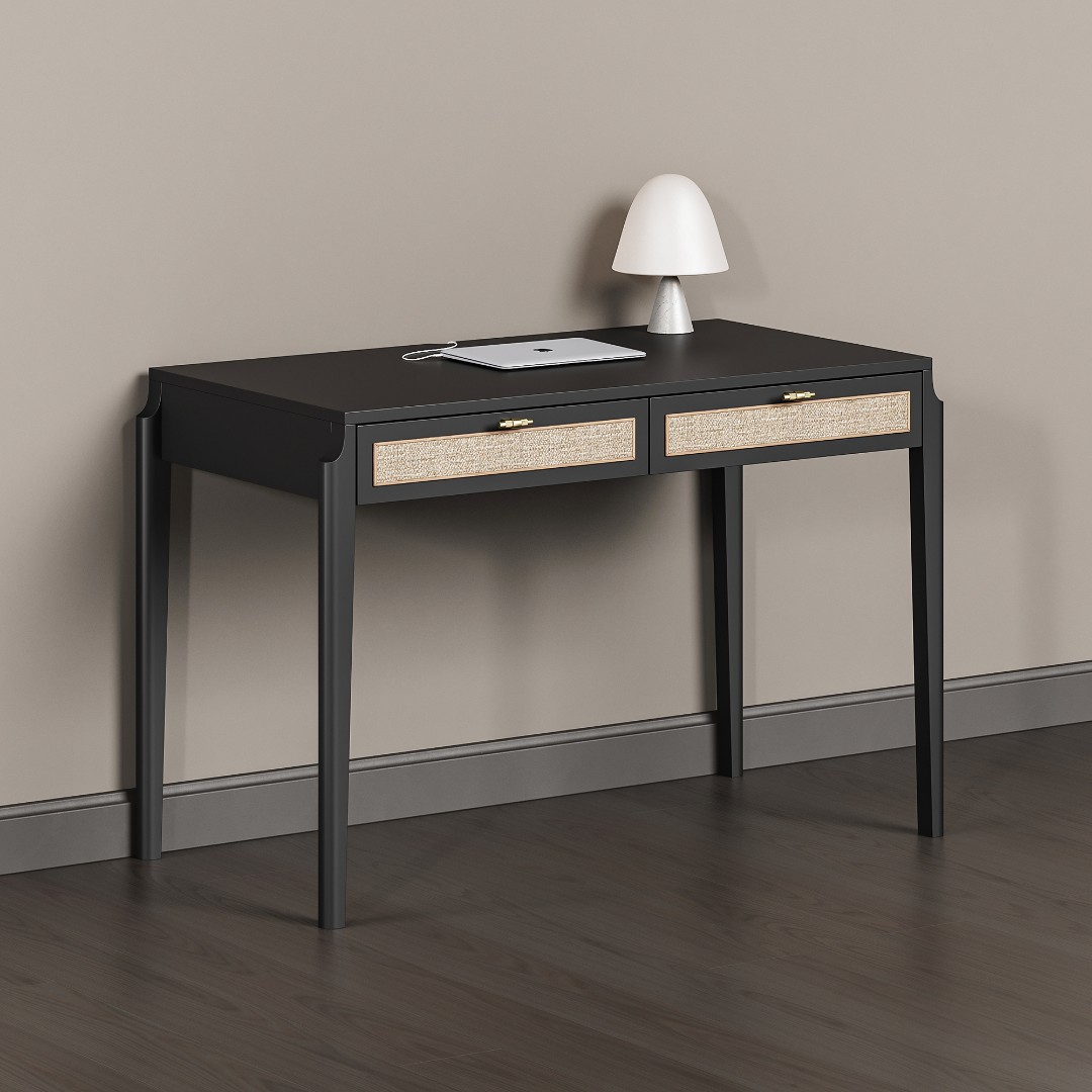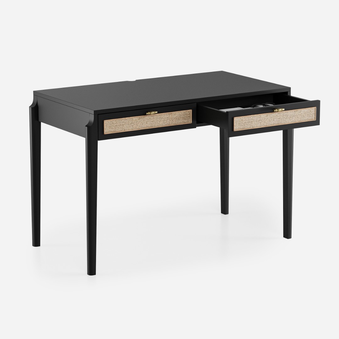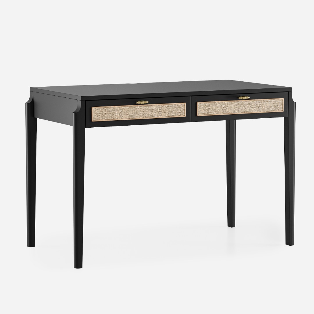 В основе дизайна коллекции Vishera – оригинальный фасадный декор, выполненный из натурального ротангового полотна. Естественная плетеная фактура ротанга придает мебели легкое очарование, свойственное традиционным ремесленным техникам, а природные текстуры и натуральные оттенки отделки создают неповторимую гармонию, теплоту и уют. Коллекция Vishera - это гармония натуральных текстур, легкости и мягкого минимализма. Мебель из коллекции органично дополнит ваш интерьер, будь то скандинавский стиль, soft-minimal, japandi или даже бохо.  Эргономика стола разработана таким образом, чтобы работать за ним было максимально комфортно. Пространство для ног позволяет комфортно сидеть даже человеку с ростом до 195см.Два неглубоких, но вместительных ящика позволят разместить в них книги, ноутбук, планшет, альбом для рисования, канцелярские принадлежности, оставив таким образом рабочую поверхность стола свободной и удобной для работы.