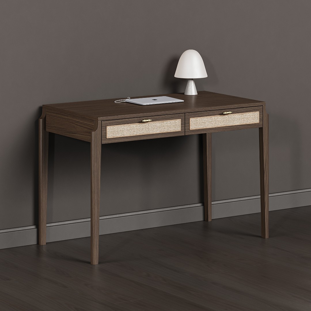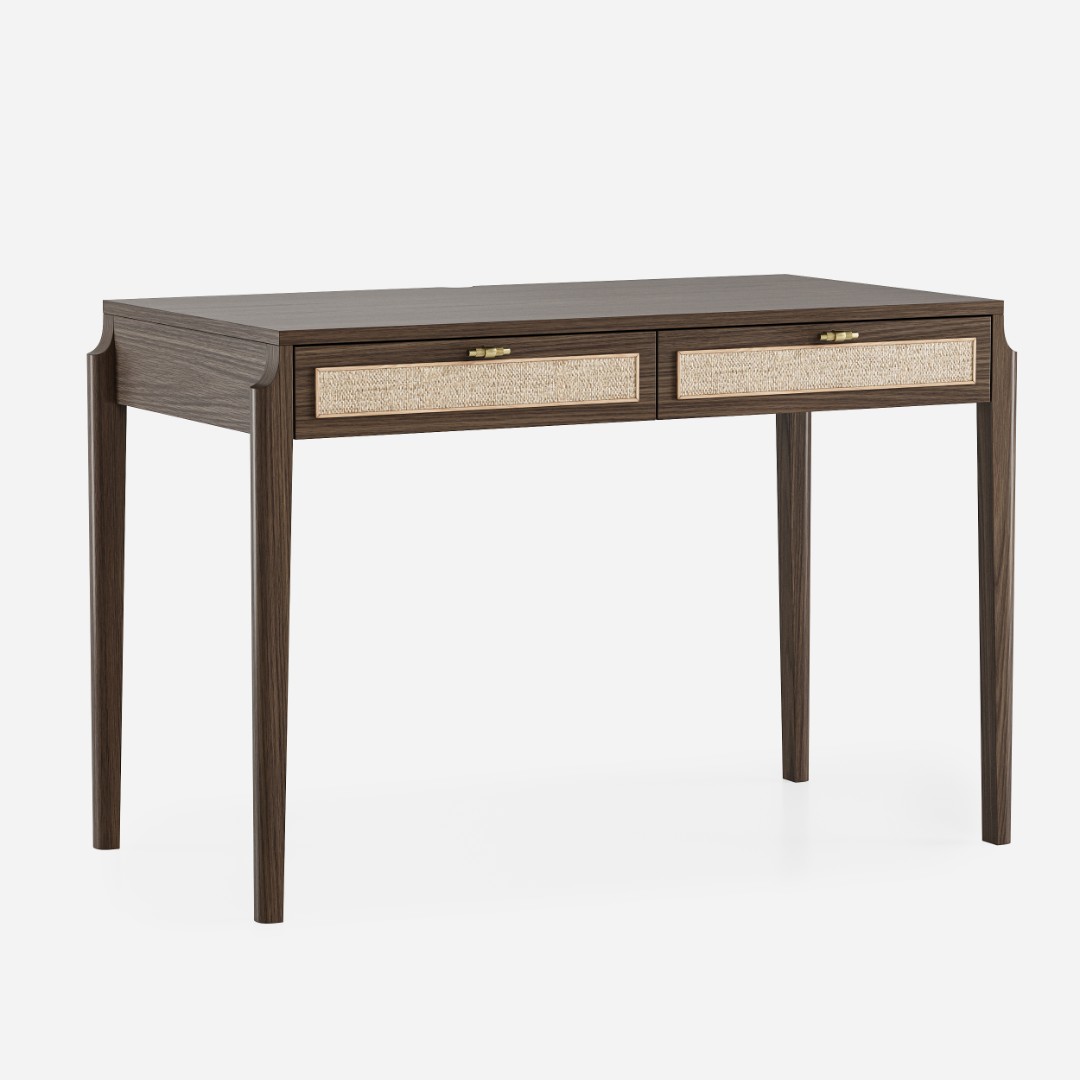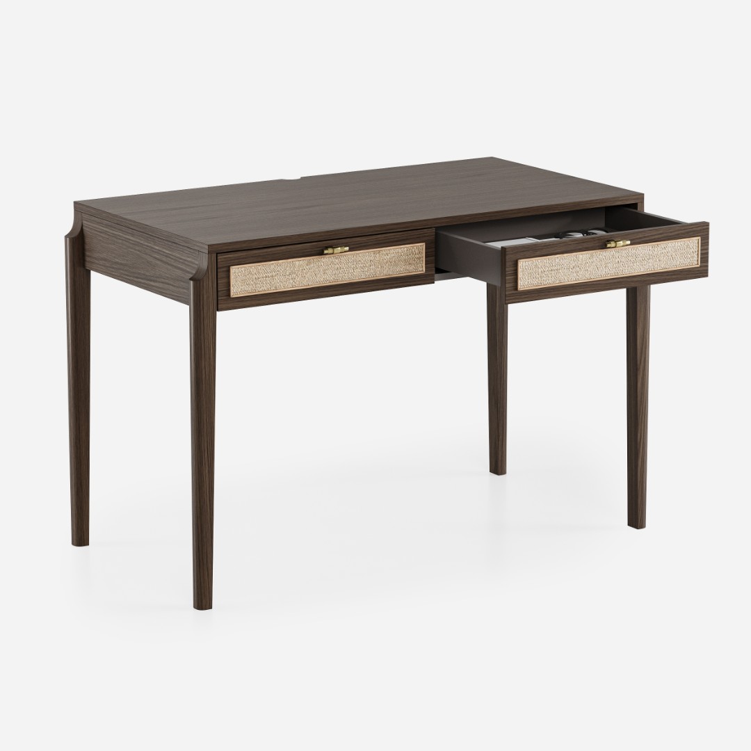 В основе дизайна коллекции Vishera – оригинальный фасадный декор, выполненный из натурального ротангового полотна. Естественная плетеная фактура ротанга придает мебели легкое очарование, свойственное традиционным ремесленным техникам, а природные текстуры и натуральные оттенки отделки создают неповторимую гармонию, теплоту и уют. Коллекция Vishera - это гармония натуральных текстур, легкости и мягкого минимализма. Мебель из коллекции органично дополнит ваш интерьер, будь то скандинавский стиль, soft-minimal, japandi или даже бохо.  Эргономика стола разработана таким образом, чтобы работать за ним было максимально комфортно. Пространство для ног позволяет комфортно сидеть даже человеку с ростом до 195см.Два неглубоких, но вместительных ящика позволят разместить в них книги, ноутбук, планшет, альбом для рисования, канцелярские принадлежности, оставив таким образом рабочую поверхность стола свободной и удобной для работы.