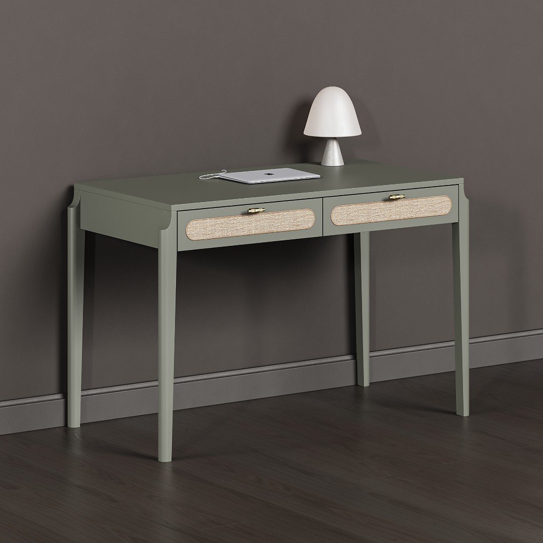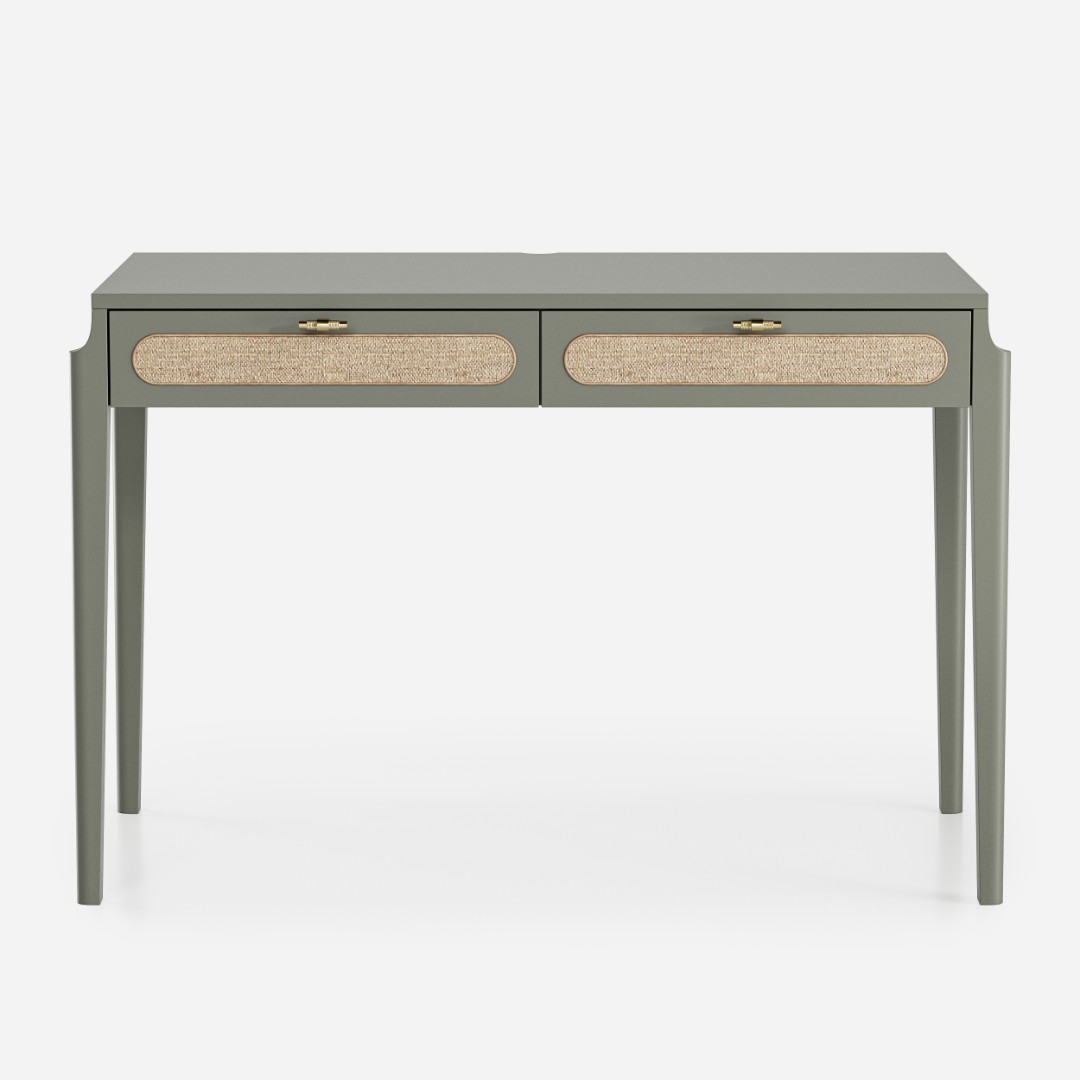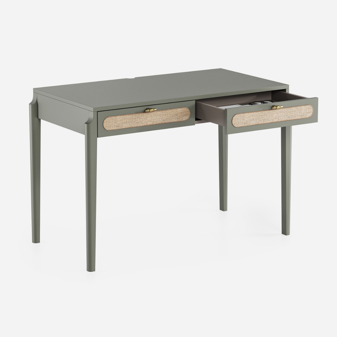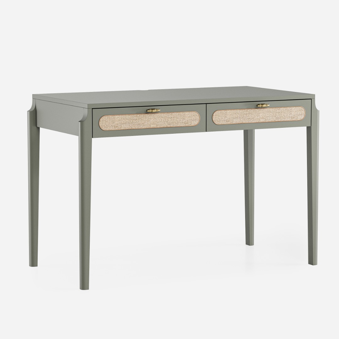 В основе дизайна коллекции Vishera – оригинальный фасадный декор, выполненный из натурального ротангового полотна. Естественная плетеная фактура ротанга придает мебели легкое очарование, свойственное традиционным ремесленным техникам, а природные текстуры и натуральные оттенки отделки создают неповторимую гармонию, теплоту и уют. Коллекция Vishera - это гармония натуральных текстур, легкости и мягкого минимализма. Мебель из коллекции органично дополнит ваш интерьер, будь то скандинавский стиль, soft-minimal, japandi или даже бохо.  Эргономика стола разработана таким образом, чтобы работать за ним было максимально комфортно. Пространство для ног позволяет комфортно сидеть даже человеку с ростом до 195см.Два неглубоких, но вместительных ящика позволят разместить в них книги, ноутбук, планшет, альбом для рисования, канцелярские принадлежности, оставив таким образом рабочую поверхность стола свободной и удобной для работы.