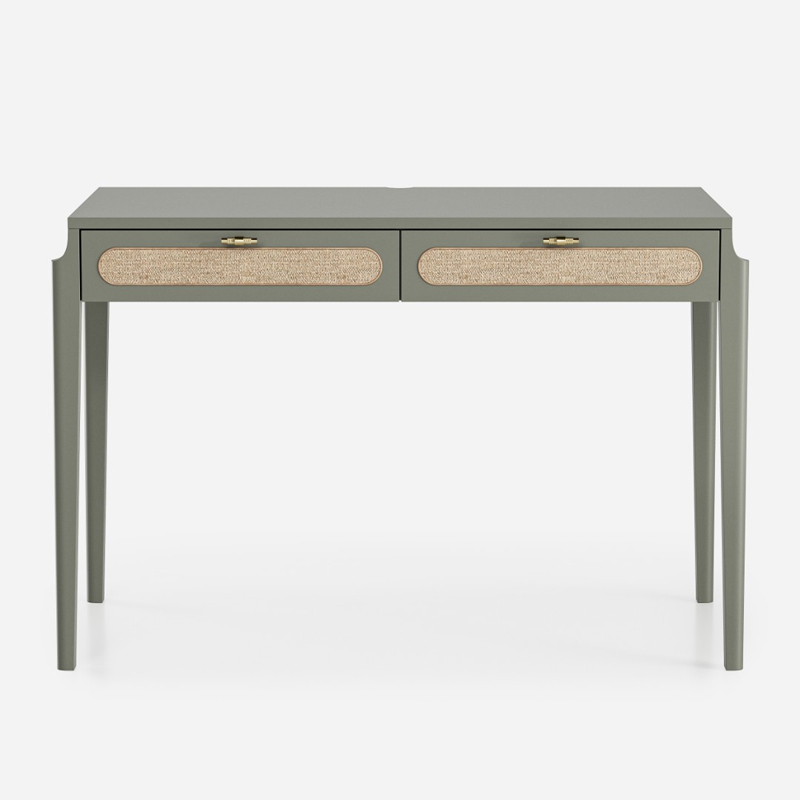 В основе дизайна коллекции Vishera – оригинальный фасадный декор, выполненный из натурального ротангового полотна. Естественная плетеная фактура ротанга придает мебели легкое очарование, свойственное традиционным ремесленным техникам, а природные текстуры и натуральные оттенки отделки создают неповторимую гармонию, теплоту и уют. Коллекция Vishera - это гармония натуральных текстур, легкости и мягкого минимализма. Мебель из коллекции органично дополнит ваш интерьер, будь то скандинавский стиль, soft-minimal, japandi или даже бохо.  Эргономика стола разработана таким образом, чтобы работать за ним было максимально комфортно. Пространство для ног позволяет комфортно сидеть даже человеку с ростом до 195см.Два неглубоких, но вместительных ящика позволят разместить в них книги, ноутбук, планшет, альбом для рисования, канцелярские принадлежности, оставив таким образом рабочую поверхность стола свободной и удобной для работы.