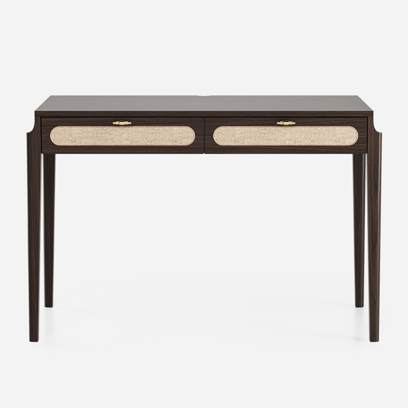 В основе дизайна коллекции Vishera – оригинальный фасадный декор, выполненный из натурального ротангового полотна. Естественная плетеная фактура ротанга придает мебели легкое очарование, свойственное традиционным ремесленным техникам, а природные текстуры и натуральные оттенки отделки создают неповторимую гармонию, теплоту и уют. Коллекция Vishera - это гармония натуральных текстур, легкости и мягкого минимализма. Мебель из коллекции органично дополнит ваш интерьер, будь то скандинавский стиль, soft-minimal, japandi или даже бохо.  Эргономика стола разработана таким образом, чтобы работать за ним было максимально комфортно. Пространство для ног позволяет комфортно сидеть даже человеку с ростом до 195см.Два неглубоких, но вместительных ящика позволят разместить в них книги, ноутбук, планшет, альбом для рисования, канцелярские принадлежности, оставив таким образом рабочую поверхность стола свободной и удобной для работы.