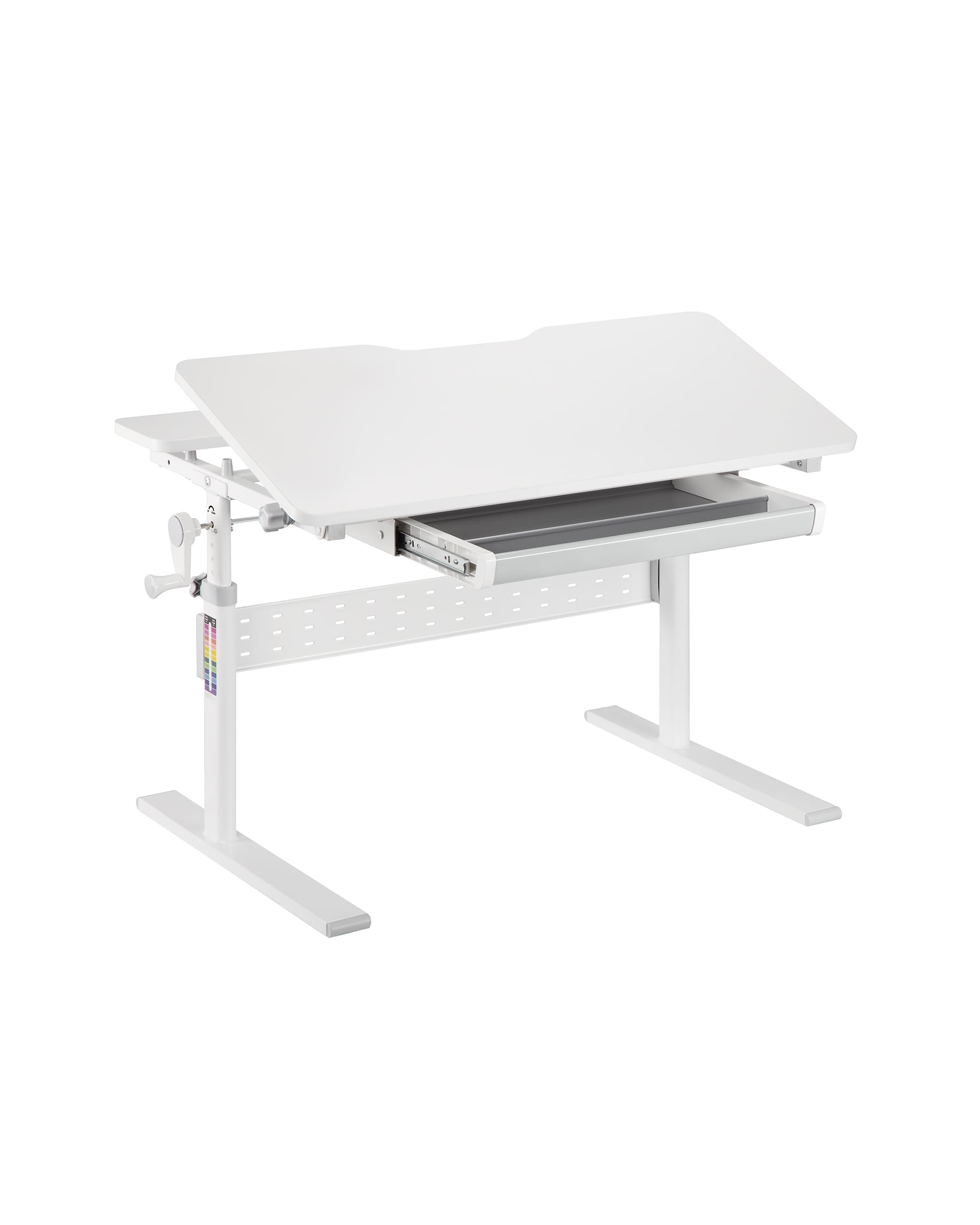 В столешницу встроен выдвижной ящик с несколькими отделами, куда удобно складывать тетради, альбомы и канцелярию.