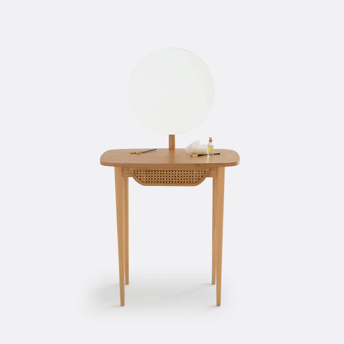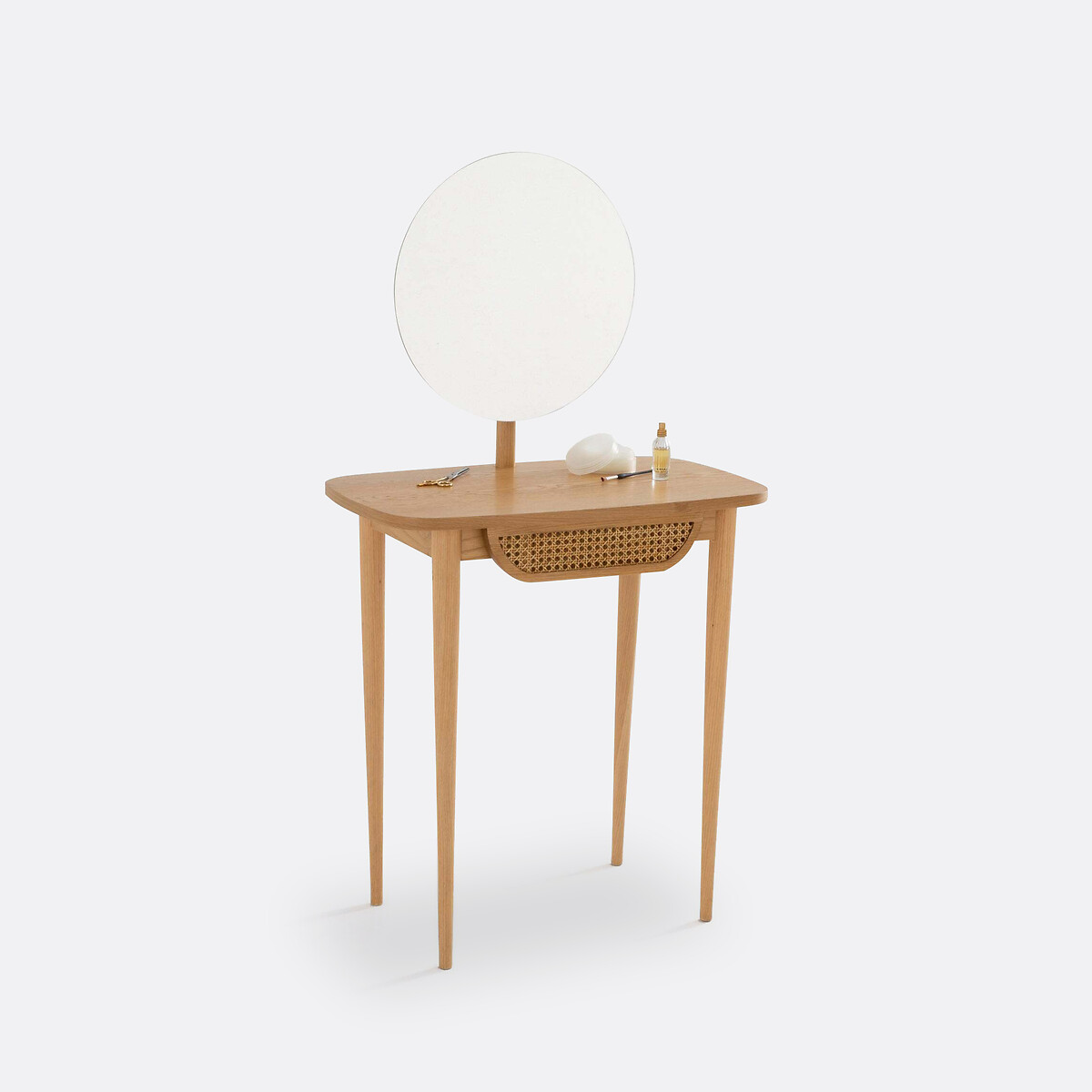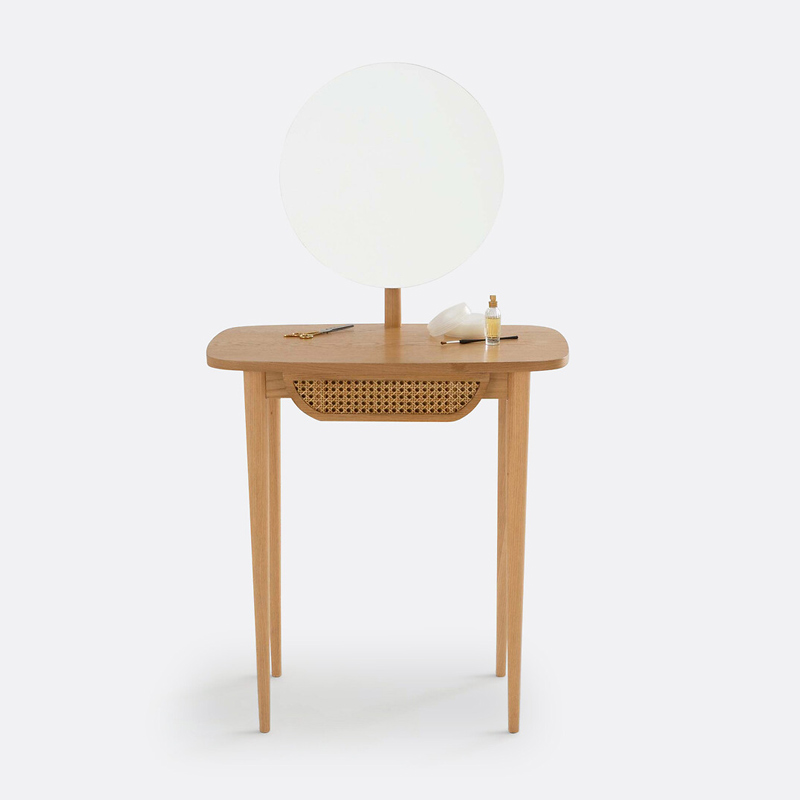Запросить индивидуальное предложениеИзящная конструкция на тонких прочных ножках выполнена из дерева и натурального плетеного ротанга, который придает общей истории особый шик. Модель дополнена зеркалом, в котором мир отражается по-особенному -- светлым, ярким и добрым. Дополните туалетным столиком свой будуар, чтобы начинать новый день на волне комфорта, заряжаюсь энергией и бодростью.