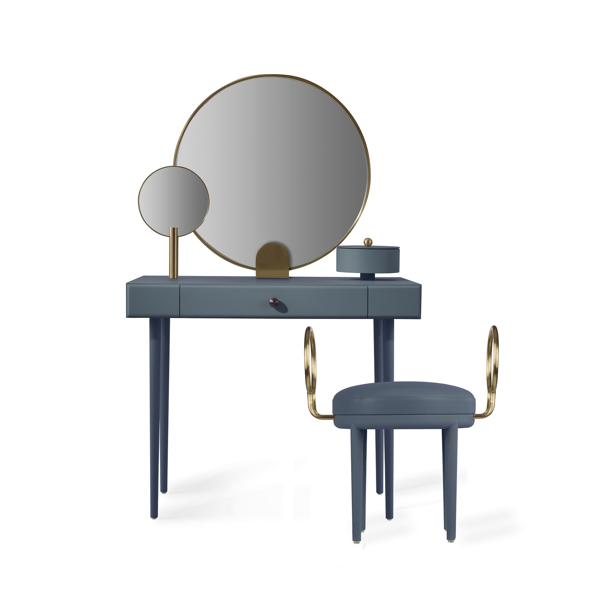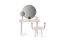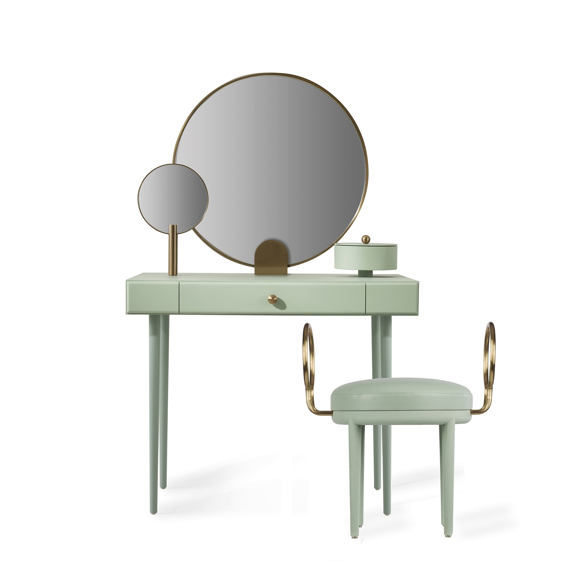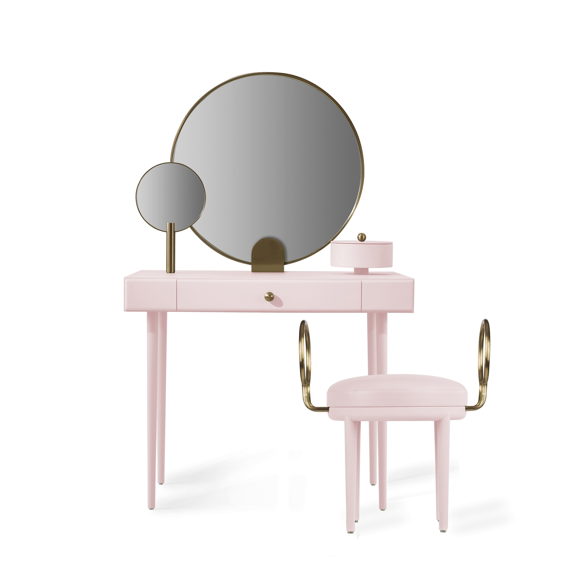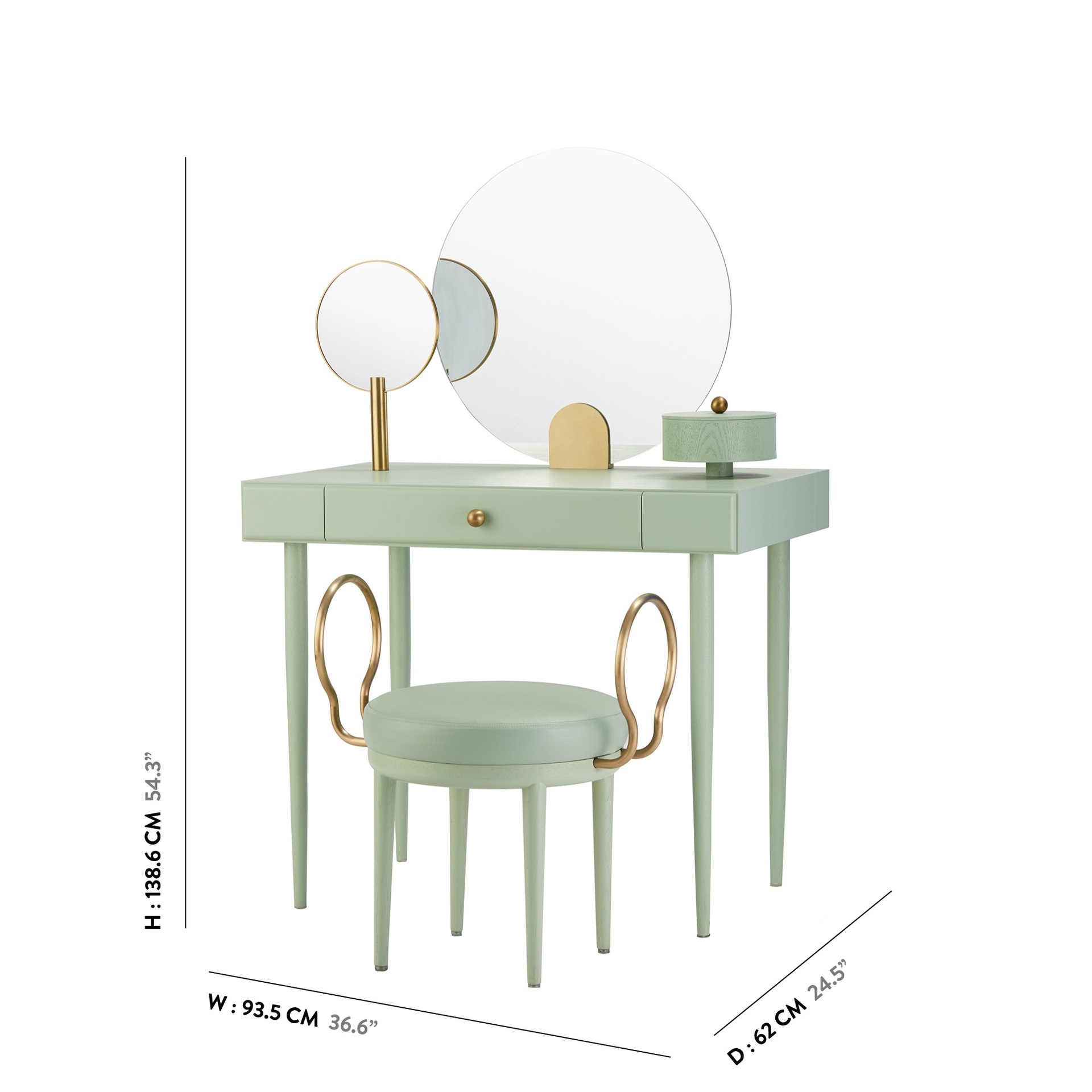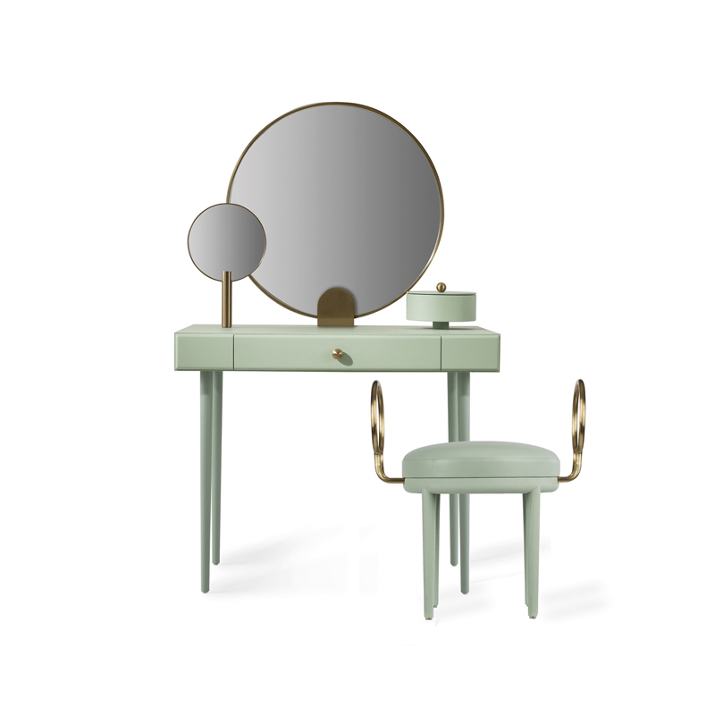 На столе есть изящно оформленная шкатулка для драгоценностей, внушительное круглое зеркало в центре, а также зеркало меньшего размера, которое можно отделить от туалетного столика и затем использовать в качестве ручного зеркала.