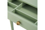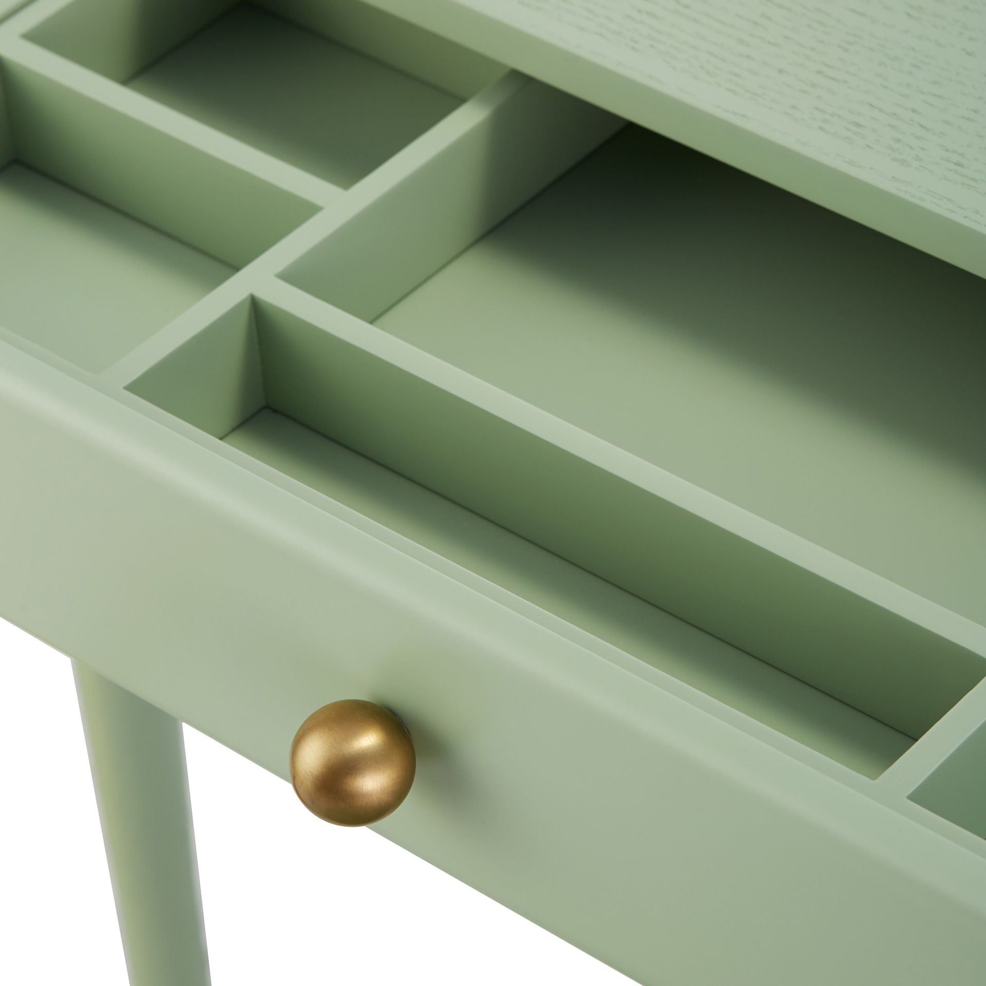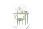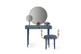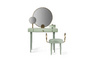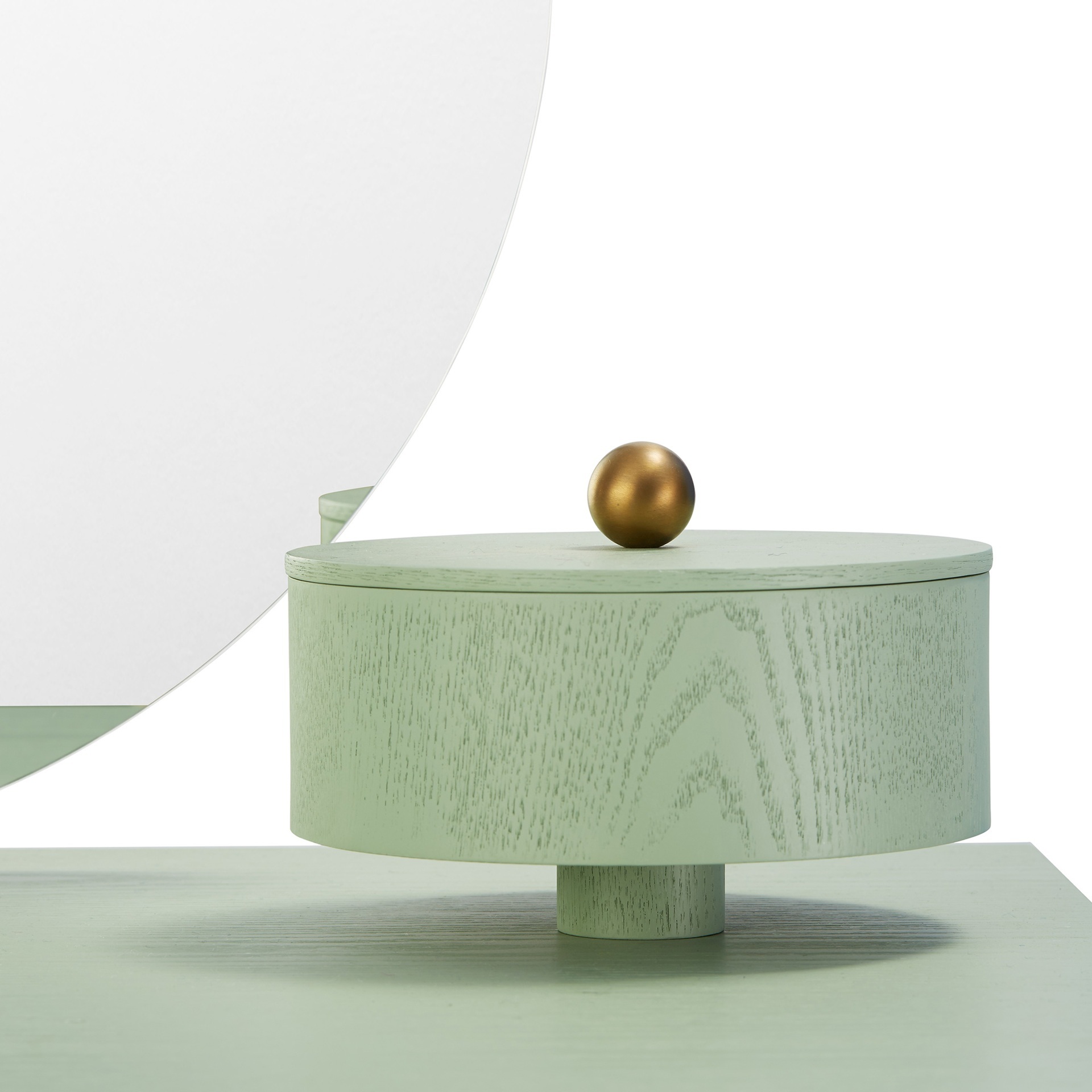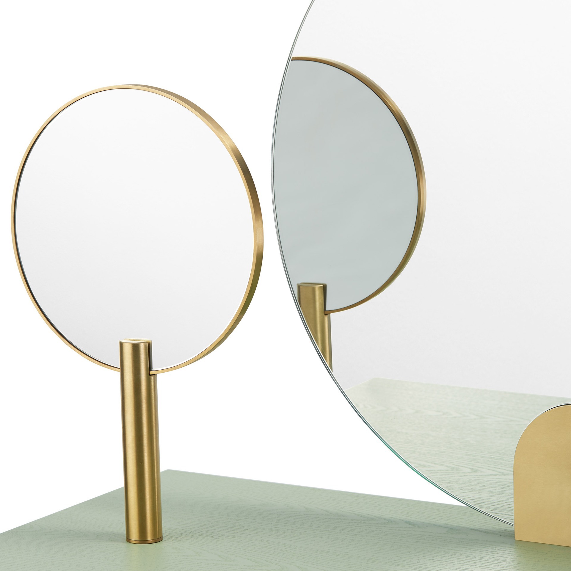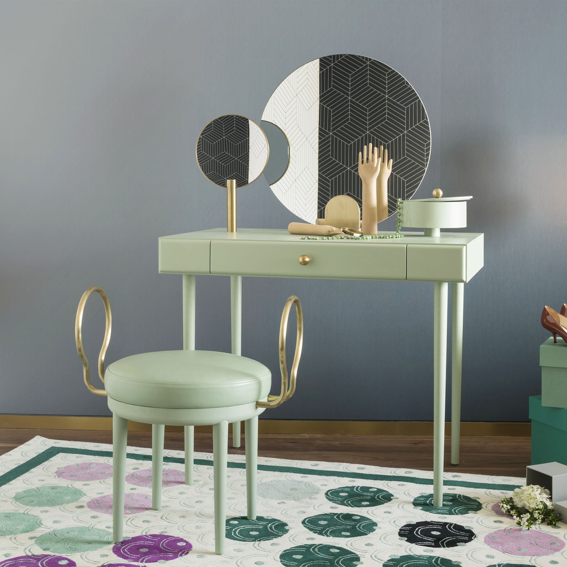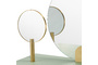 На столе есть изящно оформленная шкатулка для драгоценностей, внушительное круглое зеркало в центре, а также зеркало меньшего размера, которое можно отделить от туалетного столика и затем использовать в качестве ручного зеркала.