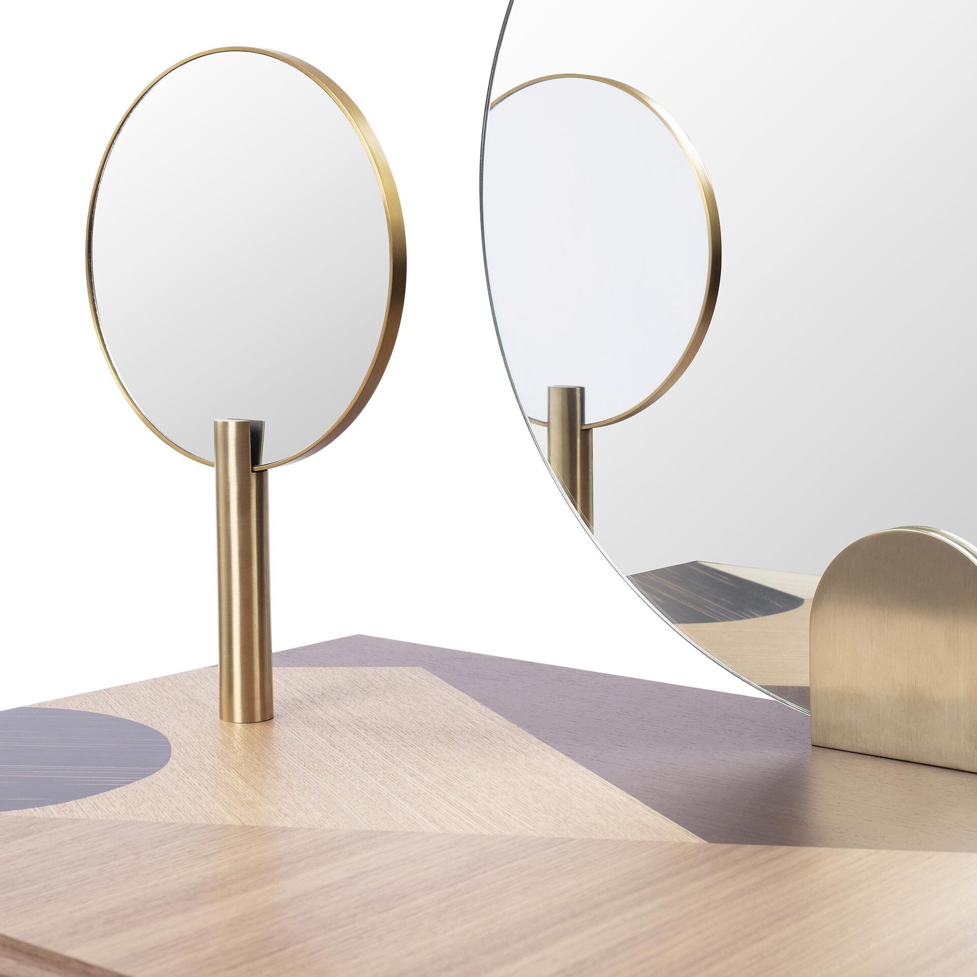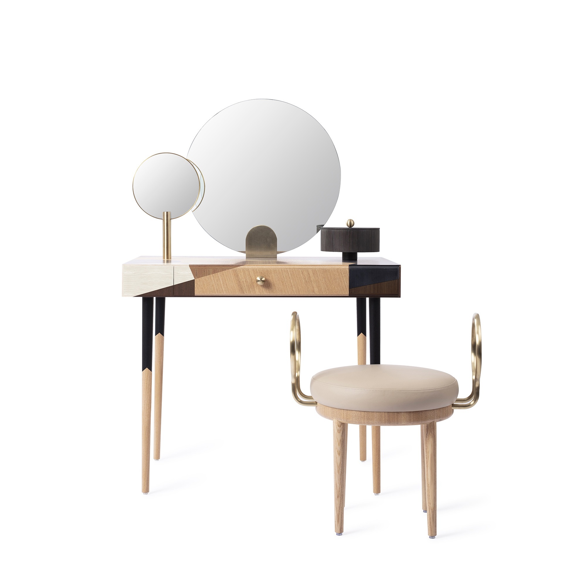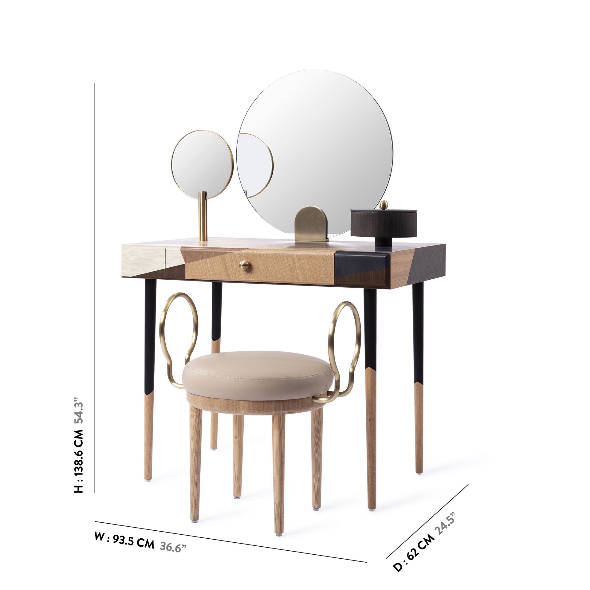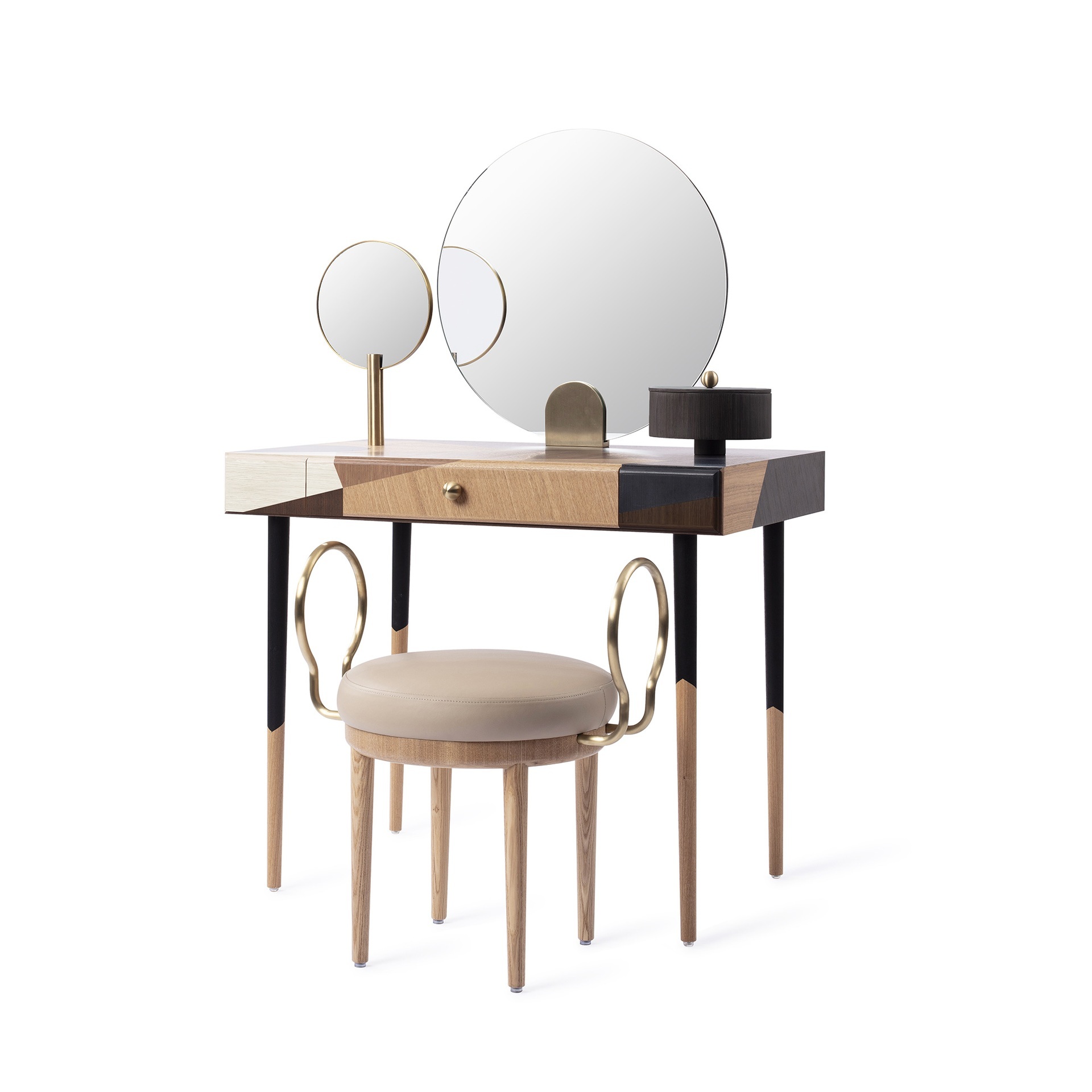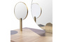 На столе есть изящно оформленная шкатулка для драгоценностей, внушительное круглое зеркало в центре, а также зеркало меньшего размера, которое можно отделить от туалетного столика и затем использовать в качестве ручного зеркала.
