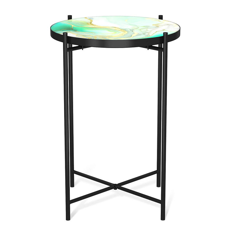 Столешница выполнена из закаленного стекла с ультрафиолетовой печатью. Закаленное стекло разбить случайно практически невозможно. Кромка столешницы обработана для абсолютно безопасного использования. Металлический каркас окрашен порошковой краской, устойчивой к механическому воздействию. Выполнен из трубы 12 мм и металлического листа. Диаметр столешницы 350 мм.