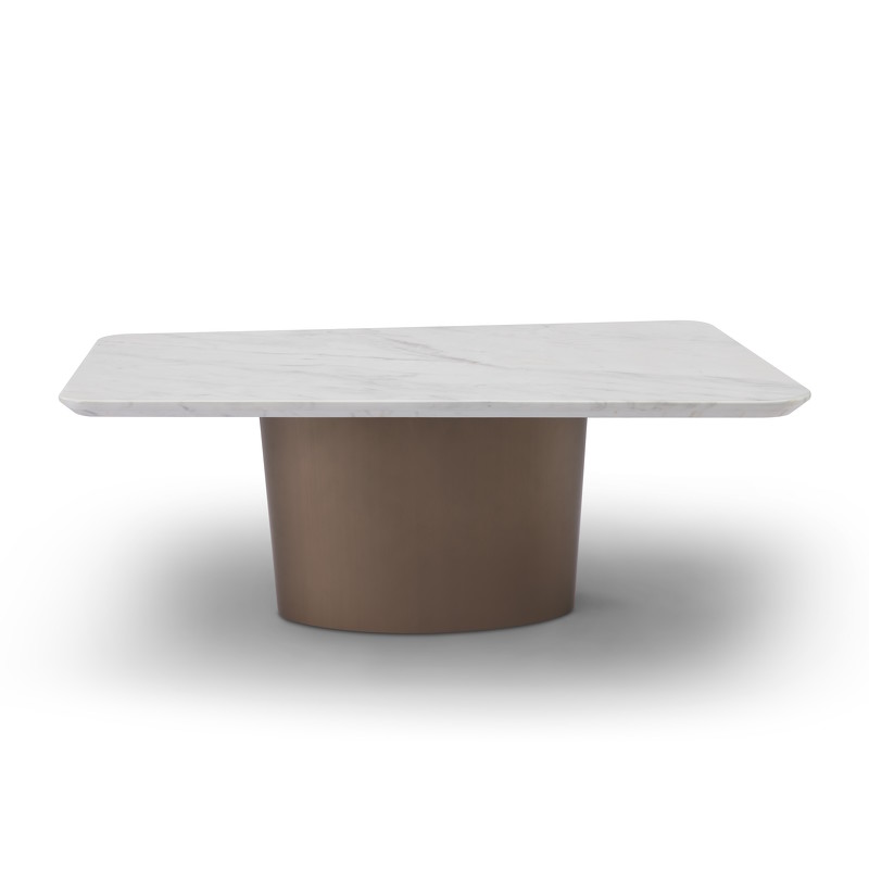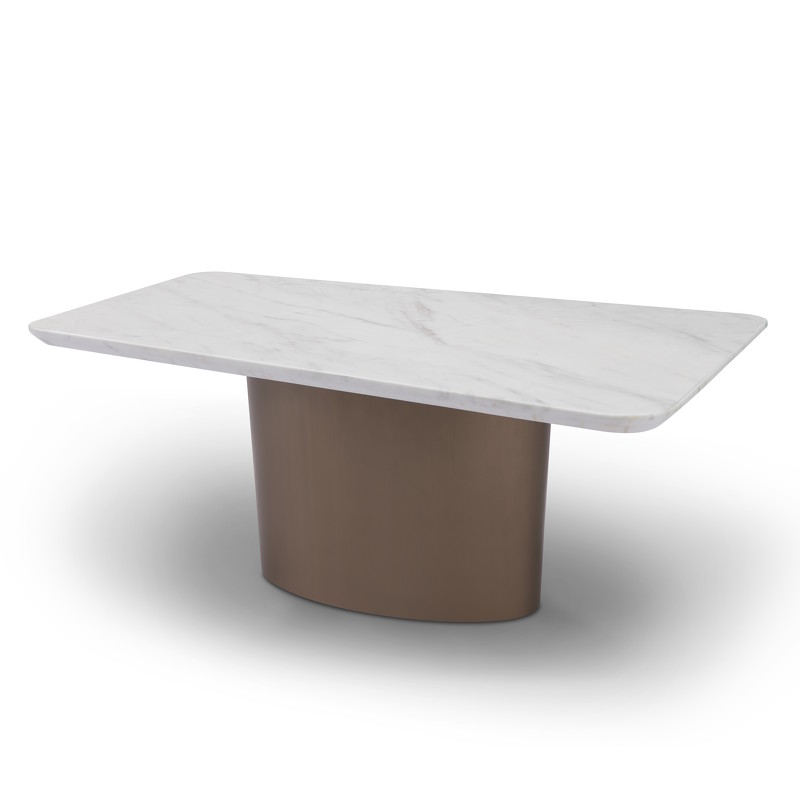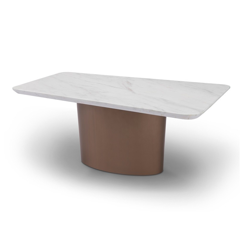 Столик выполнен из высококачественного МДФ высокой плотности. Столешница выполнена из белого мрамора, с матовой белой нижней панелью. Основание в отделке цвета латунь.