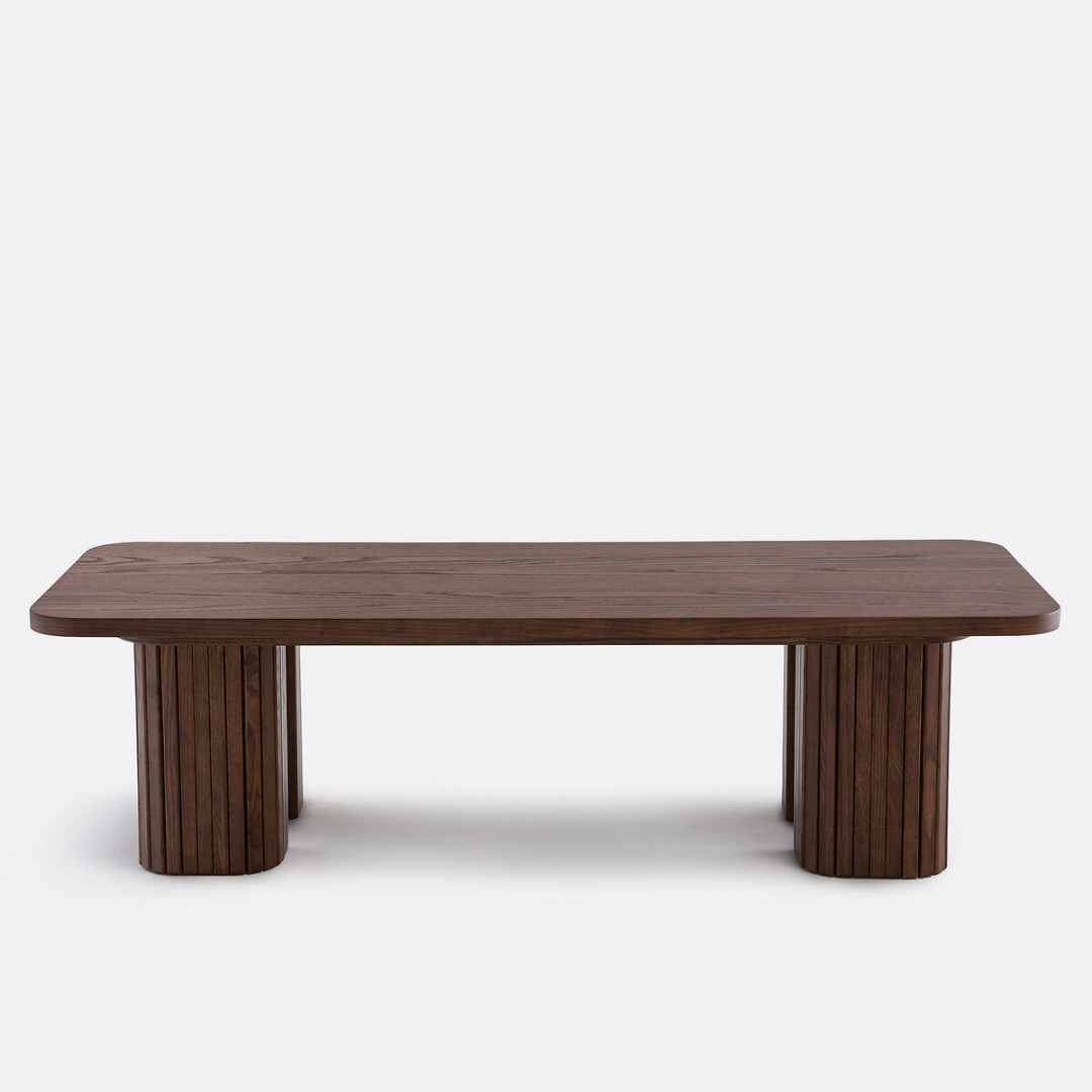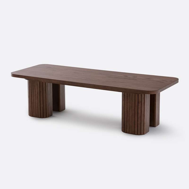 "Журнальный столик Latti выделяется своими простыми, округлыми и элегантными линиями. Деревянные планки украшают широкие ножки, создавая графическую линию, добавляя изгибы и ритм."
