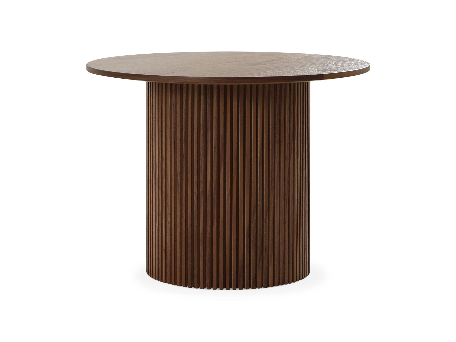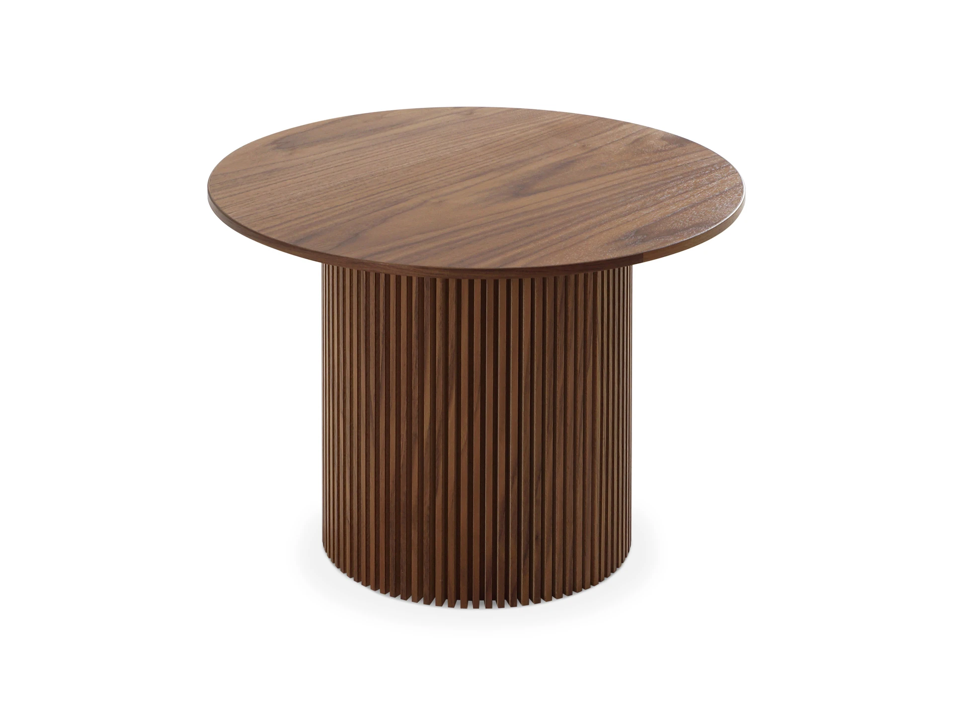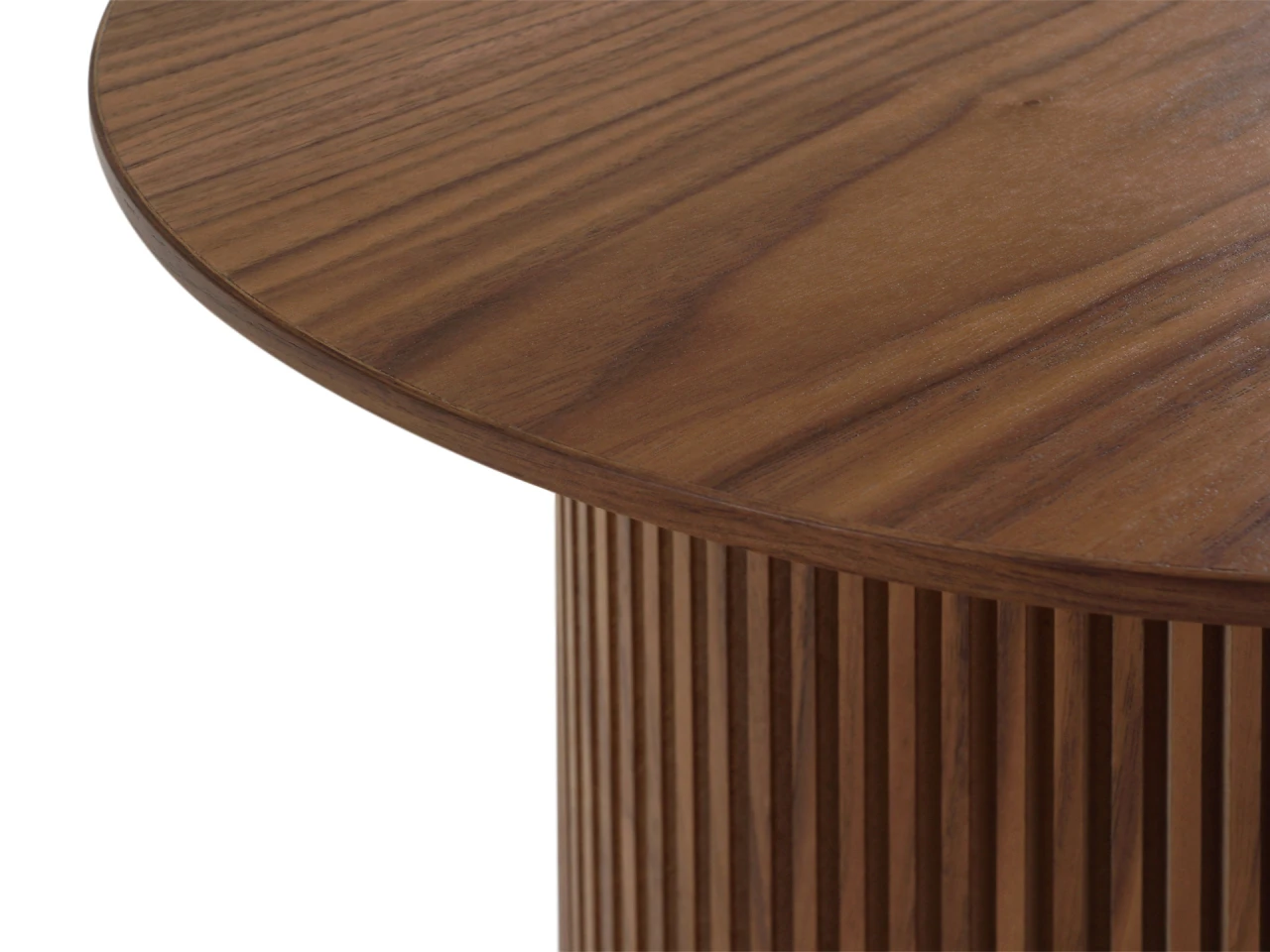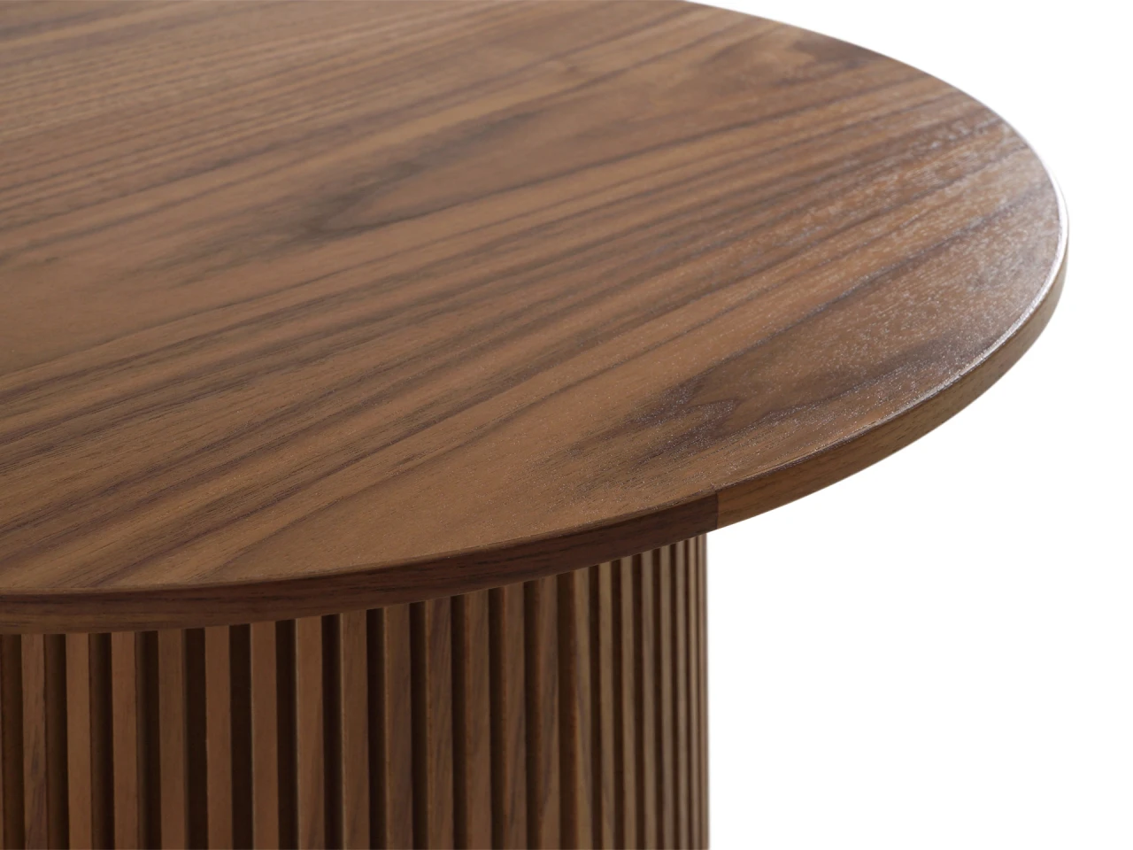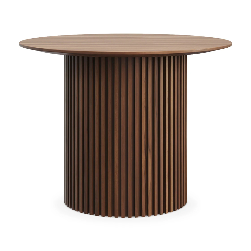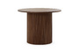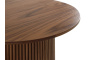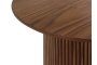 Дизайн сфокусирован на контрастном взаимодействие фактур. Цилиндрическое основание с «гофрированной поверхностью» поддерживает гладкую круглую столешницу. Рельефные углубления на ножке придают динамичности, выразительности, эффектности. С этим столиком можно создавать вариативные интерьерные комбинации, которые подчеркнут индивидуальный характер пространства. Красивый естественный рисунок внесёт в пространство частичку природной энергии. Уместен будет в любой локации от диванной зоны до спальни.