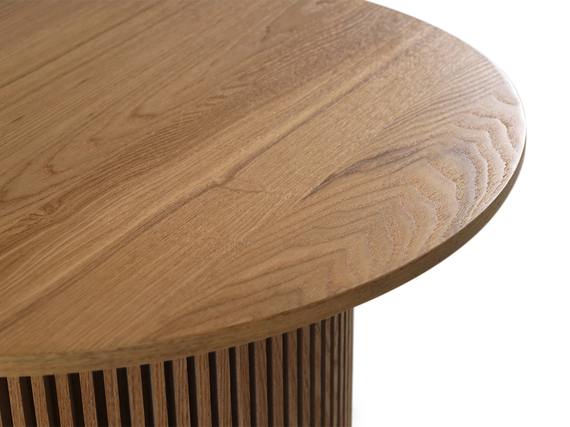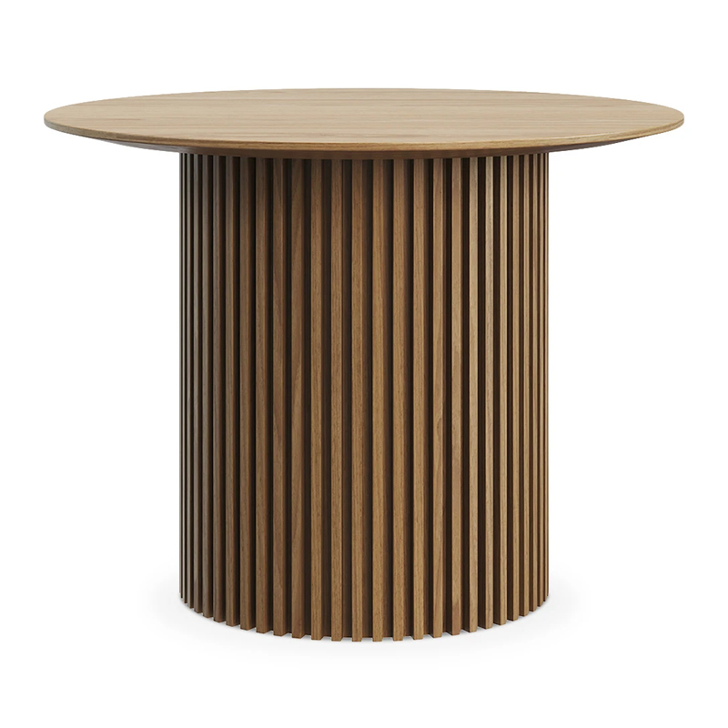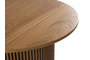 Дизайн сфокусирован на контрастном взаимодействие фактур. Цилиндрическое основание с «гофрированной поверхностью» поддерживает гладкую круглую столешницу. Рельефные углубления на ножке придают динамичности, выразительности, эффектности. С этим столиком можно создавать вариативные интерьерные комбинации, которые подчеркнут индивидуальный характер пространства. Красивый естественный рисунок внесёт в пространство частичку природной энергии. Уместен будет в любой локации от диванной зоны до спальни.