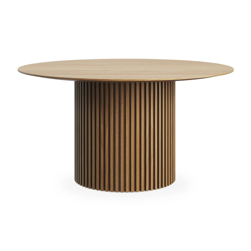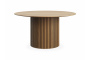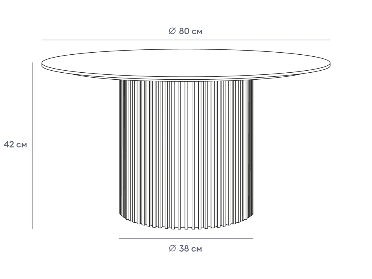 Дизайн сфокусирован на контрастном взаимодействие фактур. Цилиндрическое основание с «гофрированной поверхностью» поддерживает гладкую круглую столешницу. Рельефные углубления на ножке придают динамичности, выразительности, эффектности. С этим столиком можно создавать вариативные интерьерные комбинации, которые подчеркнут индивидуальный характер пространства. Красивый естественный рисунок внесёт в пространство частичку природной энергии. Уместен будет в любой локации от диванной зоны до спальни.