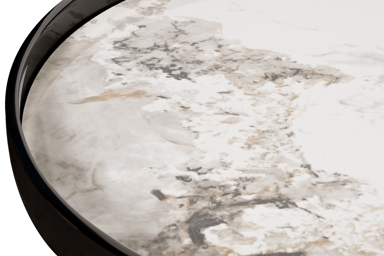 Запросить индивидуальное предложениеСтолешница из глянцевого прессованного камня (разновидность керамогранита) с узором под белый мрамор, основание из нерж.стали цвета черный хром Толщина столешницы - 10мм.