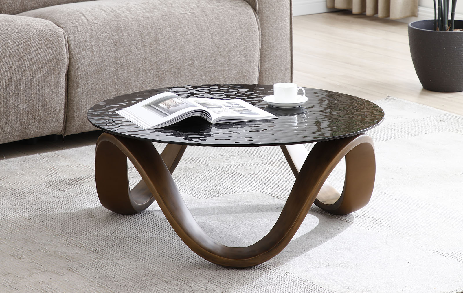 Стекло эффектно отражает свет, создавая игру бликов и придавая интерьеру глубину и изысканность. Оригинальное основание из стекловолокна с волнообразными формами подчёркивает выразительность стекла и делает этот столик настоящим арт-объектом в гостиной.
