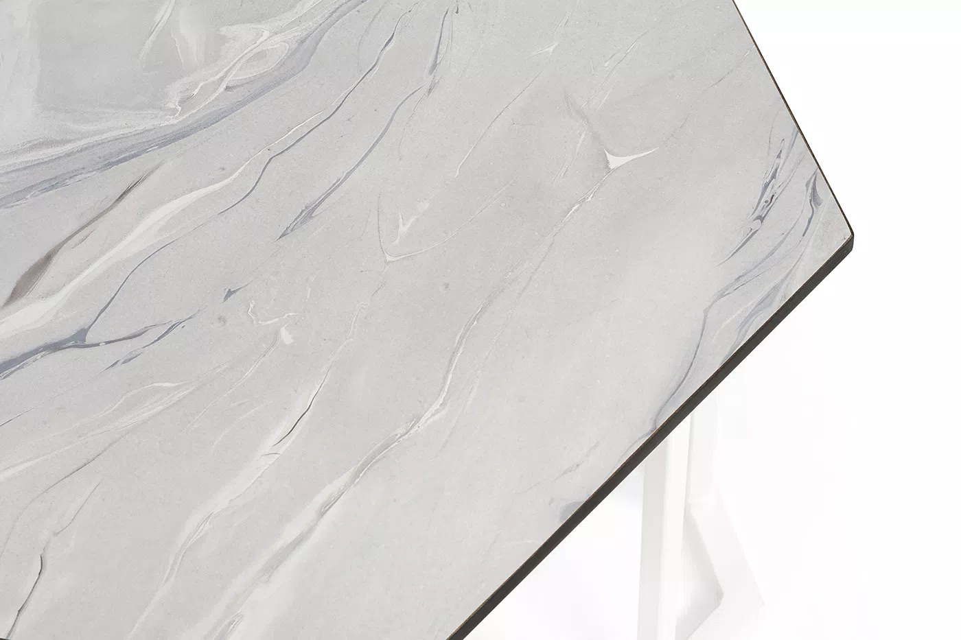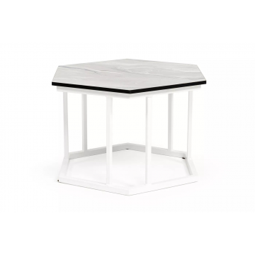 "Женева" интерьерный стол из HPL шестиугольный, D50, H35, цвет "мрамор пепел", каркас из стали белый муар