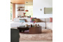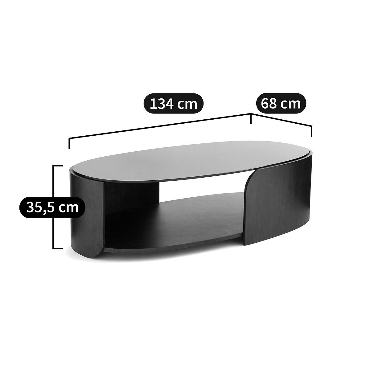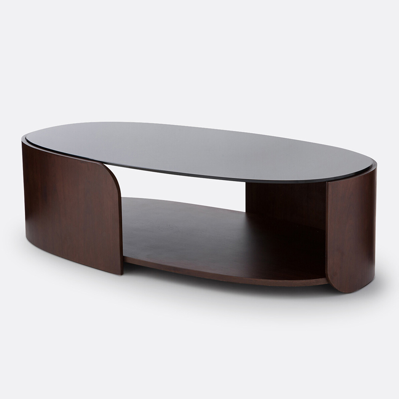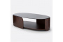 • Журнальный стол из МДФ, шпонированной ореховым деревом, с НЦ-лакировкой, со столешницей из тонированного закаленного стекла.