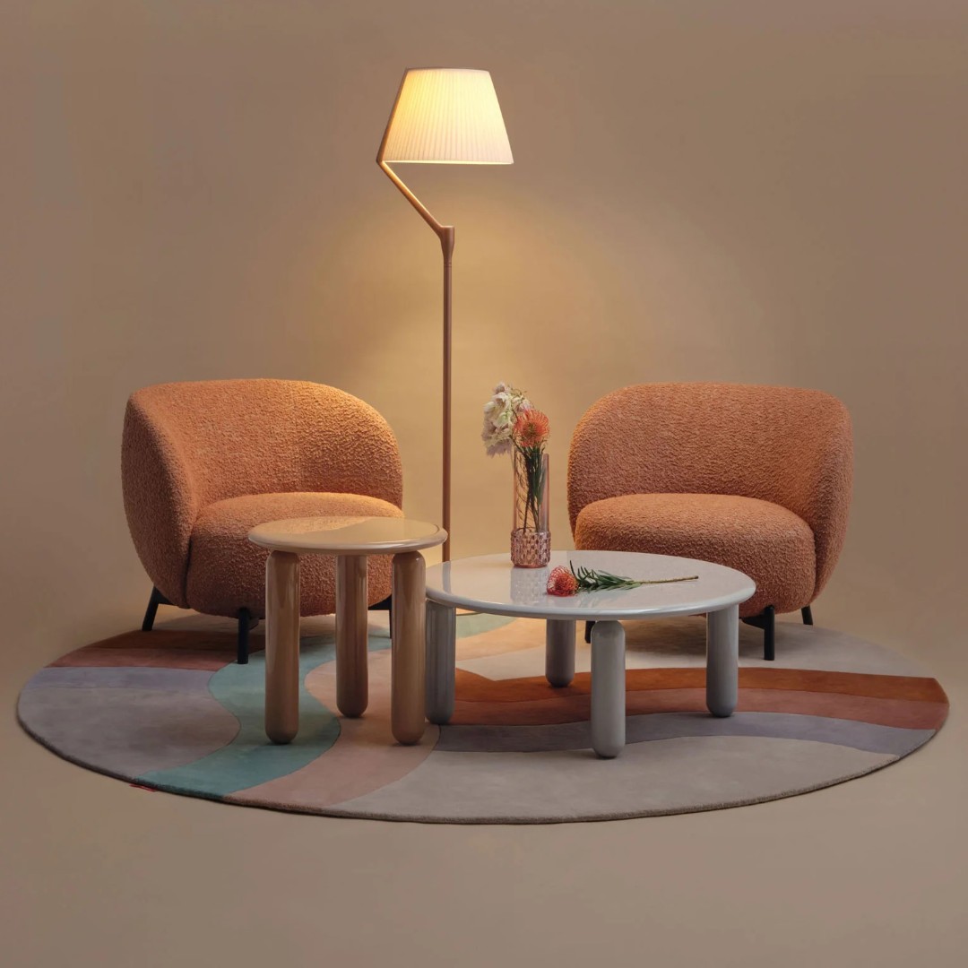 Новая интерпретация журнальных столиков от Патрисии Уркиолы с округлой постмодернистской эстетикой, как раз подходящей для создания расслабленного настроения. Благодаря столешницам разного размера и высоты столики могут быть расставлены и переставлены в удобном порядке как это требуется.