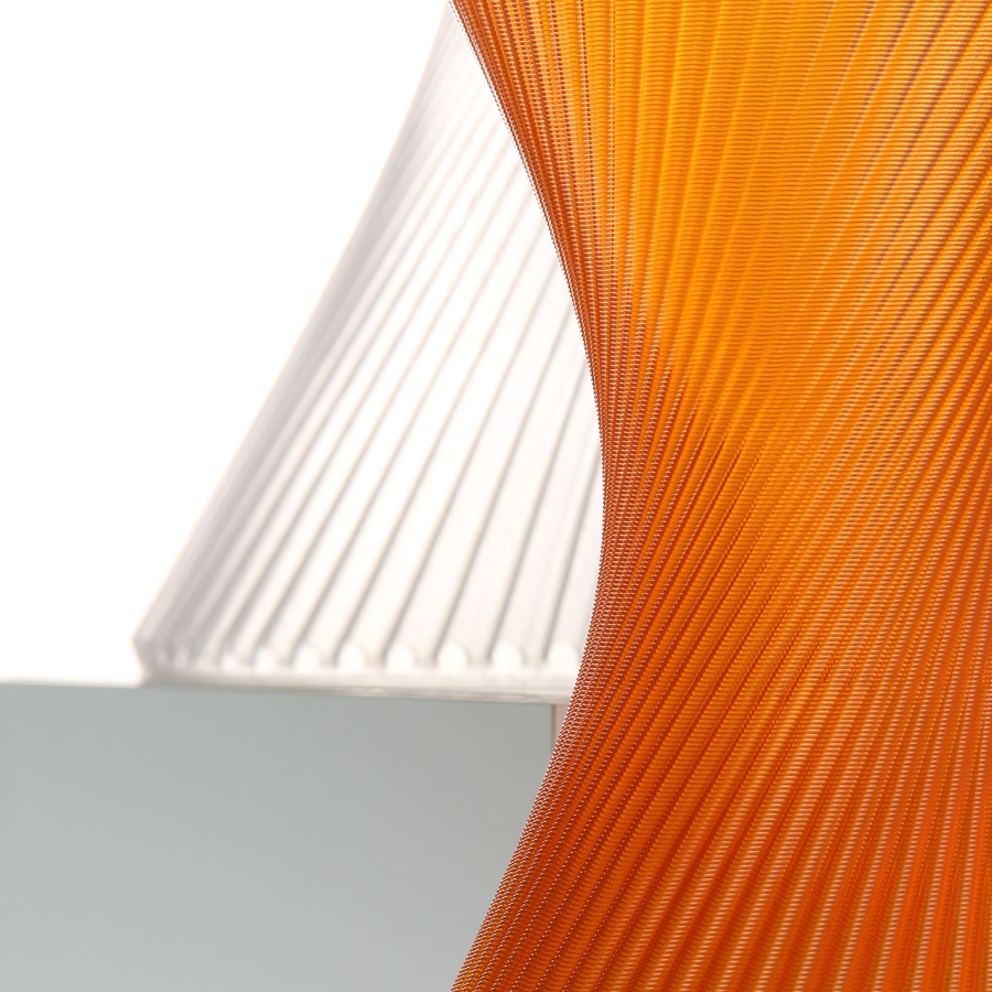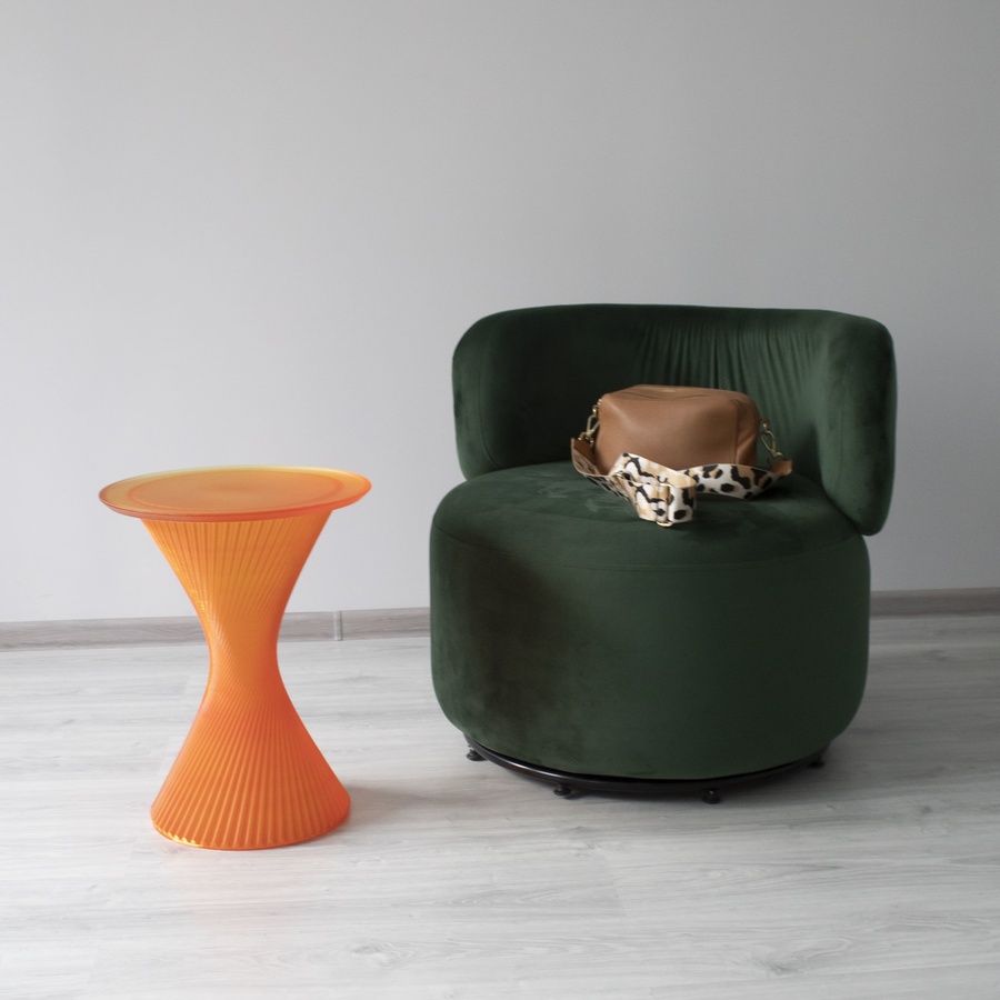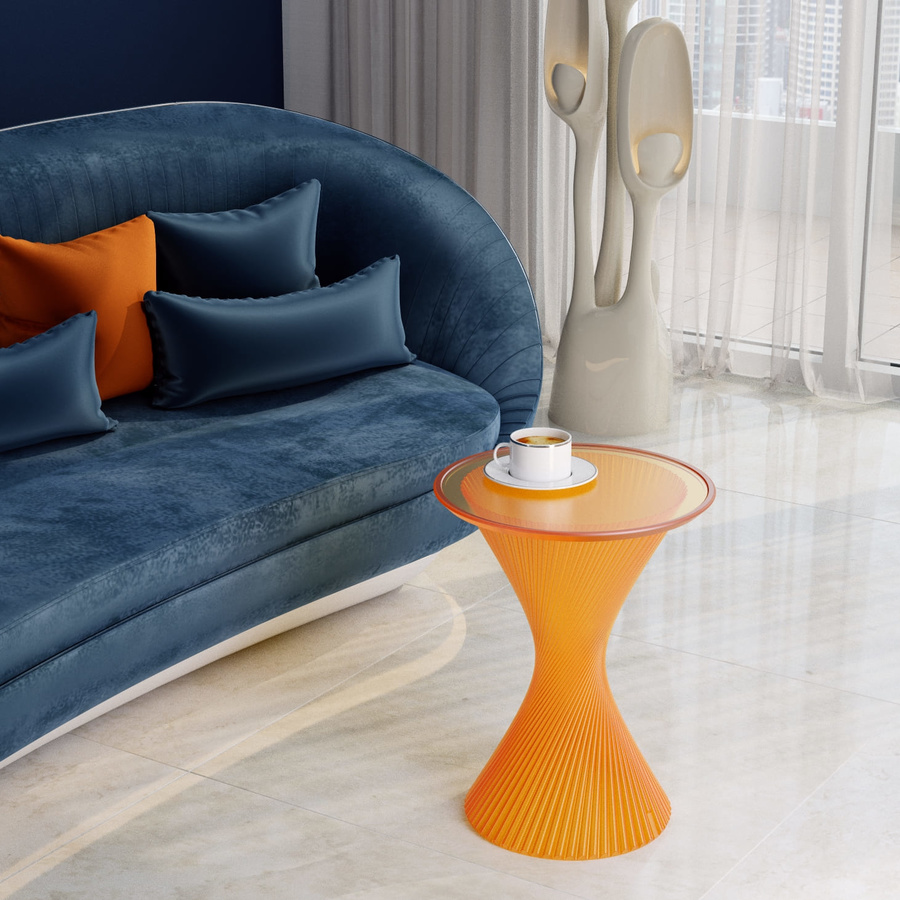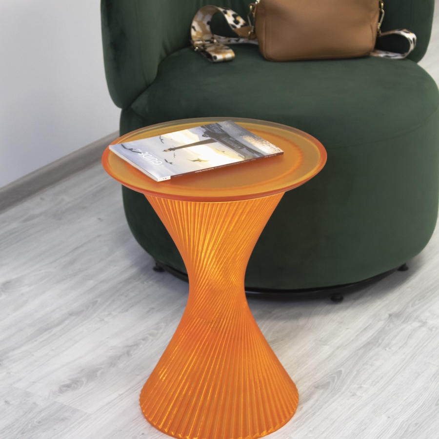 Благодаря использованию стекловидного материала, лучи проходящего света создают необыкновенную игру бликов, и делают столик визуально лёгким, не перегружая пространство.
