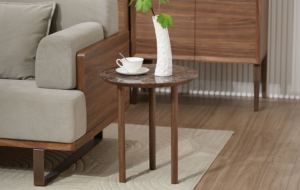 Запросить индивидуальное предложениеЖурнальный столик Candy (Кэнди) — стильный и лаконичный акцент для современной гостиной, лаунж-зоны или уютного уголка отдыха. Столешница выполнена из стекла с выразительным мраморным рисунком и лёгким глянцевым блеском, который подчёркивает глубину цвета и создаёт эффект настоящего мрамора. Стекло обеспечивает гигиеничность и легкое очищение от загрязнений. Основание — три тонкие ножки из дерева, гармонично сочетаются с мраморным рисунком столешницы и добавляют интерьеру нотку уюта и натуральности.