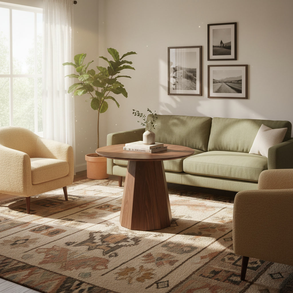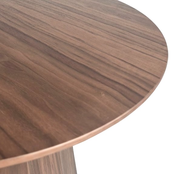 Столешница диаметром 580 мм выполнена из натурального шпона американского ореха. Толщина столешницы составляет 20 мм, однако благодаря аккуратно выполненной фаске она визуально воспринимается значительно тоньше — создаётся ощущение лёгкого, почти парящего объёма.