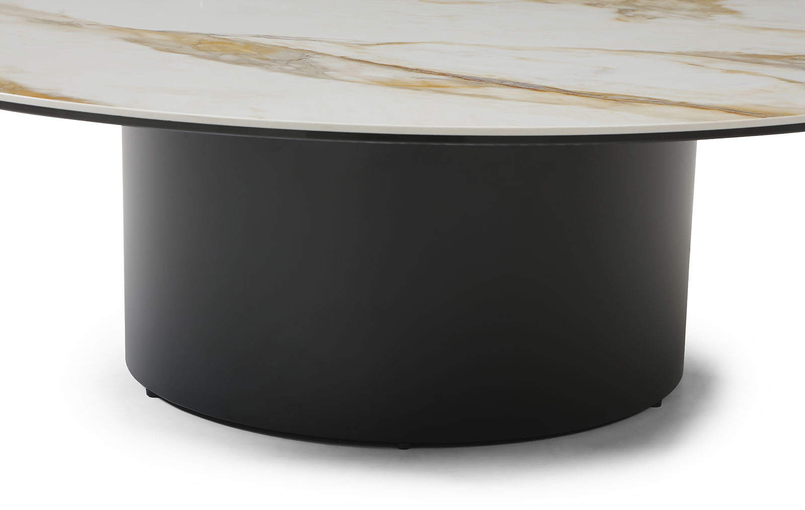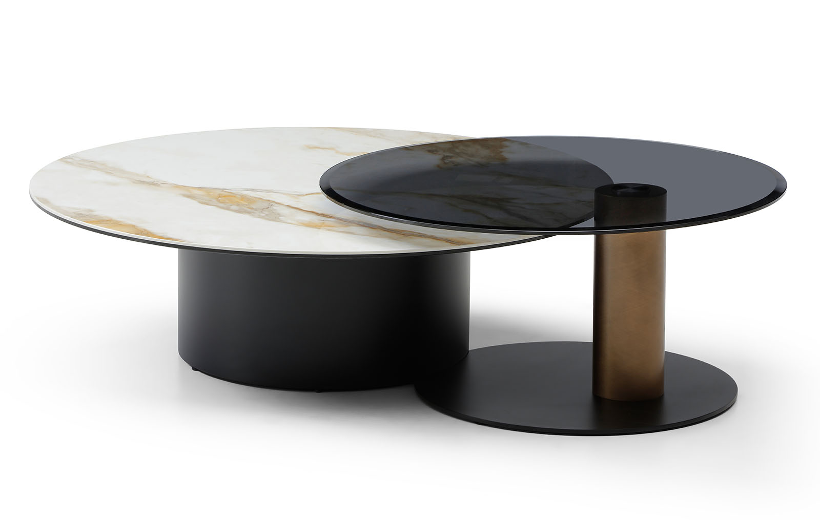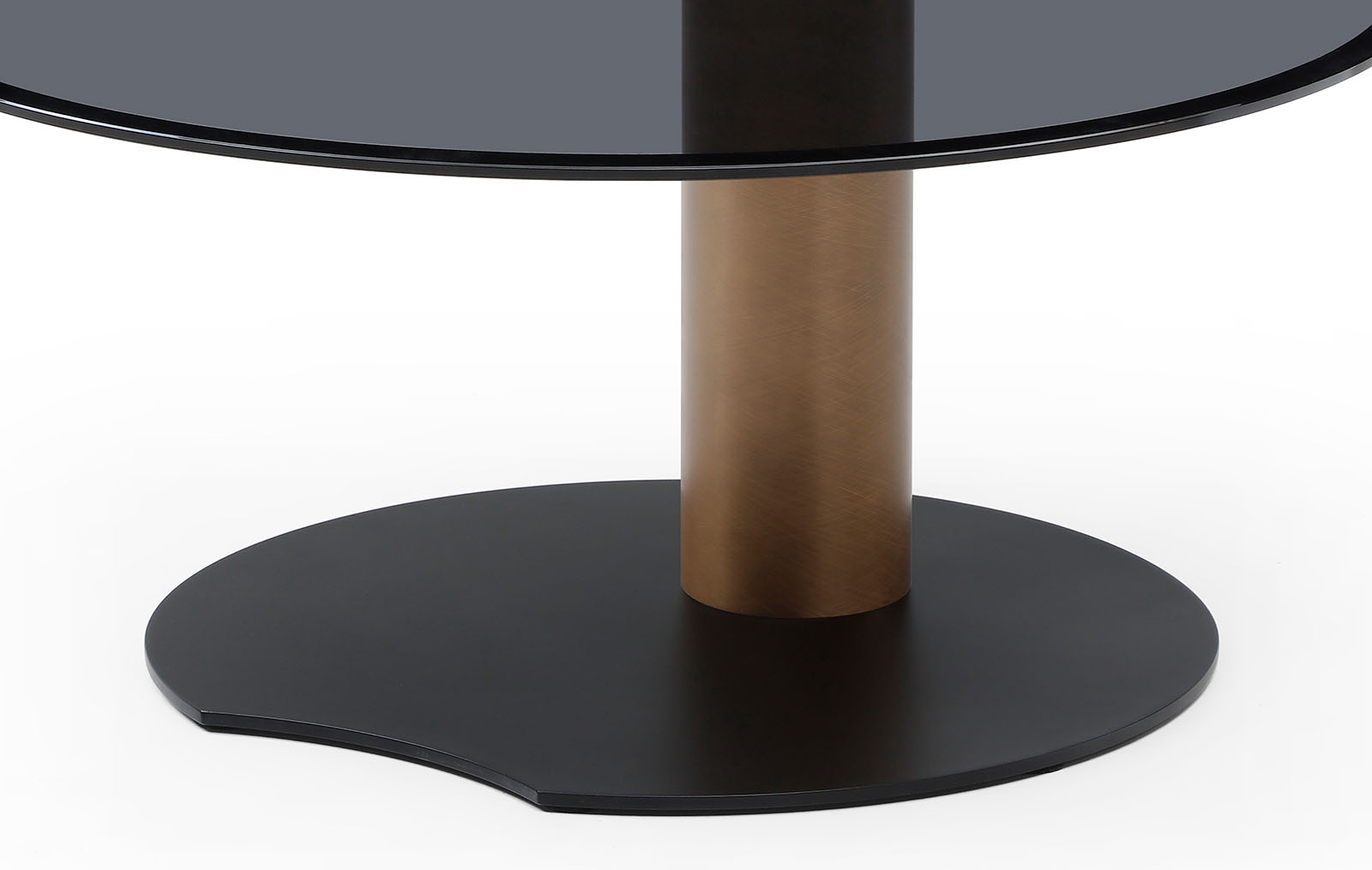 Металлические подстолья разной формы и высоты придают набору динамику и архитектурную выразительность. Сочетание чёрного цвета и бронзы добавляет интерьеру глубину и современную элегантность.