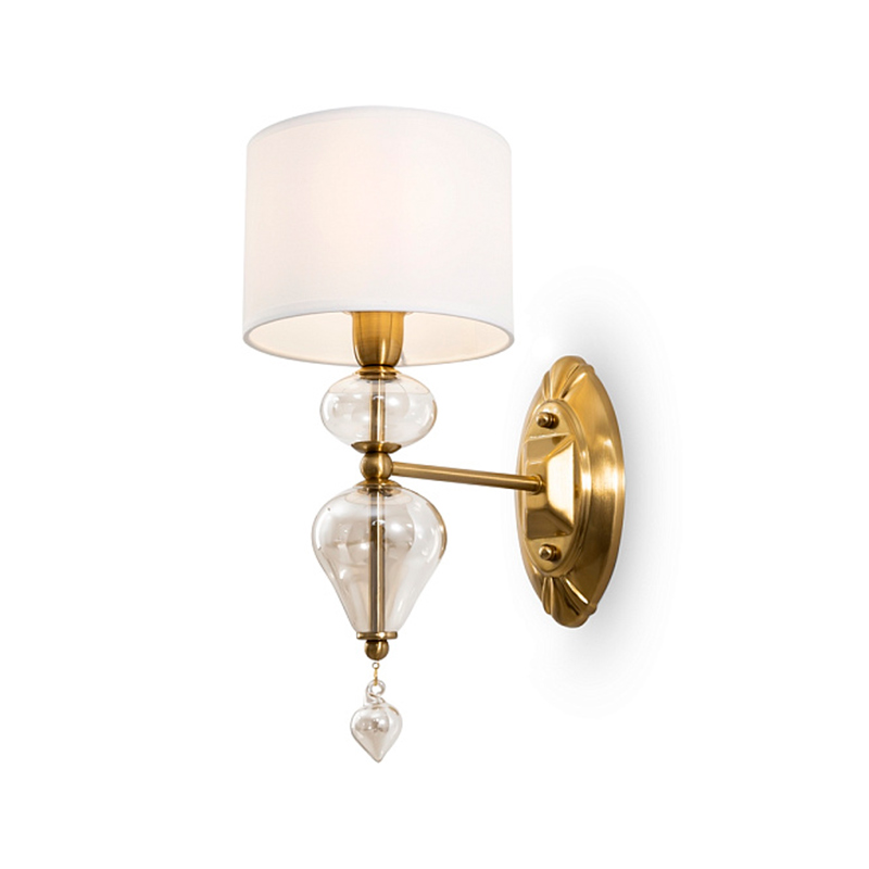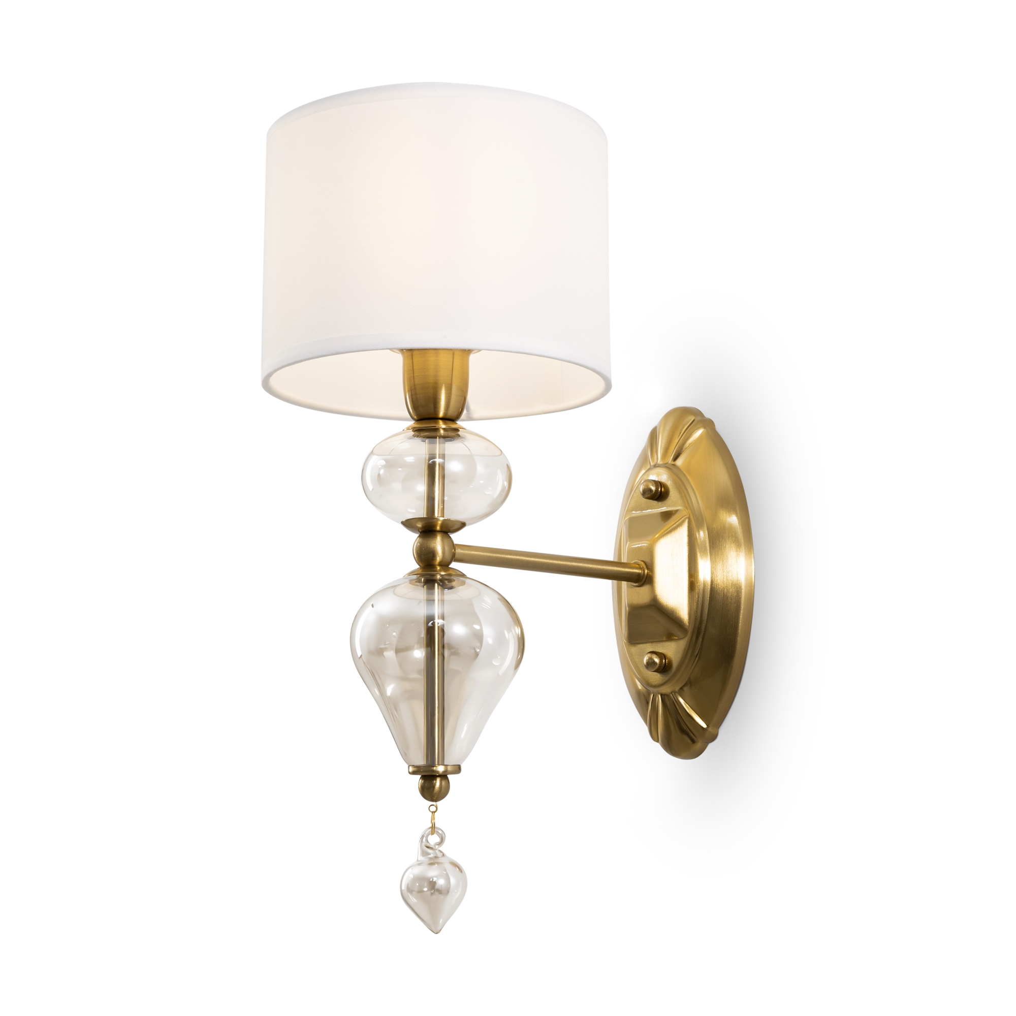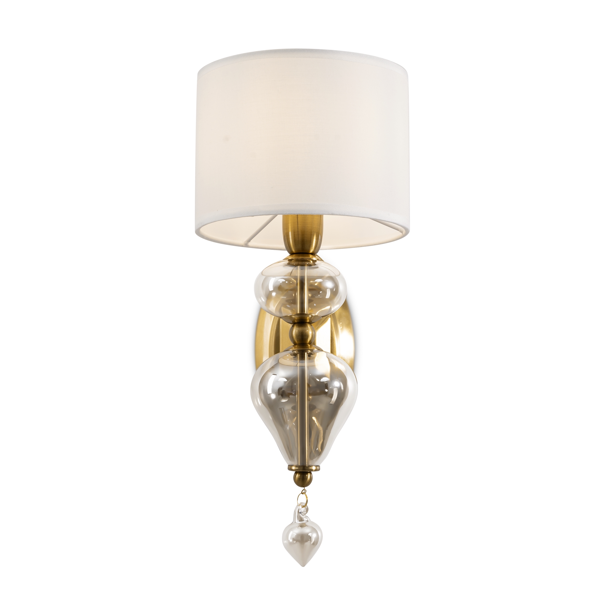 Запросить индивидуальное предложениеАрматура из металла, цвет — латунь. Плафоны — тканевые, молочного цвета. Металлическая конструкция декорирована выдувными стеклянными элементами с перламутровым напылением. Источником света служит лампа с цоколем Е14.