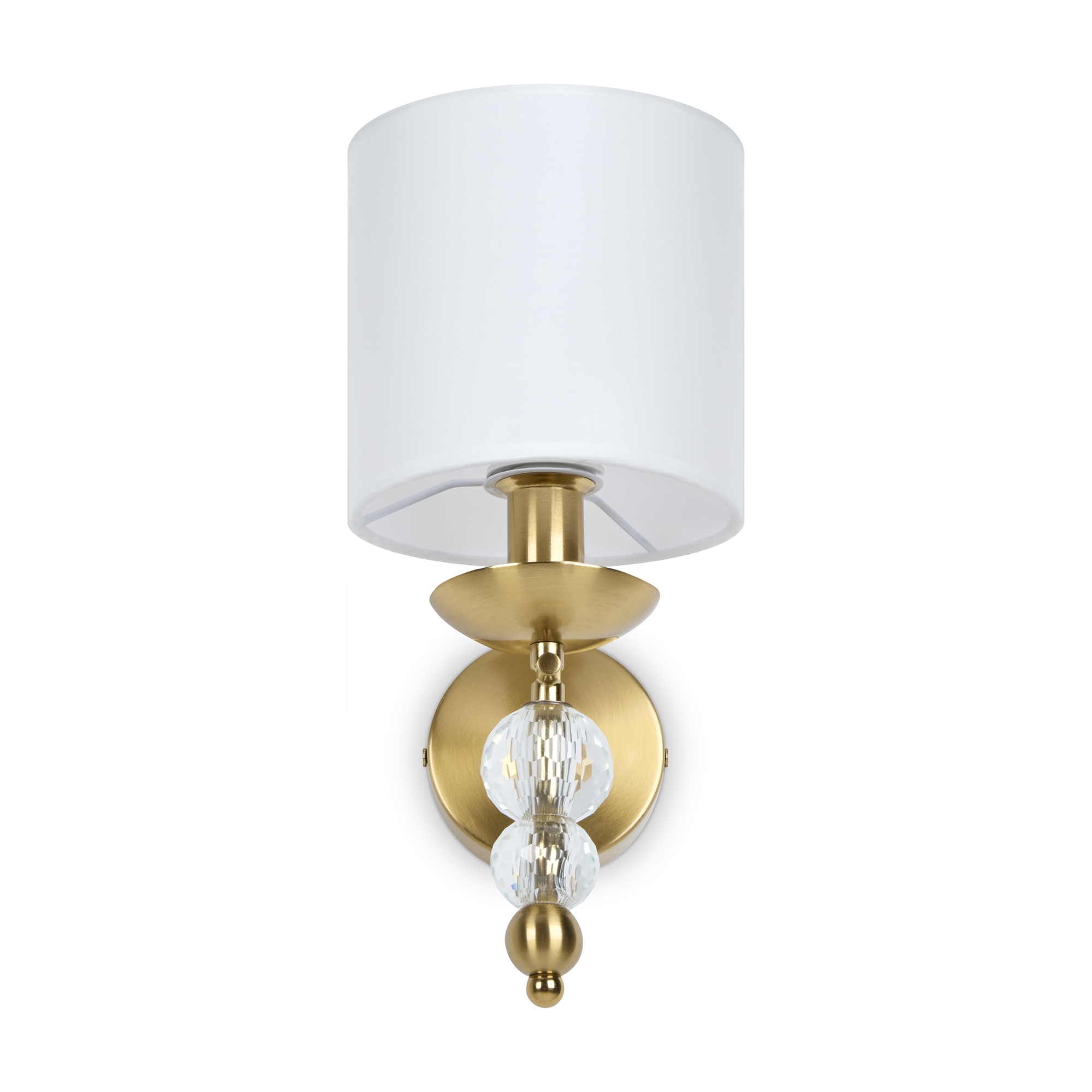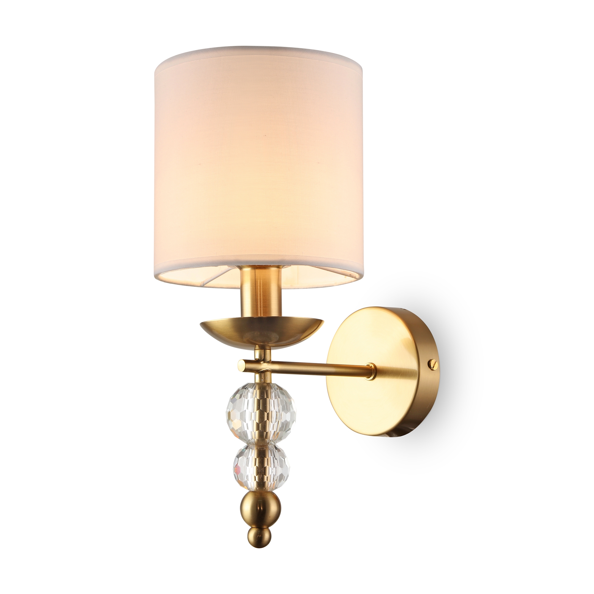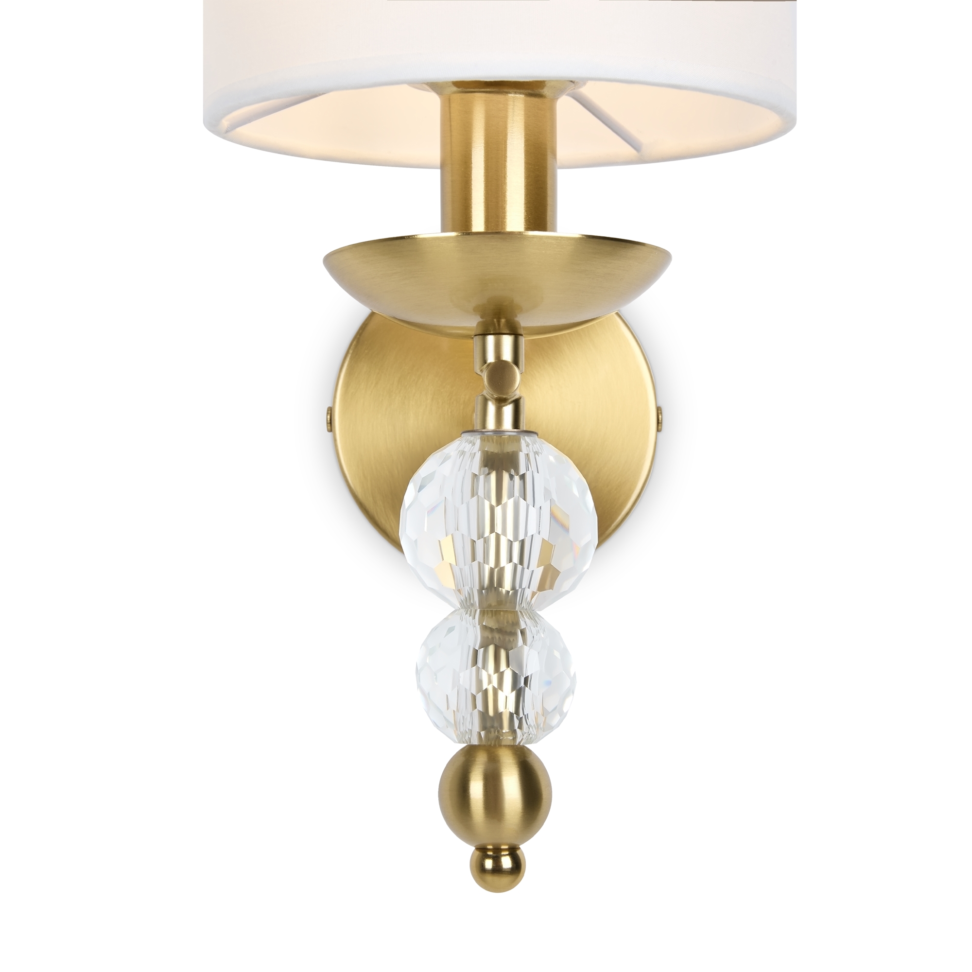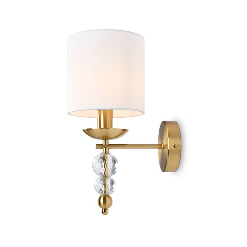 Запросить индивидуальное предложениеМатериал абажура — ткань, цвет — белый. Металлическая арматура в цвете латунь обрамлена хрустальными бусинами.