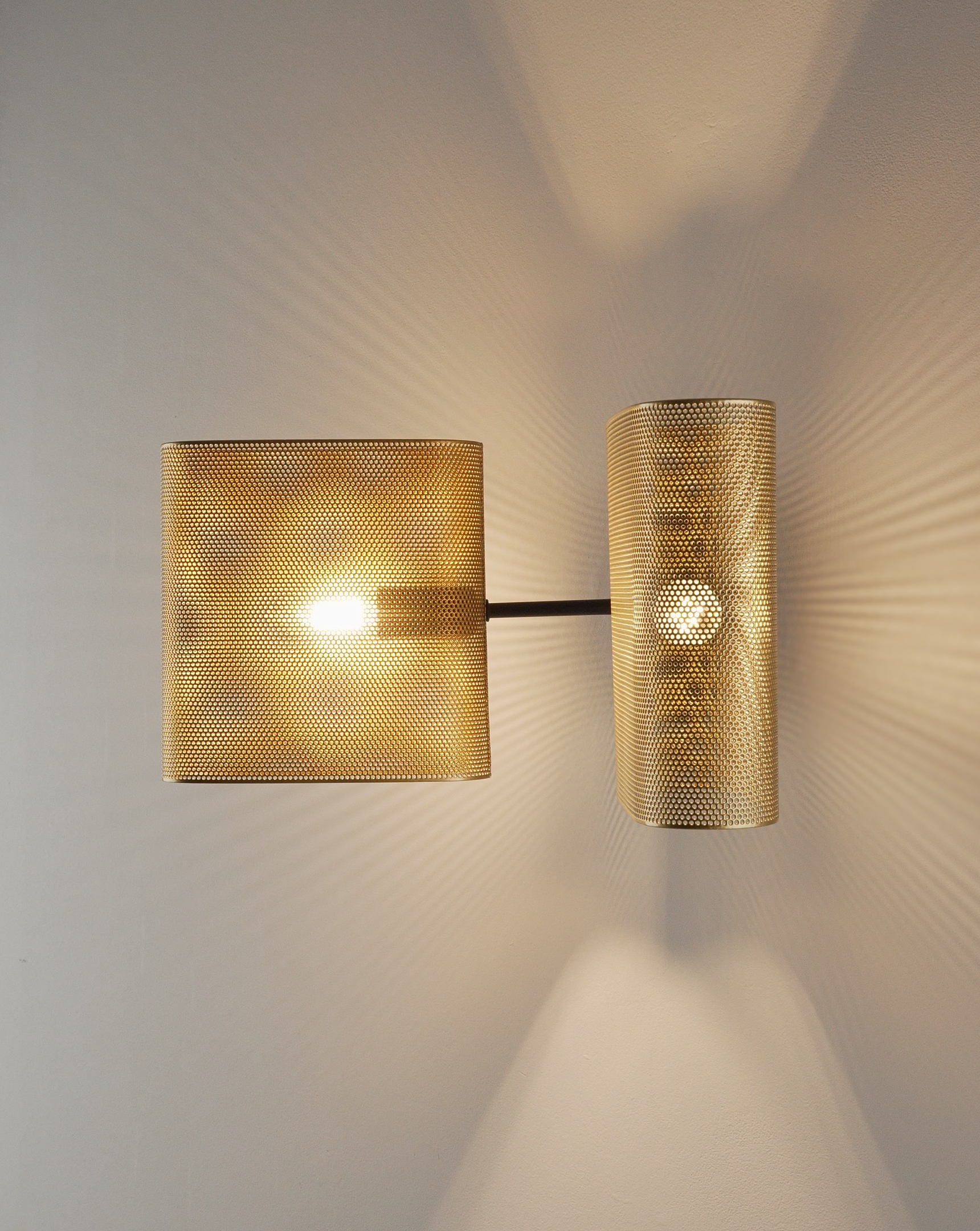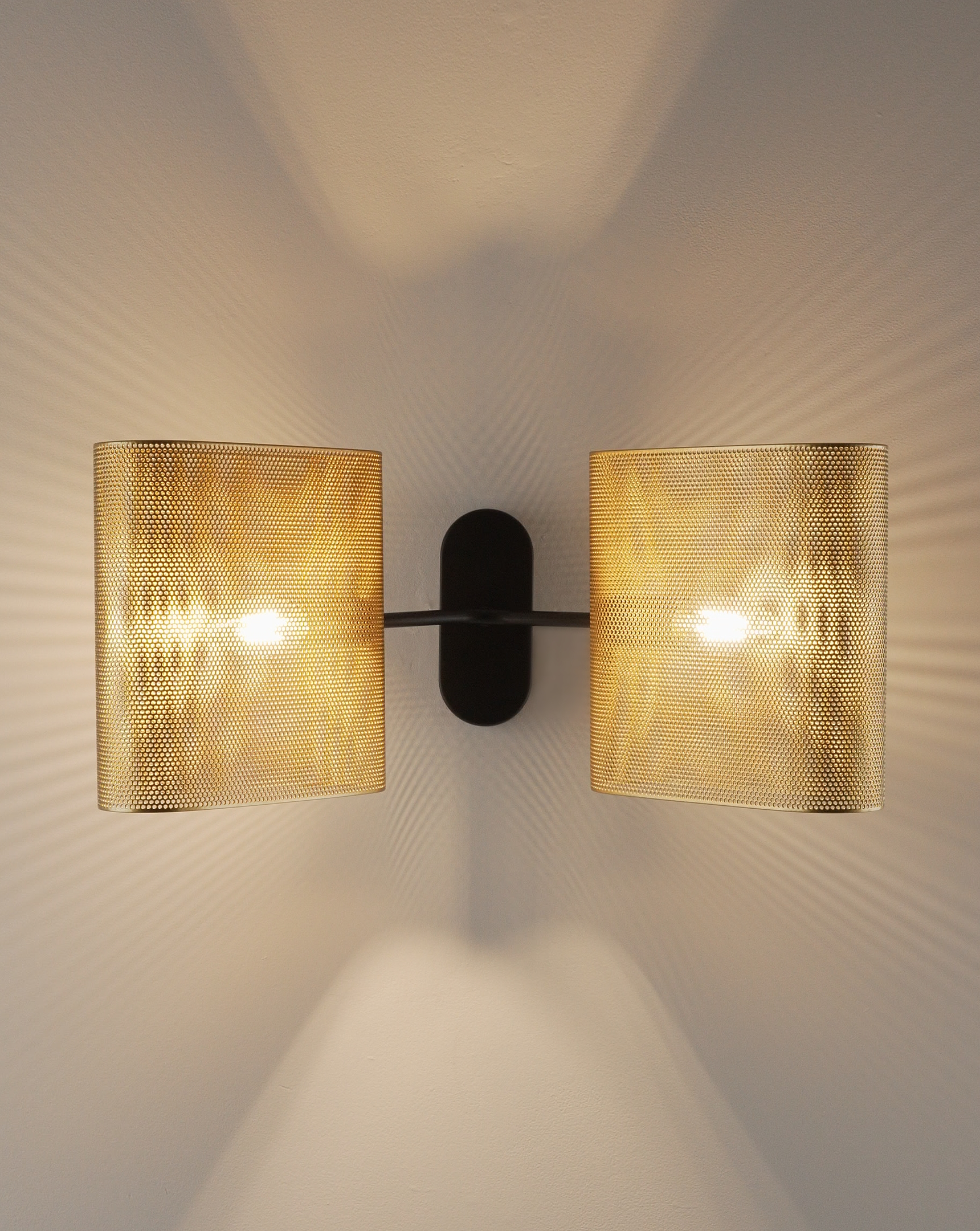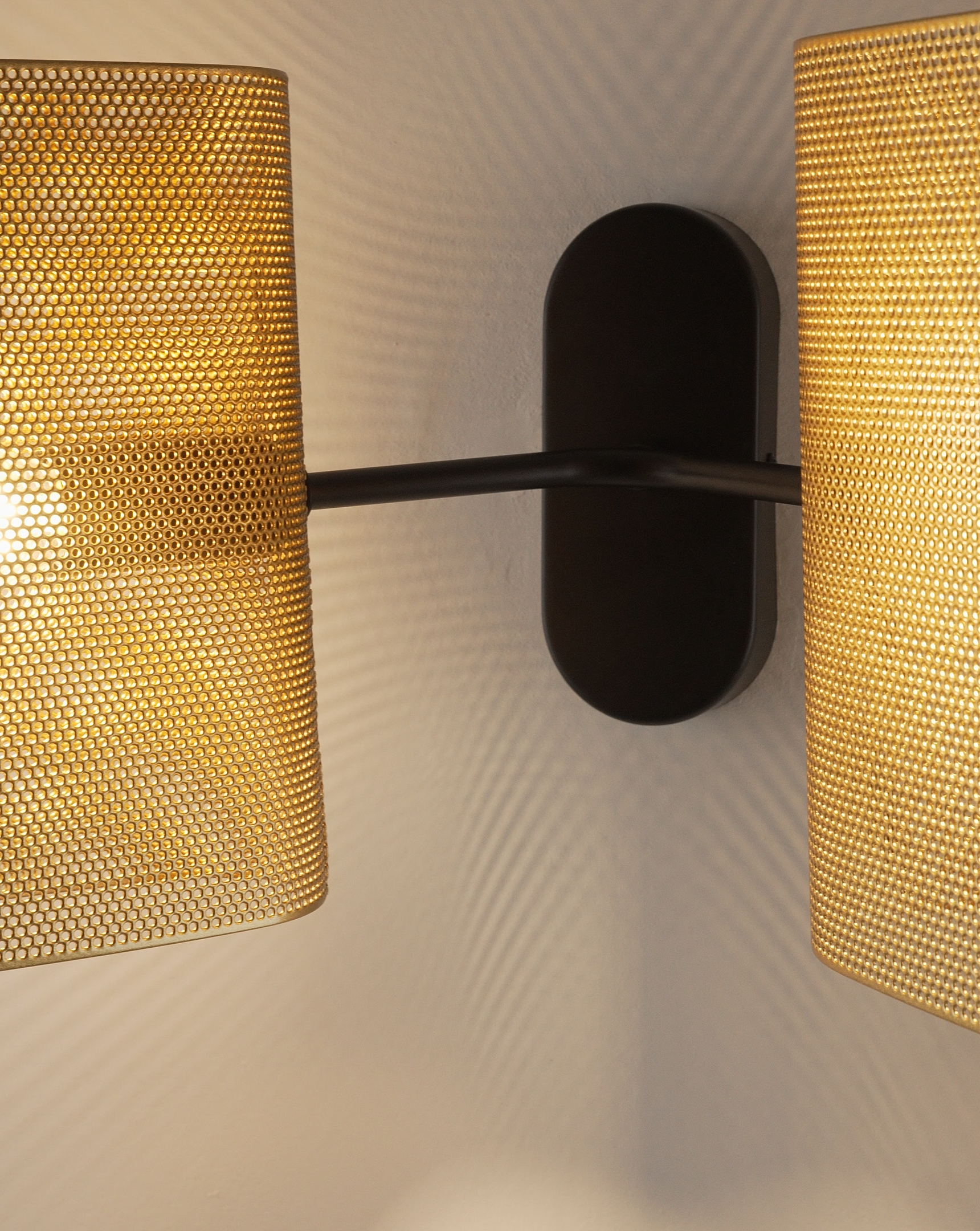 Корпус и плафоны выполнены из прочного металла с матовым покрытием в благородном золотистом цвете. Перфорация не только создаёт декоративный эффект, но и обеспечивает мягкое рассеивание света, создавая уютную атмосферу.