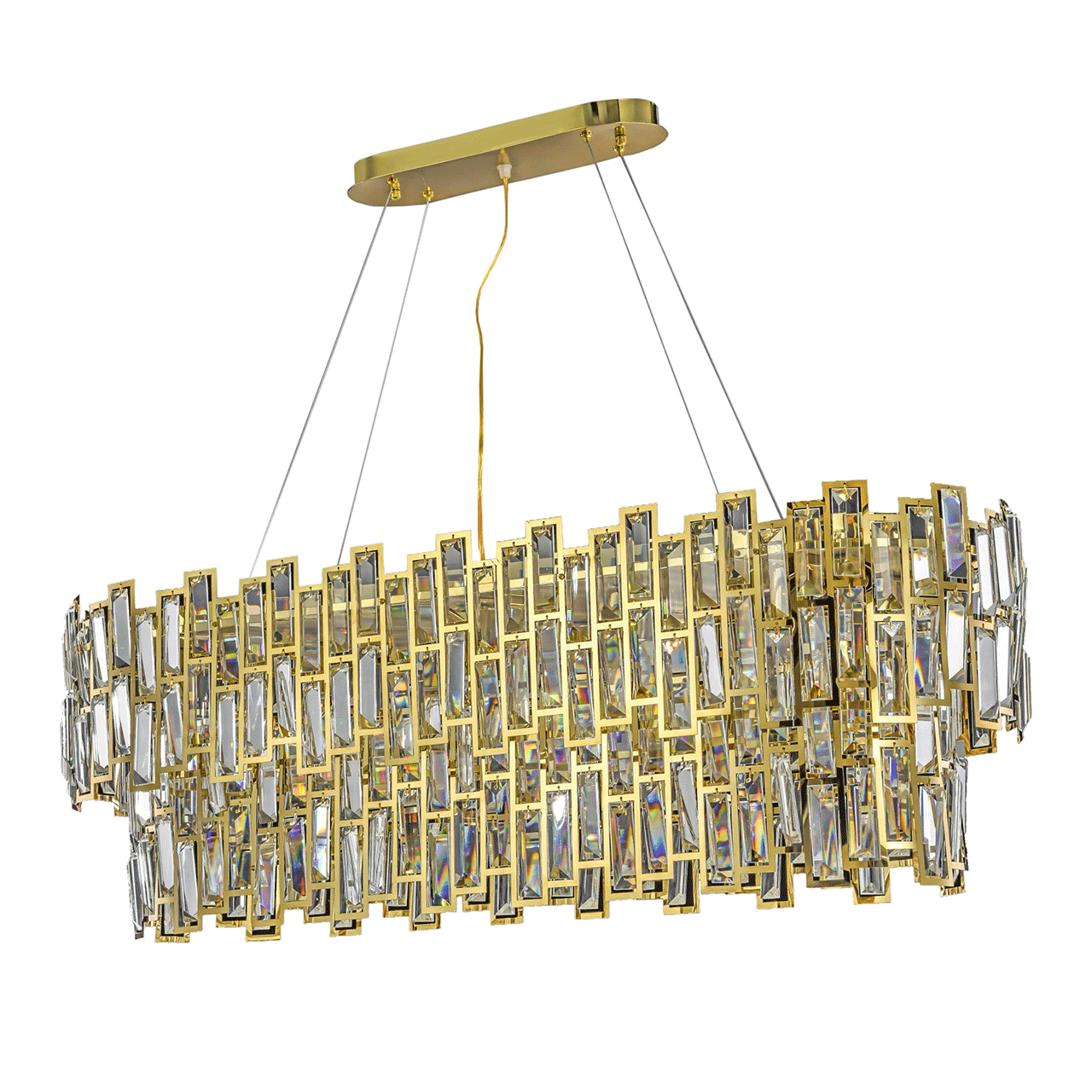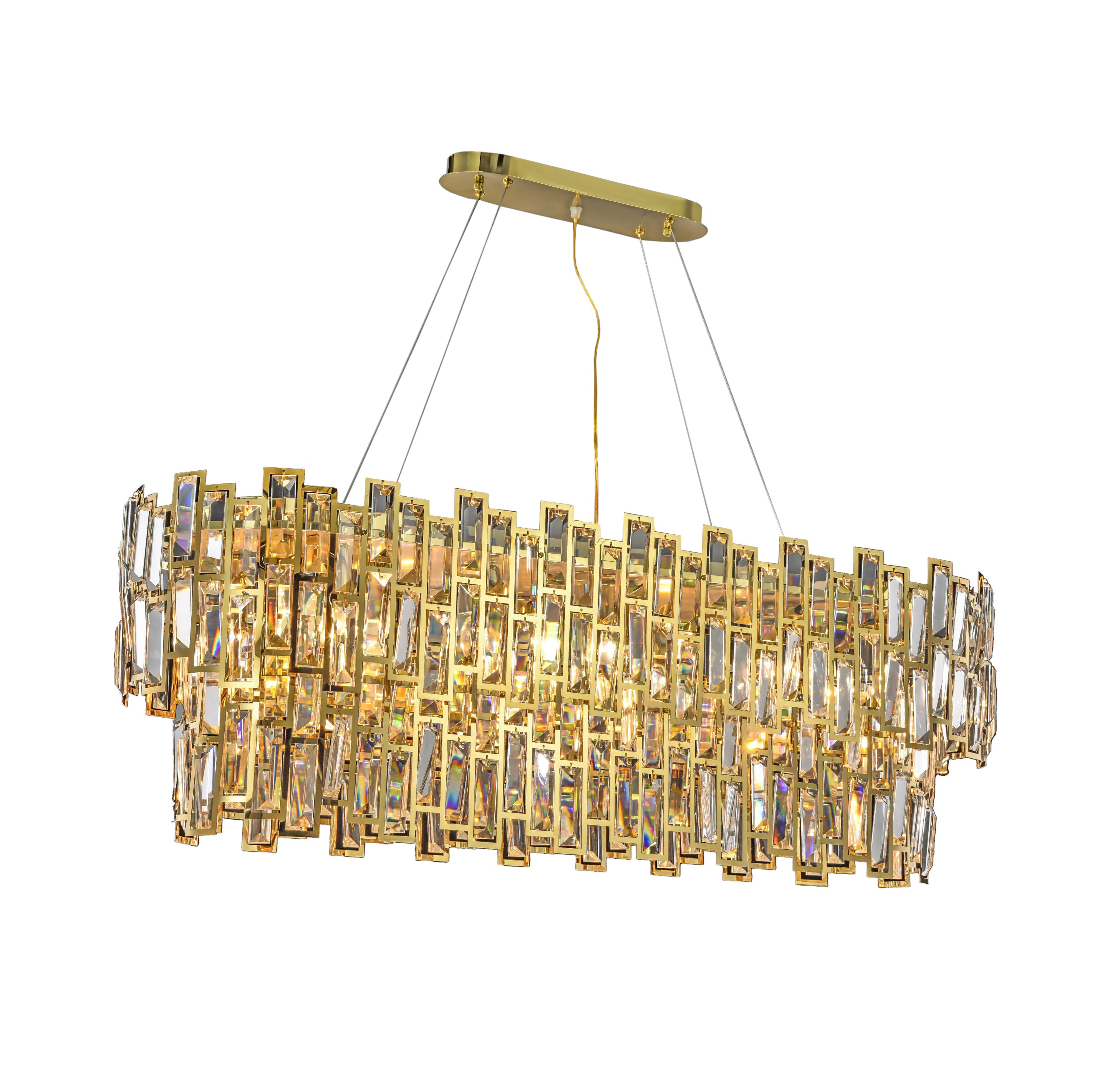 Запросить индивидуальное предложение Люстра Princess 1000 продолговатой формы со множеством изящных стеклянных пластин с зеркальной поверхностью. Пластины выполнены в прямоугольной форме и заключены в золотое обрамление, способны эффектно рассеивать свет со множеством разноцветных бликов, создающих праздничное настроение.