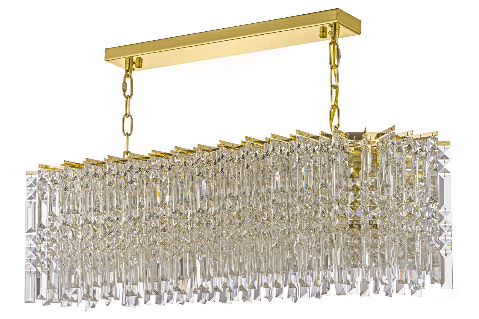 Запросить индивидуальное предложениеMaggio E 1.5.90×30.100 G- Люстра выполнена в стиле ар-деко. Она прямоугольной формы с золотой металлическим основанием, с которой свисают многочисленные хрустальные подвески разной длины, создавая эффект водопада. Подвески огранены, что усиливает игру света и блеск. Золотой цвет металла и кристальная прозрачность создают роскошный и элегантный вид, типичный для ар-деко. Стиль отличается геометрической четкостью формы и использованием дорогостоящих материалов.
