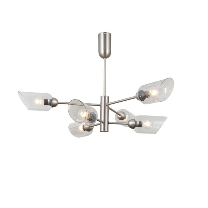 Запросить индивидуальное предложениеПодвесная люстра Avery в современном стиле. Металлический каркас дополнен плафонами. Стильный дизайн люстры дополнит любой современный интерьер, с площадью освещения 15 кв. м люстра станет идеальным выбором для больших комнат, а также для обеденной зоны или зала. В качестве источника света подойдут лампы с цоколем Е14 в количестве 6 штук.