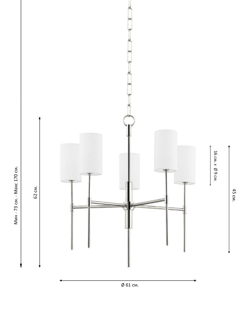 Запросить индивидуальное предложениеСеребряная люстра “Аспен” является великолепным предметом интерьера, который сочетает в себе стиль и функциональность. Ее утонченный дизайн делает ее идеальным выбором для любого помещения. Эта люстра имеет пять ламп, которые выходят из центра на аккуратных дужках с отделкой в цветовой гамме – никель. Каждая лампа покрыта плафоном, который рассеивает свет и создает приятное для глаз свечение. Благодаря этому, освещение в комнате будет равномерным и мягким. Вы сможете наслаждаться ярким освещением в своей гостиной, столовой или спальне. Современный дизайн и функциональность этой люстры сделают ваш интерьер неповторимым.