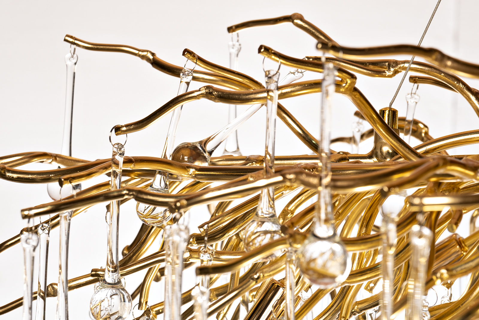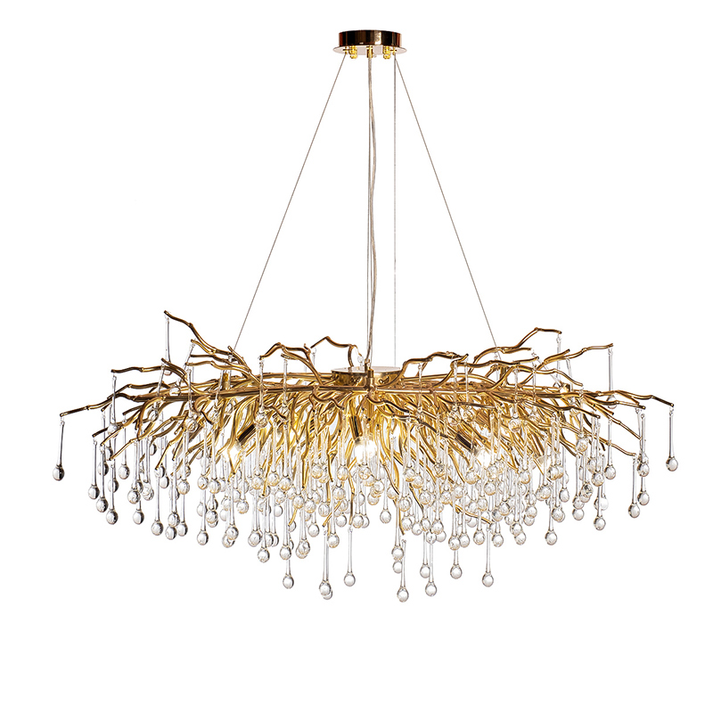 Запросить индивидуальное предложениеЭта люстра - воплощение элегантности и природной красоты. Золотистое основание напоминает изящные ветви дерева, с которых свисают прозрачные капли, создавая эффект утренней росы. Каждый элемент выполнен с высокой точностью, что придаёт люстре уникальный и неповторимый вид. Эта люстра придаст помещению выразительности, подчеркнет роскошество атмосферы в гостиной или столовой.