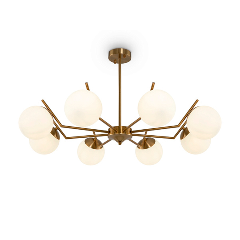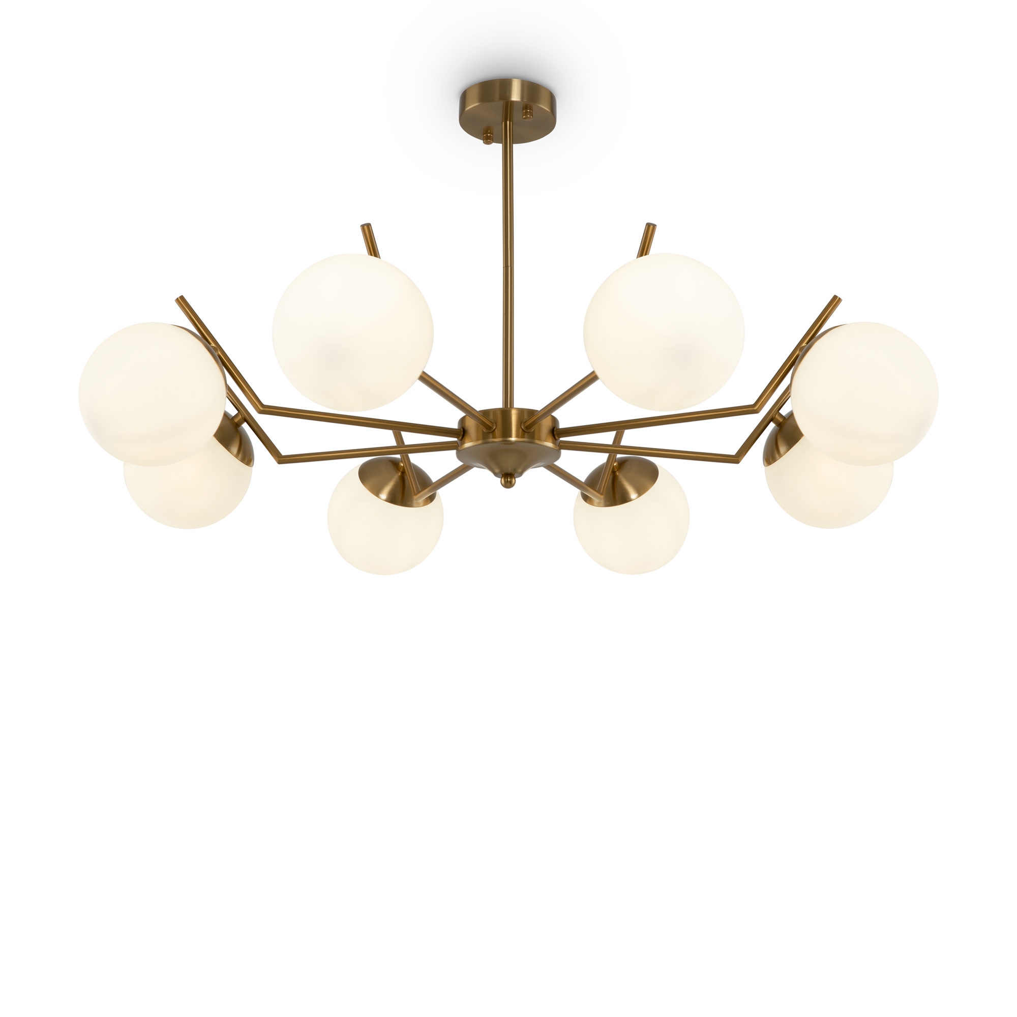 Запросить индивидуальное предложениеОбращение к природным формам наполняет современный дизайн глубоким смыслом. Визуальный образ – вдохновение для серии Moonrock – это лунный диск, символ изменчивости окружающего мира. Строгая геометрия металлической арматуры подчеркнута оттенком латуни. Стеклянные плафоны-сферы, окрашенные в матовый белый цвет, смотрятся легко и утонченно. Компактные потолочные модели подойдут для невысоких потолков. Серию составляют люстры, рассчитанные на 6 и 8 ламп. Они прекрасно интегрируются в пространство гостиной, спальни или кухни. Используйте их в интерьерах, выполненных в актуальных стилях: mid-century modern, сканди, минимализм.