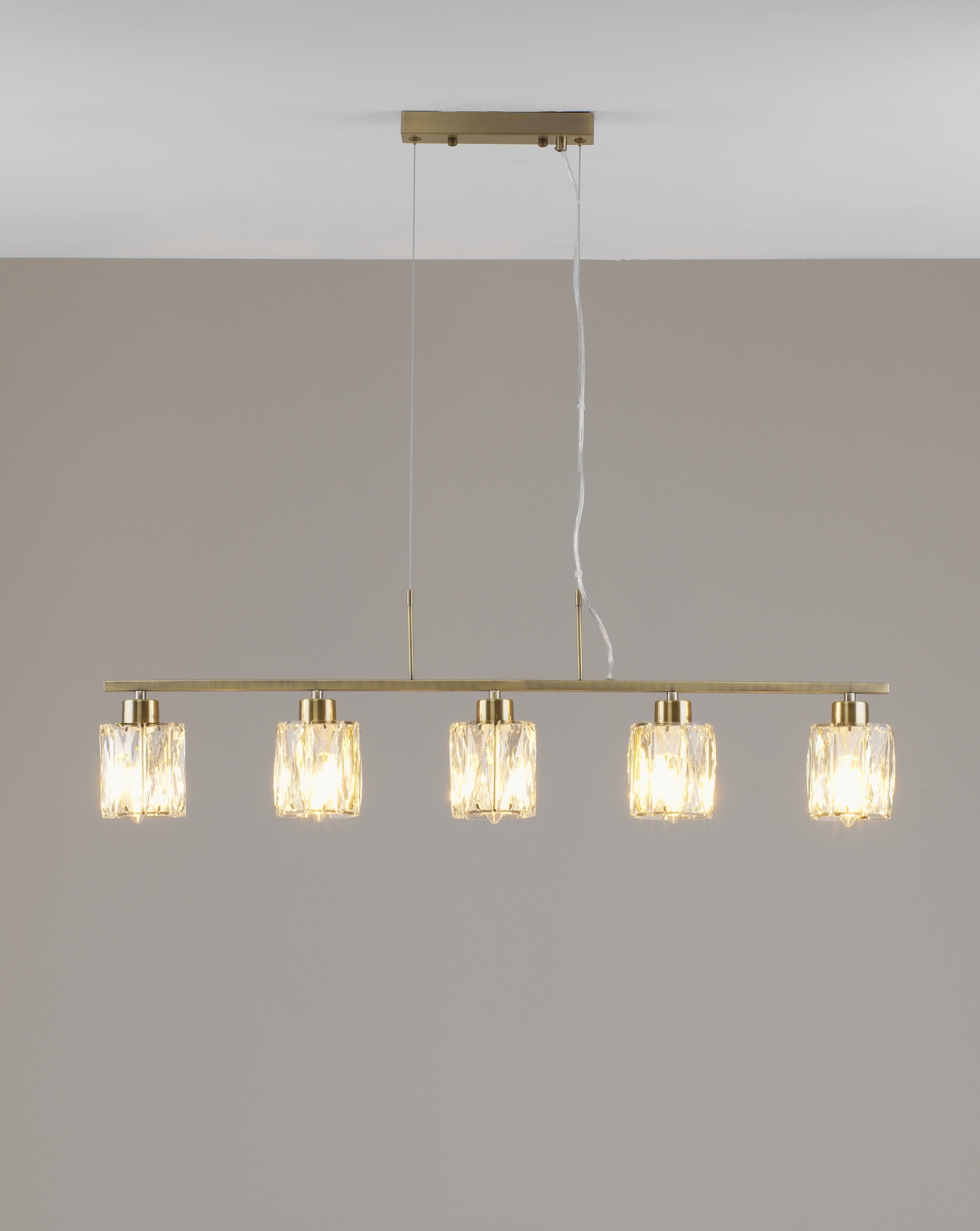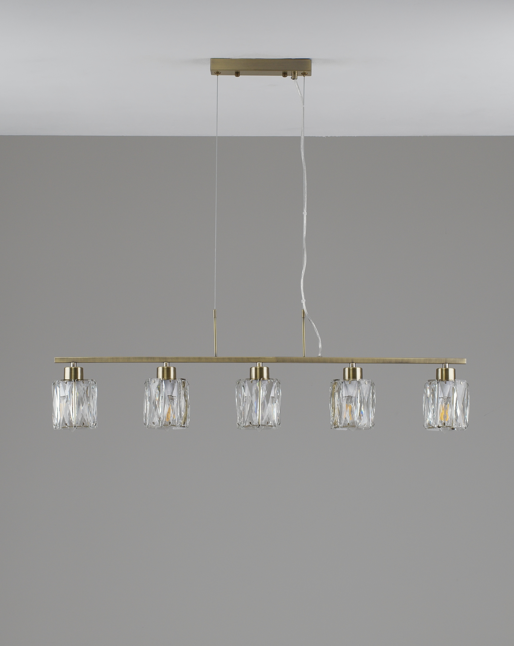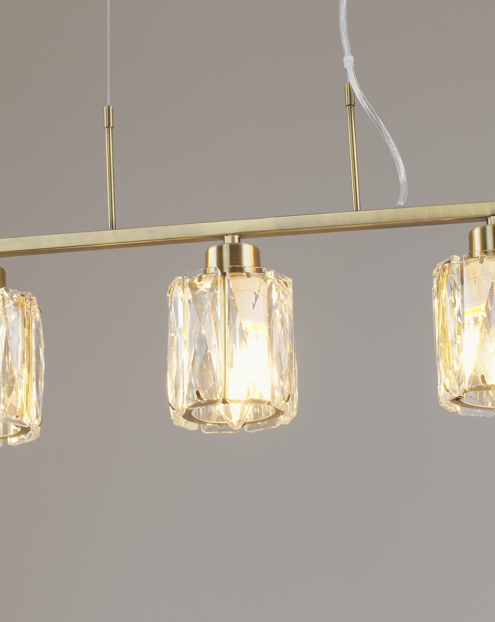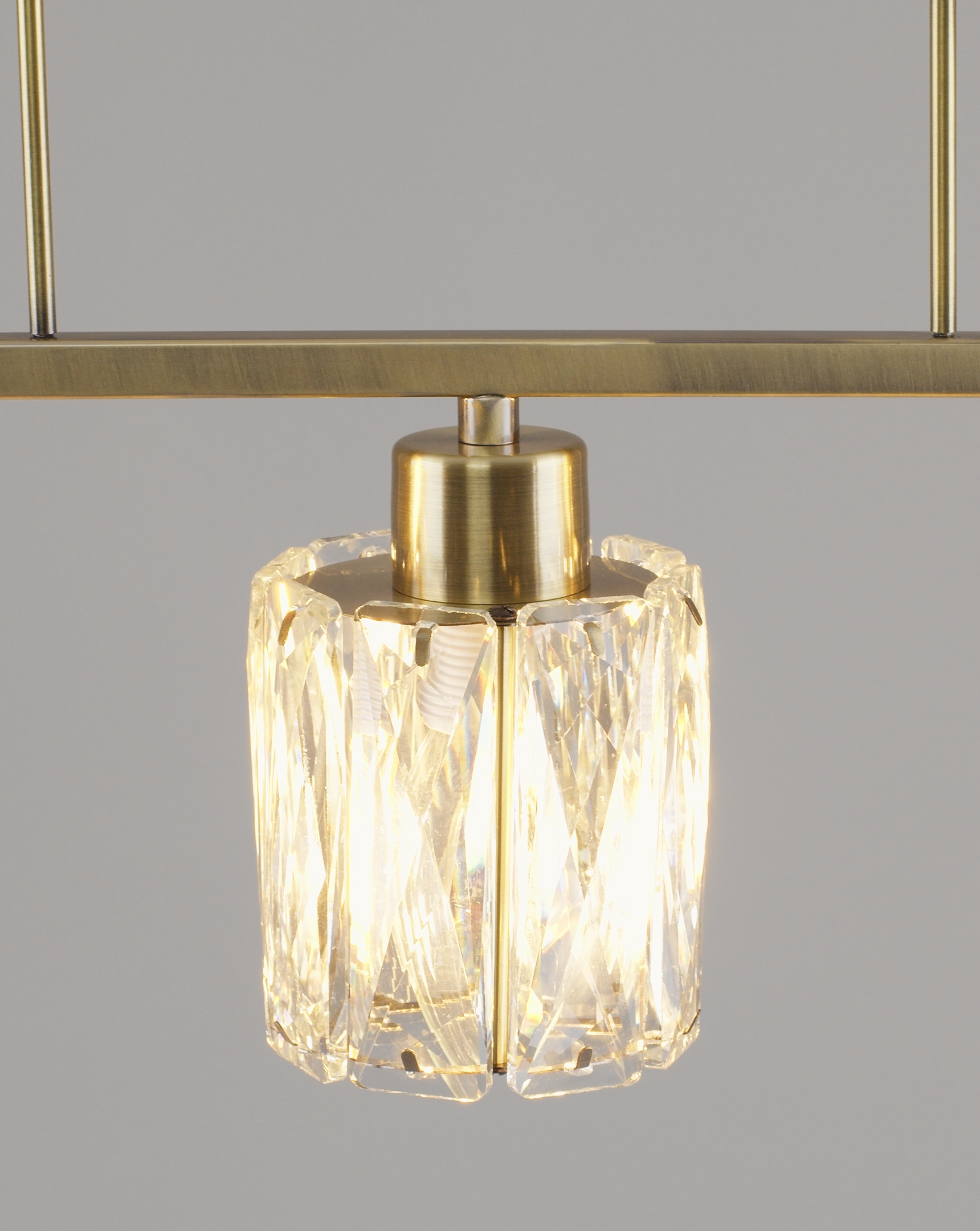 Люстра коллекции Prismique сочетает в себе элегантную прямолинейность и сияющую фактуру хрустальных плафонов. Каждый из плафонов выполнен из прозрачного хрусталя с огранкой, благодаря которой свет преломляется и рассыпается яркими бликами, создавая торжественную и тёплую атмосферу.