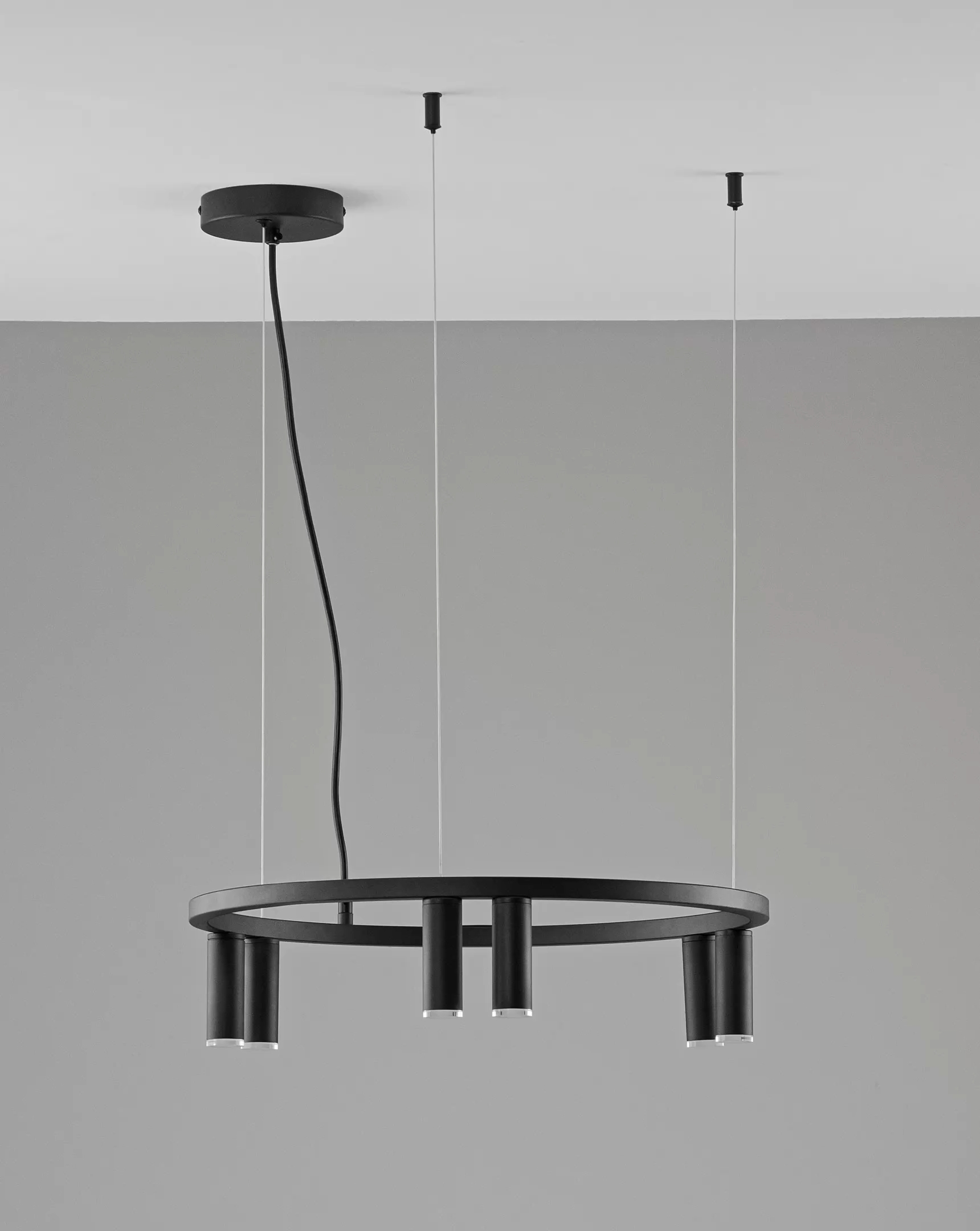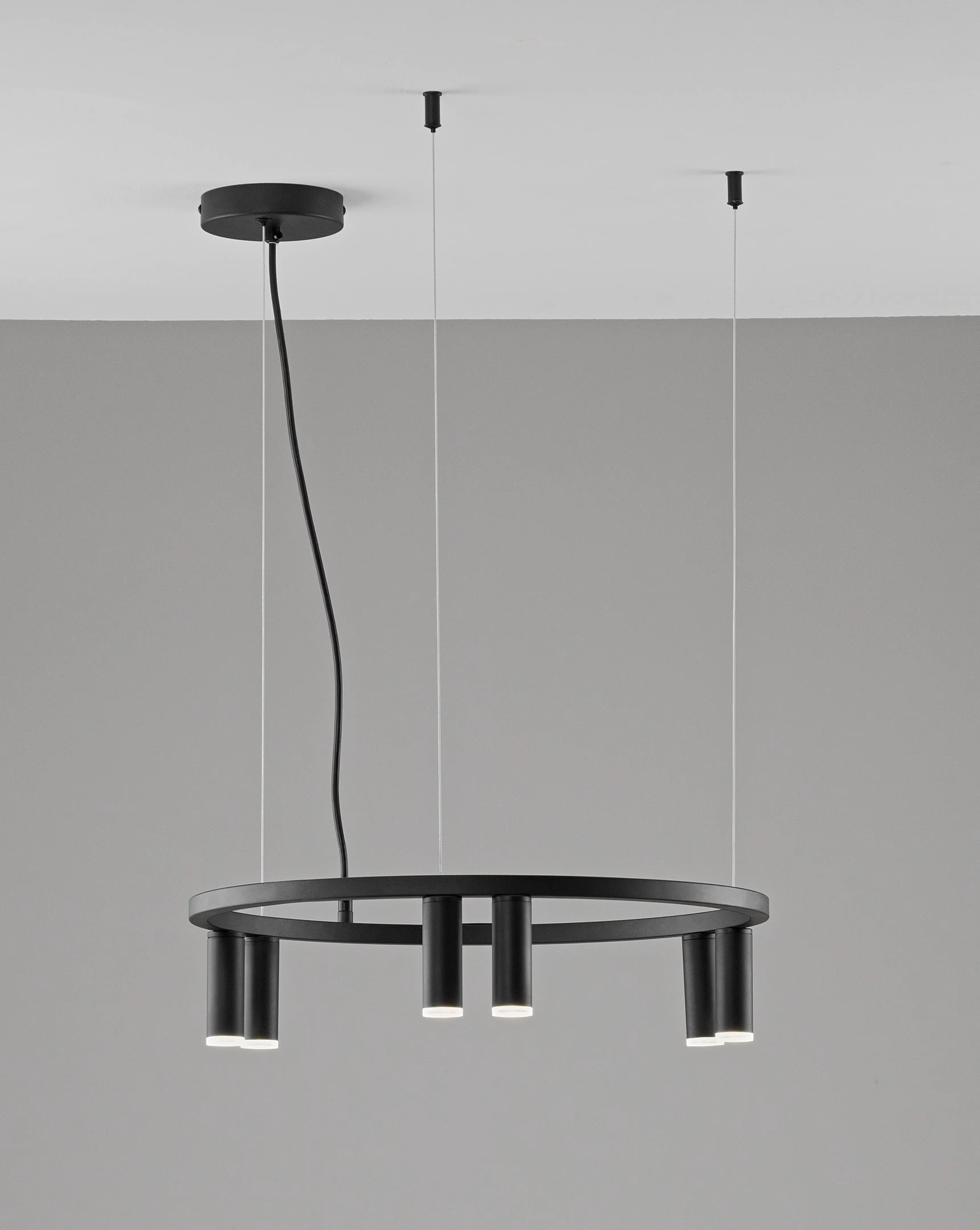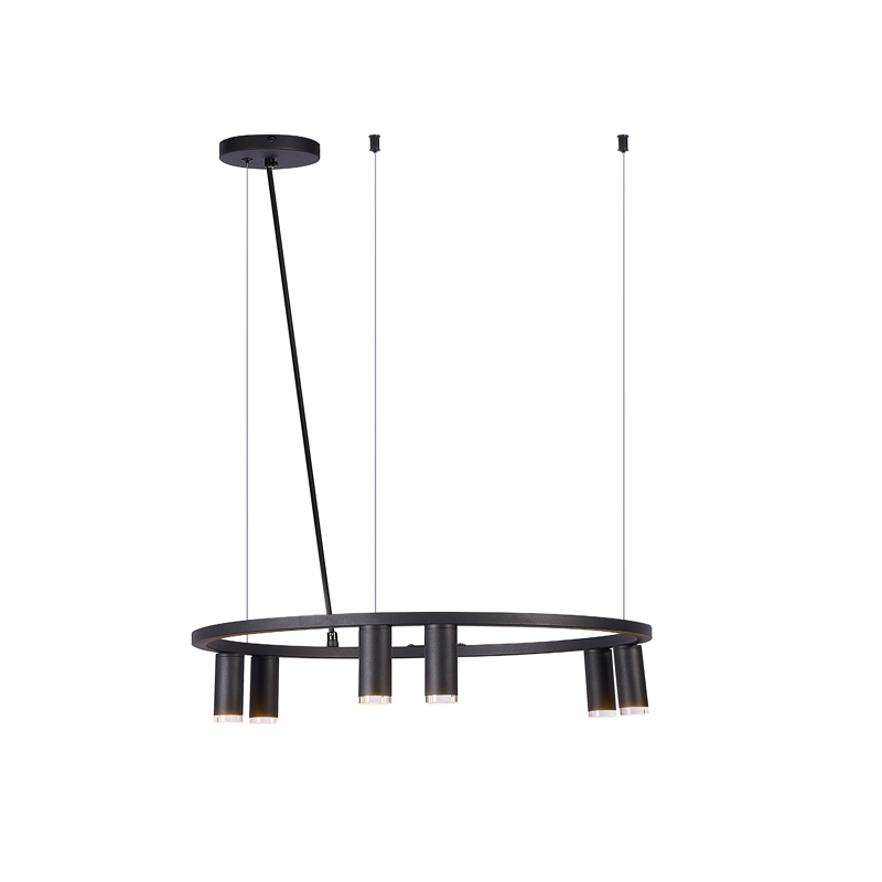 Moderli Sofina — стильная подвесная люстра, в которой удачно сочетаются лаконичная геометрия и выразительная фактура. Основание выполнено в виде кольца, к которому крепятся шесть цилиндрических плафонов, частично выполненных из прозрачного акрила. Матовое покрытие придаёт люстре сдержанный характер, подходящий для интерьеров в стиле лофт, модерн и минимализм.