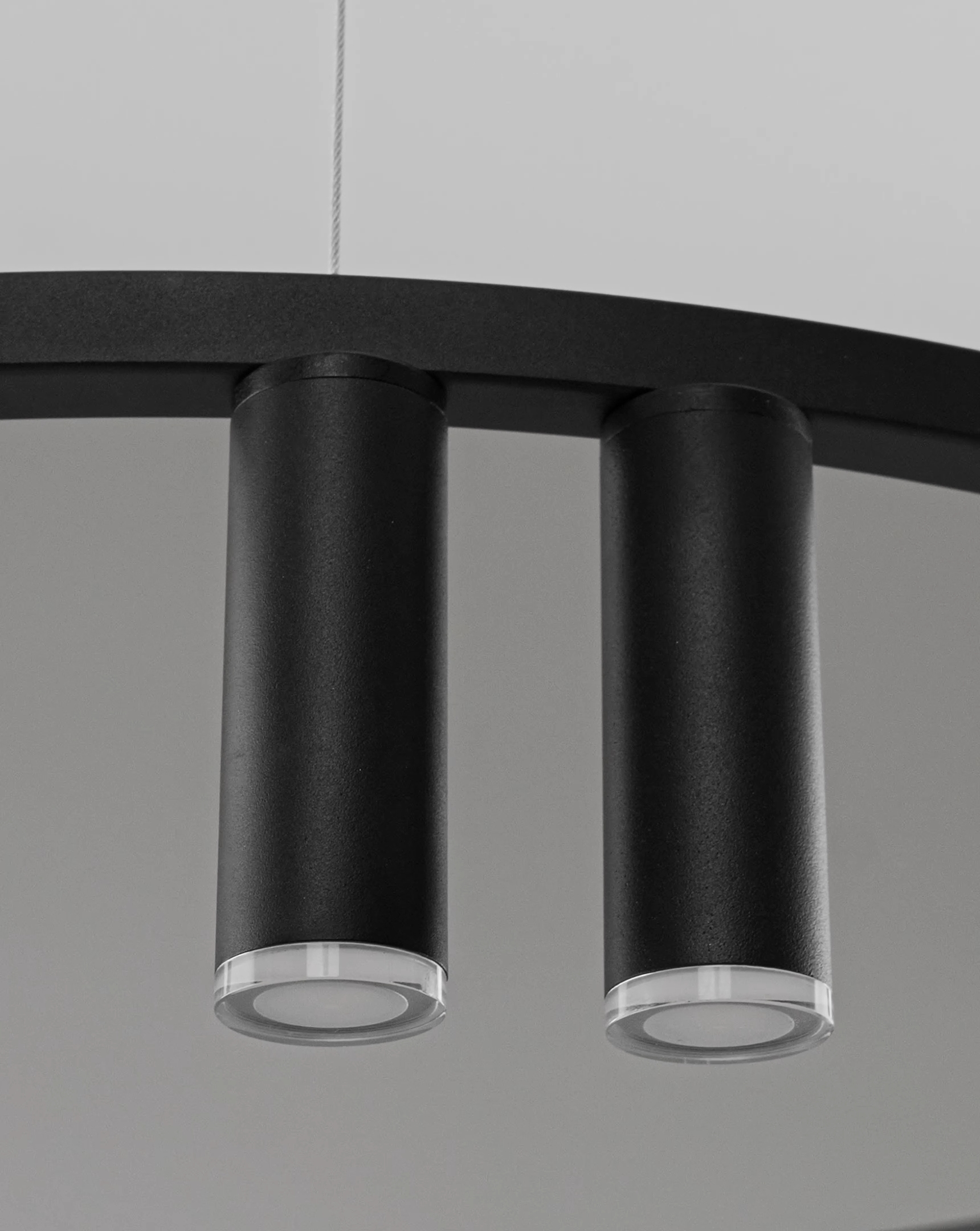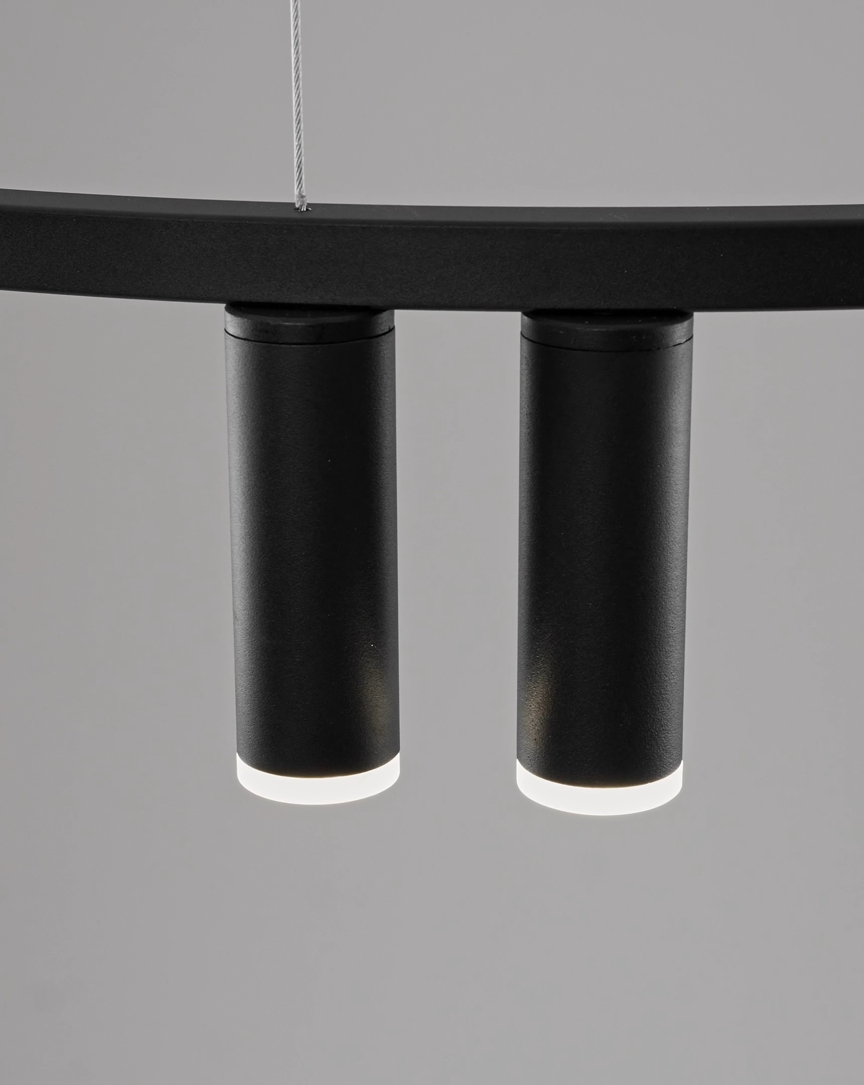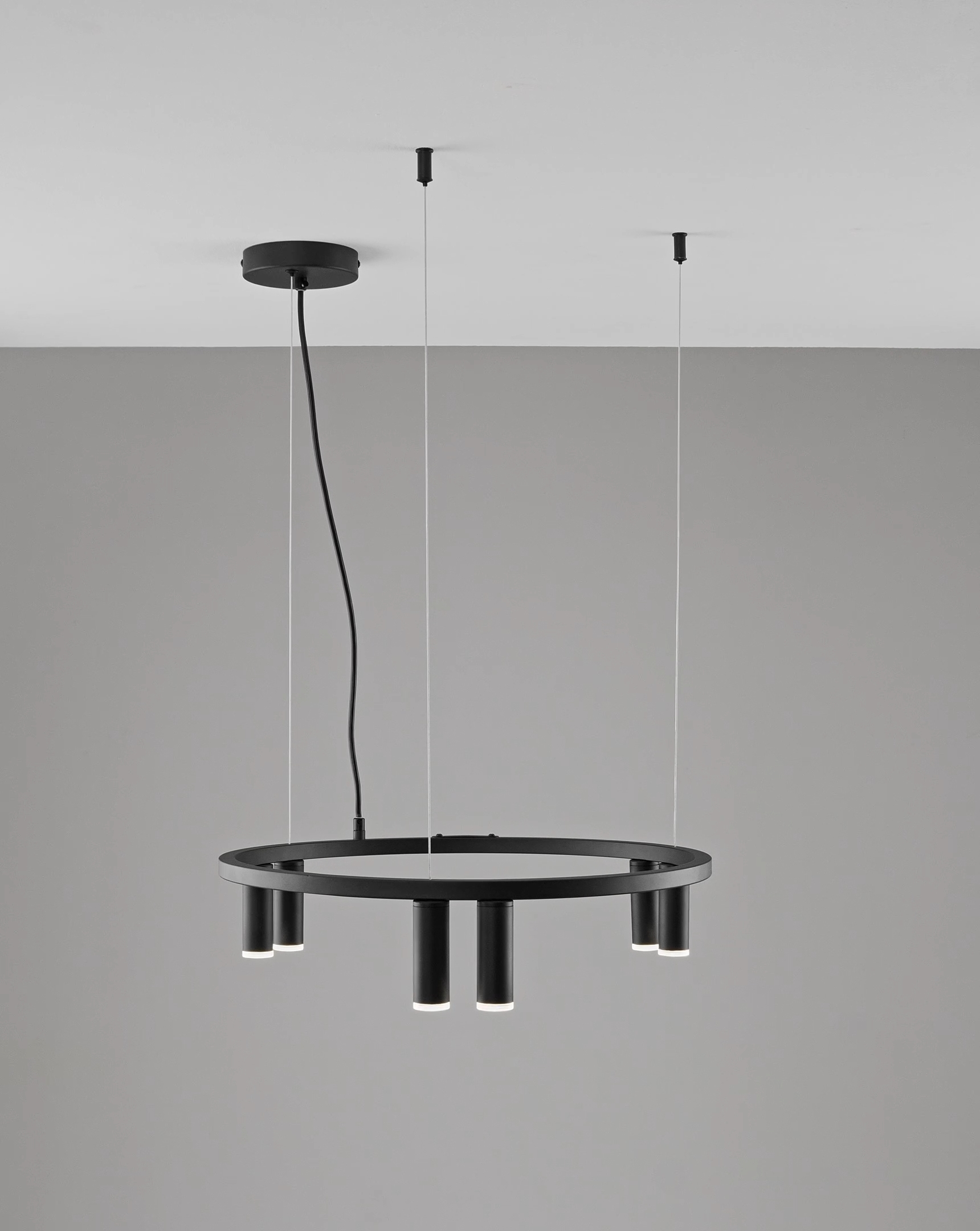 Moderli Sofina — стильная подвесная люстра, в которой удачно сочетаются лаконичная геометрия и выразительная фактура. Основание выполнено в виде кольца, к которому крепятся шесть цилиндрических плафонов, частично выполненных из прозрачного акрила. Матовое покрытие придаёт люстре сдержанный характер, подходящий для интерьеров в стиле лофт, модерн и минимализм.
