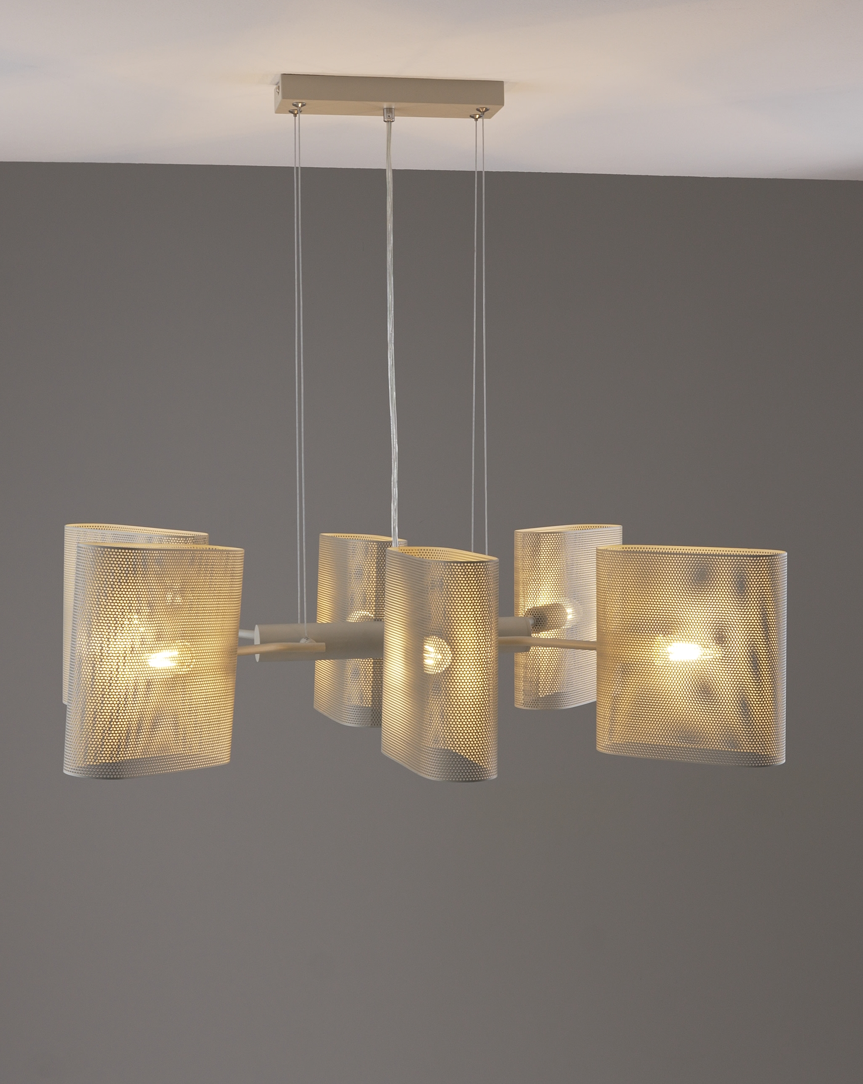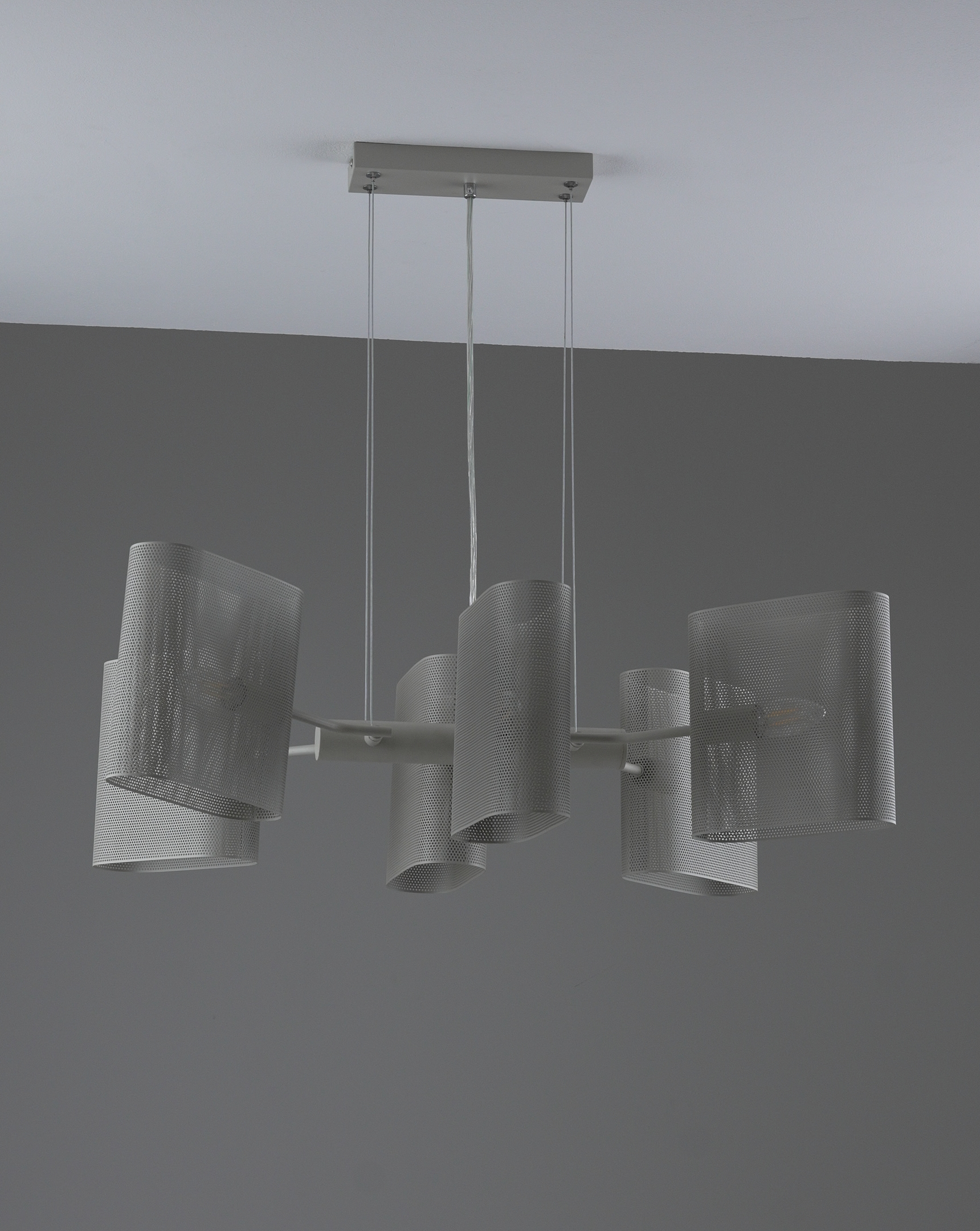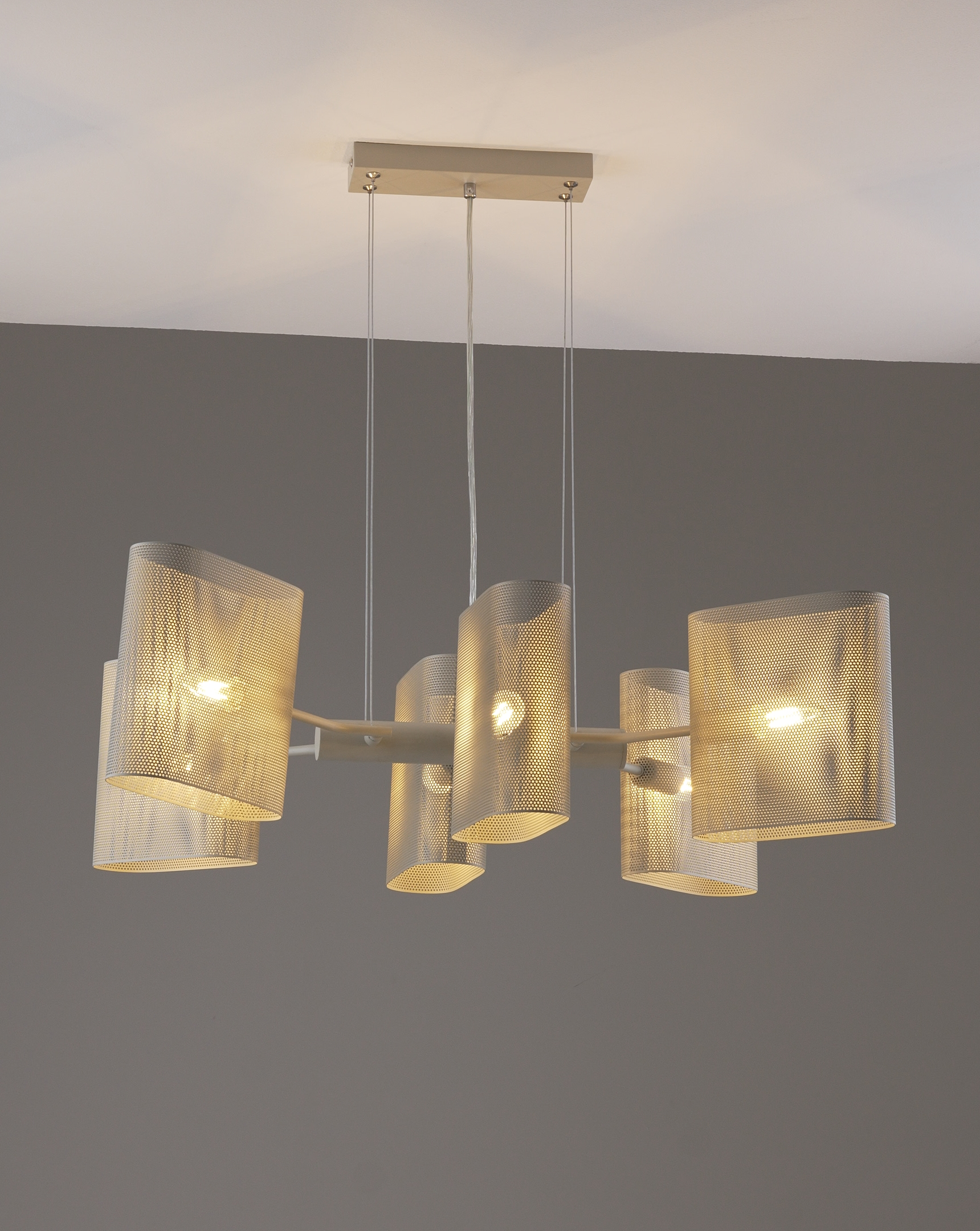 Люстра из коллекции Metalicana — это воплощение индустриальной эстетики и продуманной геометрии. Шесть оригинальных плафонов квадратной формы из перфорированного металла создают эффект мягкого, рассеянного света и добавляют интерьеру выразительности. Такая модель гармонично впишется в современный интерьер, оформленный в духе лофта или минимализма.