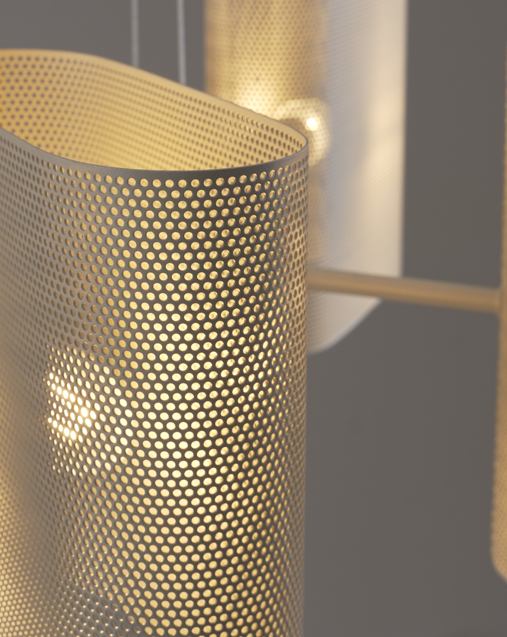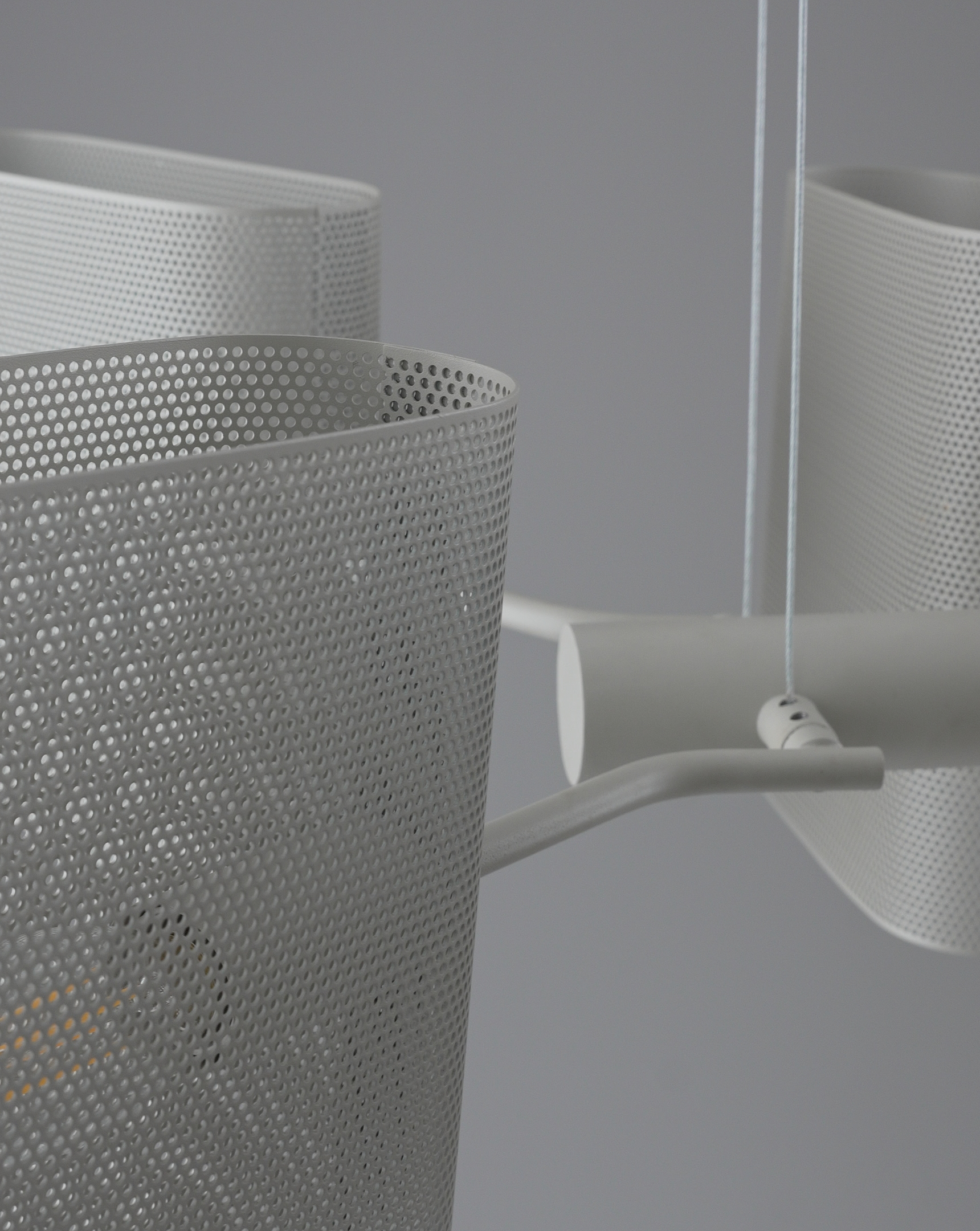 Конструкция выполнена полностью из металла с матовым покрытием в универсальном сером цвете. Перфорированные плафоны не только визуально облегчают внешний вид, но и обеспечивают комфортное свечение без резких теней. Высота подвеса регулируется в диапазоне от 20 до 100 см, позволяя адаптировать люстру под разные потолки и сценарии освещения.