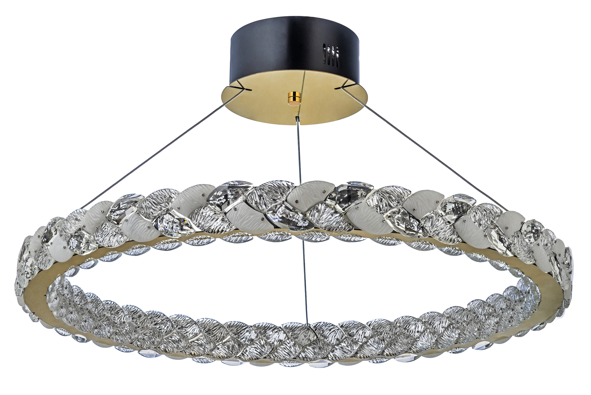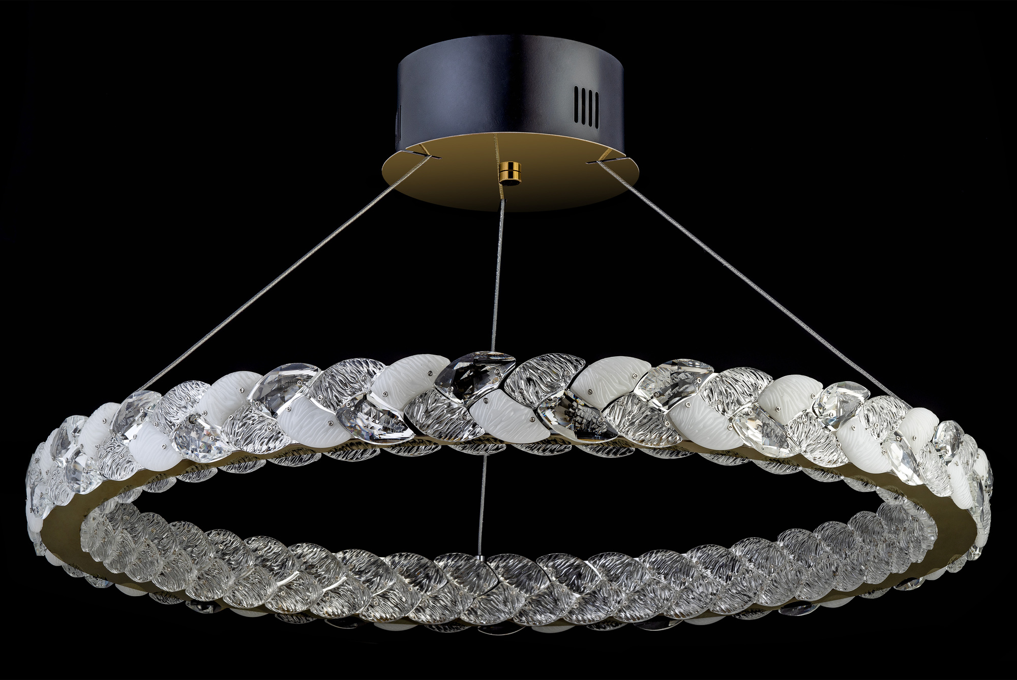 * Дизайн: Люстра имеет кольцеобразную форму, подвешенных на тонких тросах к круглому черному основанию.