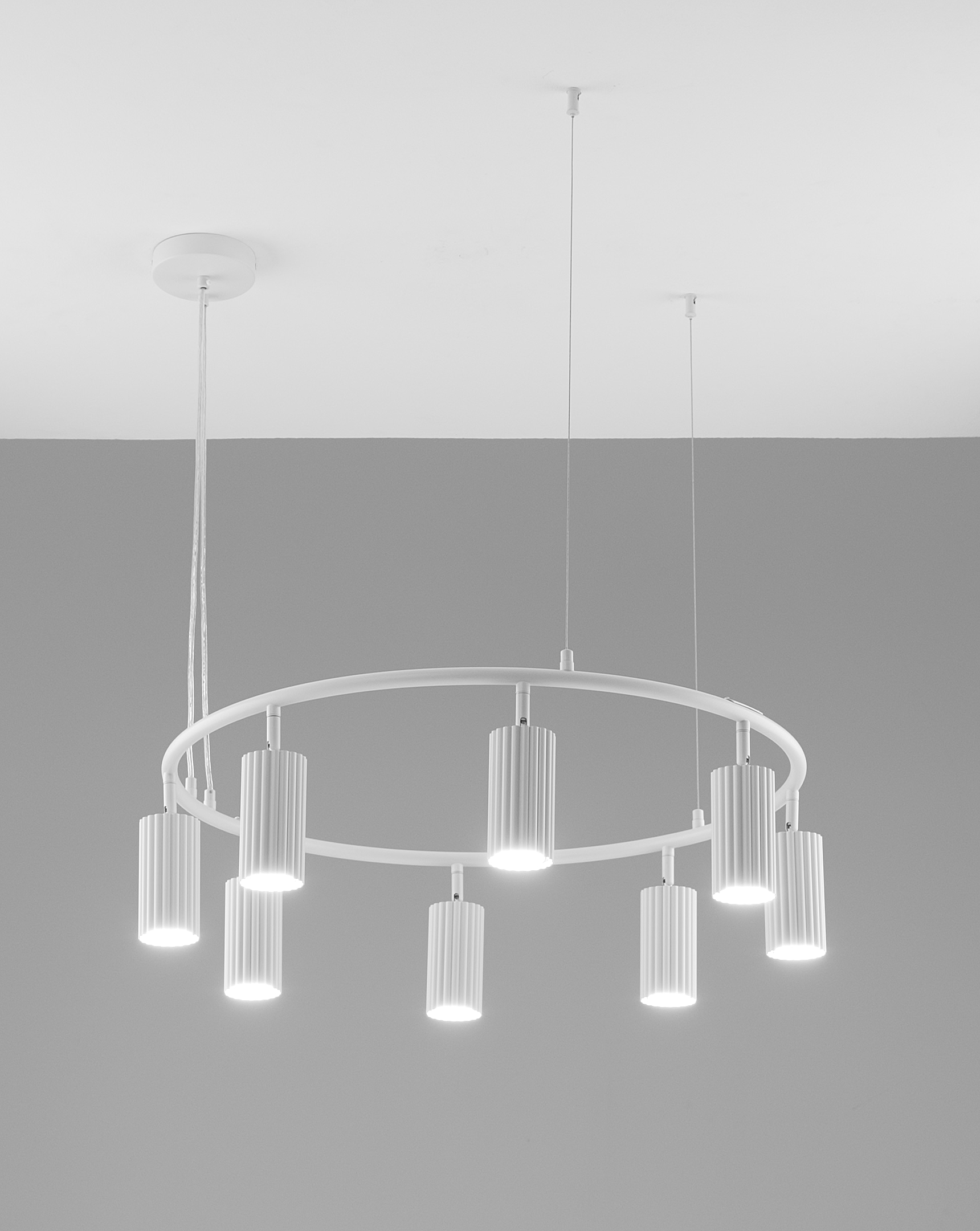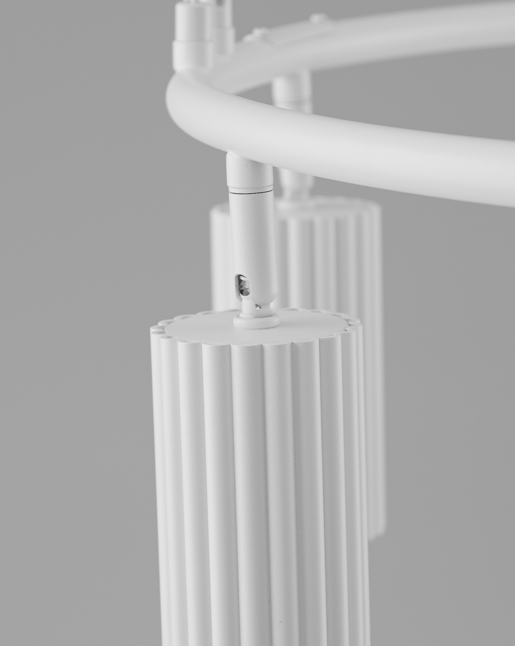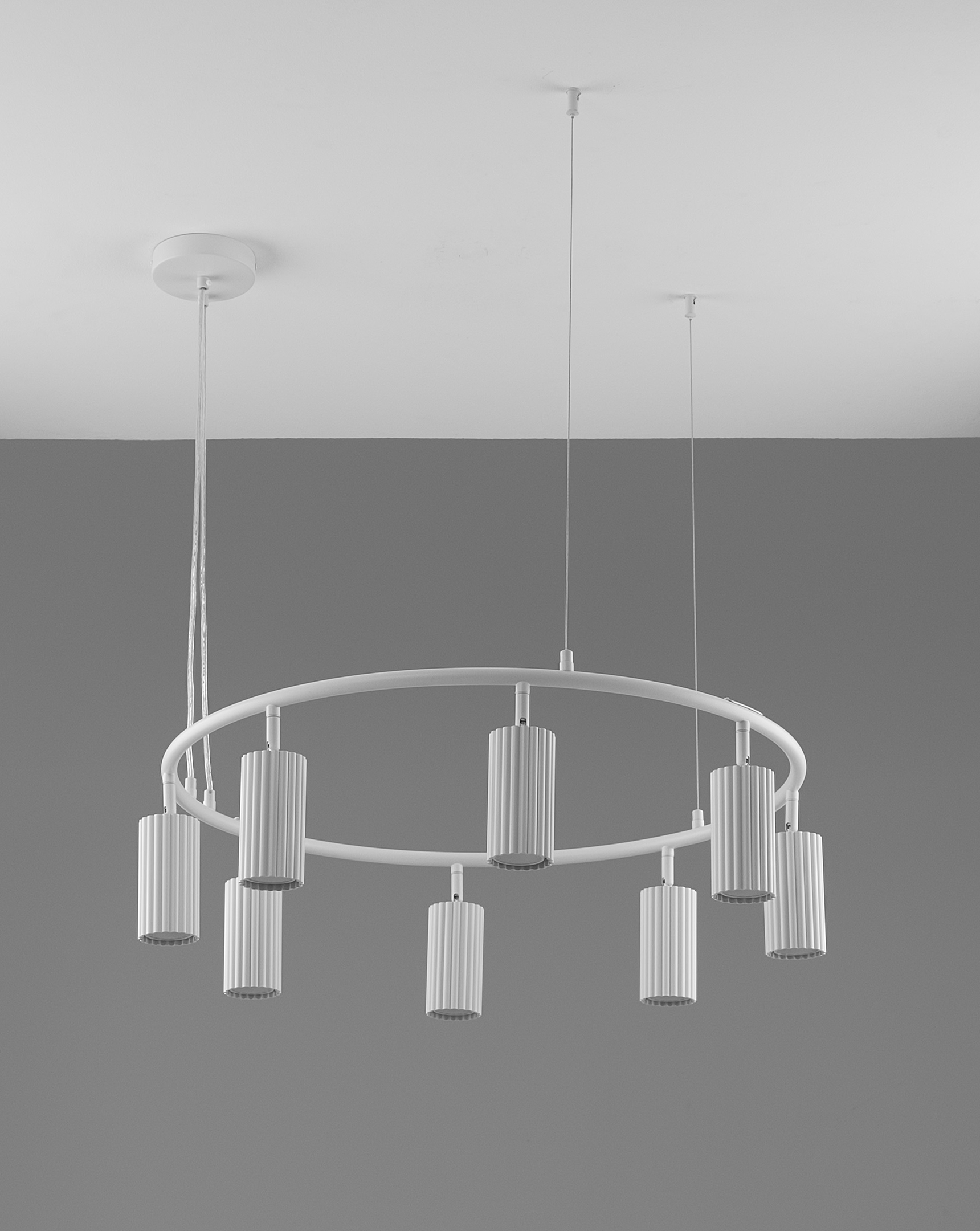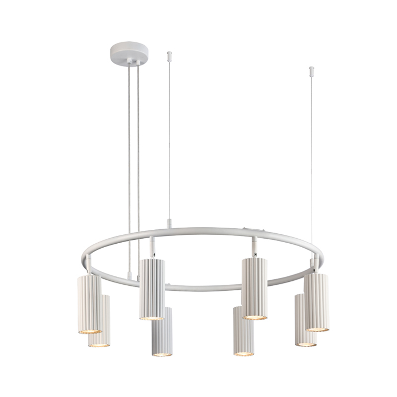 Люстра оснащена 8 лампами с цоколем GU10, каждая мощностью до 50 Вт, что дает общую мощность 400 Вт, обеспечивая освещение площадью до 16 кв.м. Специальный поворотный механизм позволяет направлять свет в нужное направление, а также регулируется по высоте, что дает дополнительную гибкость при установке.