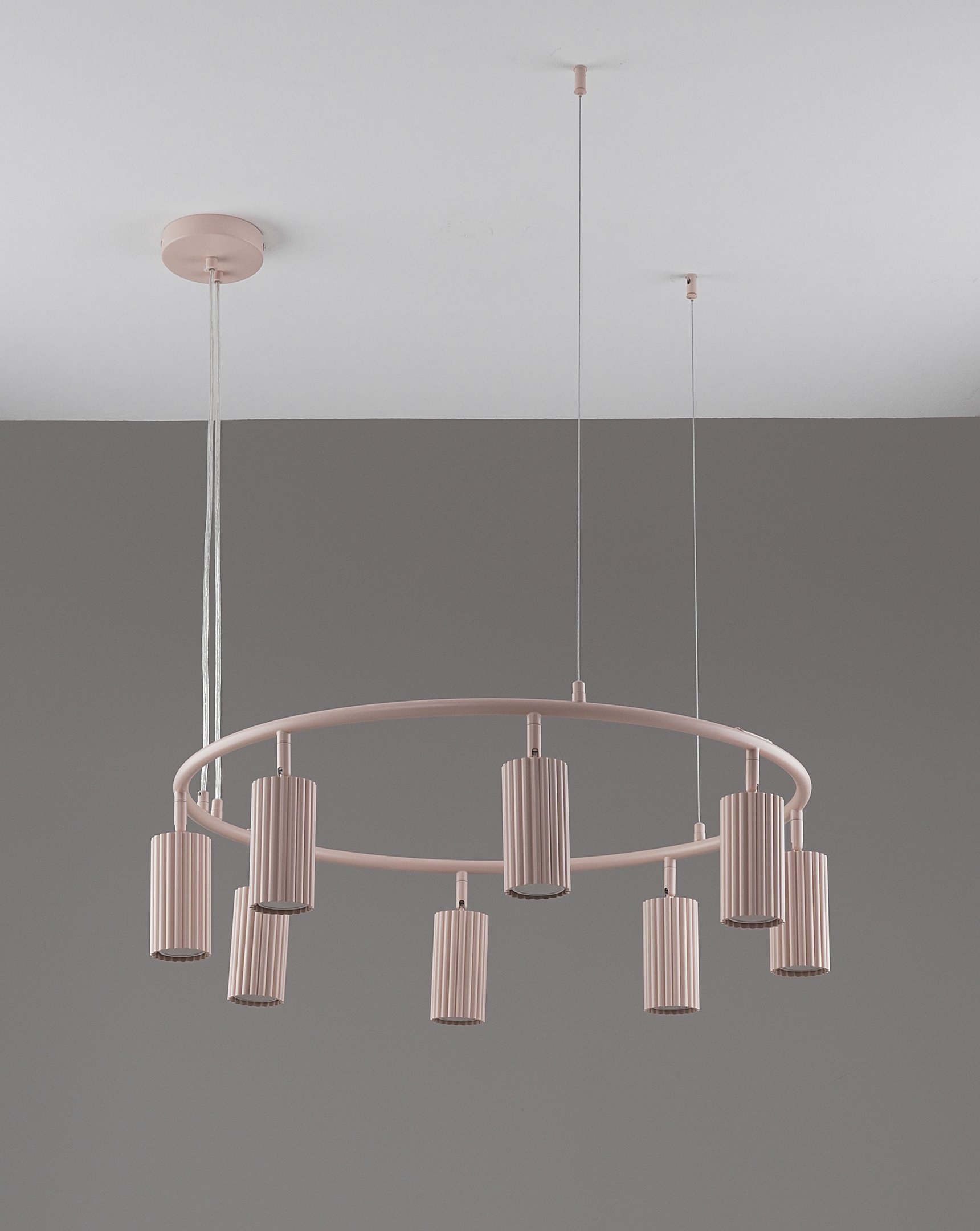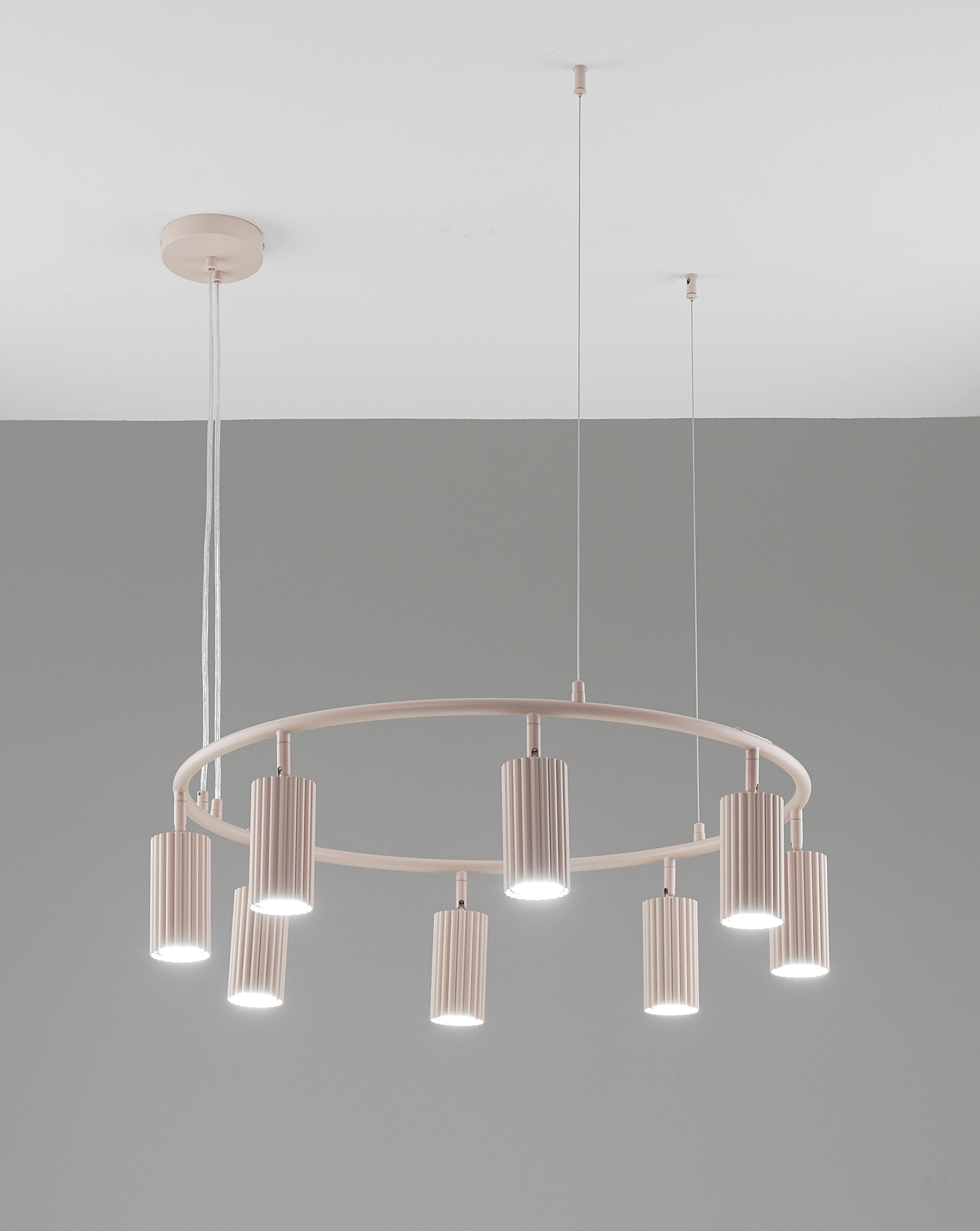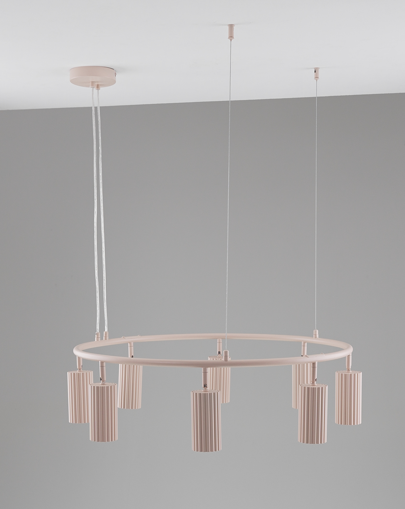 Люстра оснащена 8 лампами с цоколем GU10, каждая мощностью до 50 Вт, что дает общую мощность 400 Вт, обеспечивая освещение площадью до 16 кв.м. Специальный поворотный механизм позволяет направлять свет в нужное направление, а также регулируется по высоте, что дает дополнительную гибкость при установке.