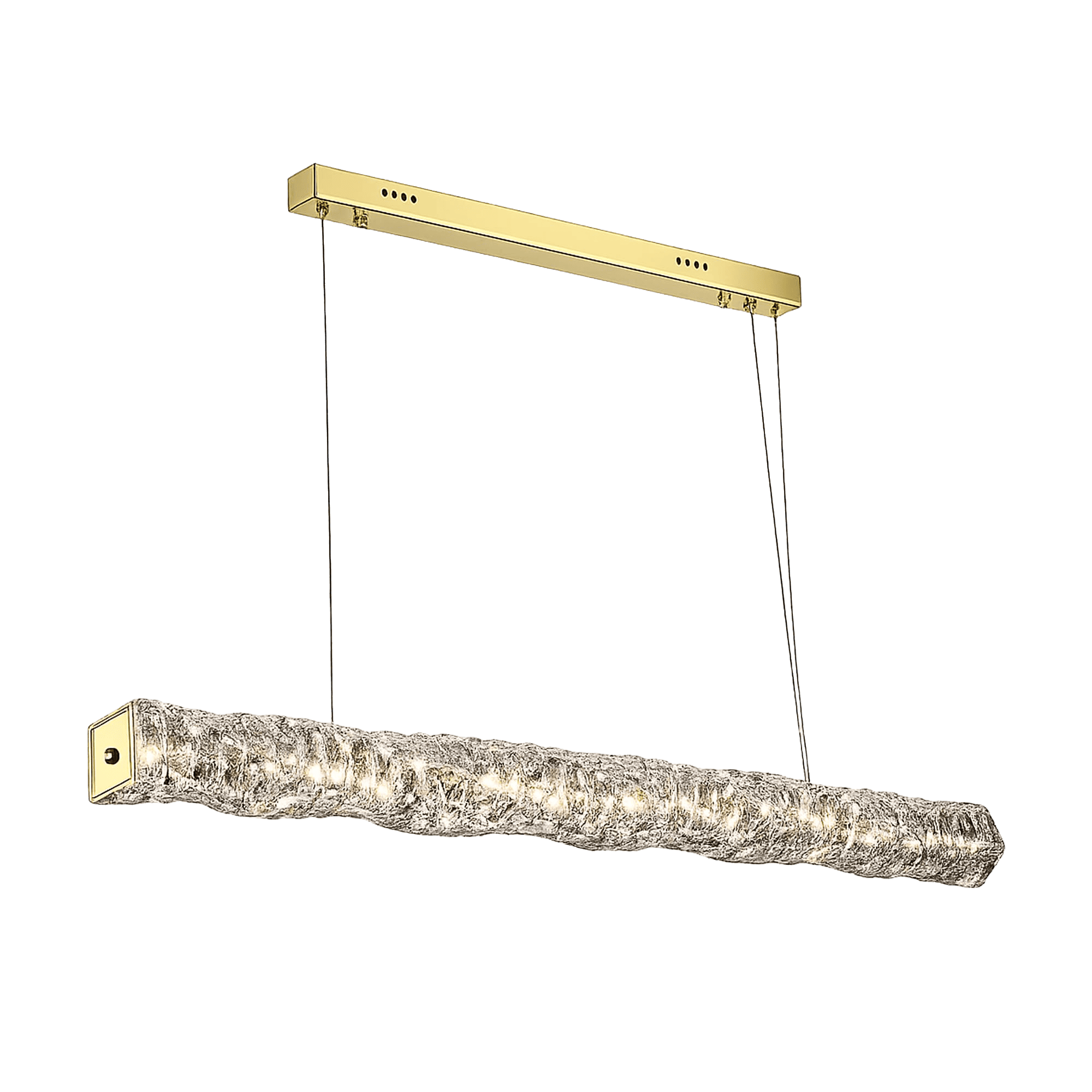 -Основной декоративный элемент — длинная горизонтальная планка из фактурного хрусталя с неровной, органической текстурой