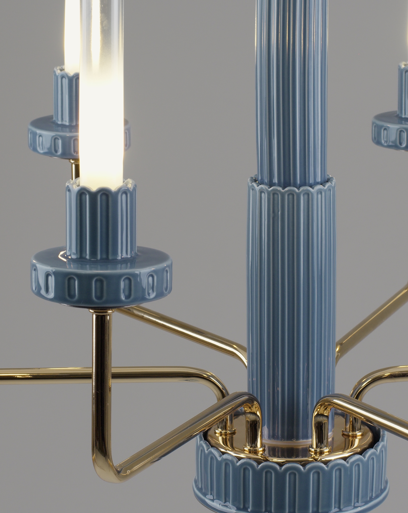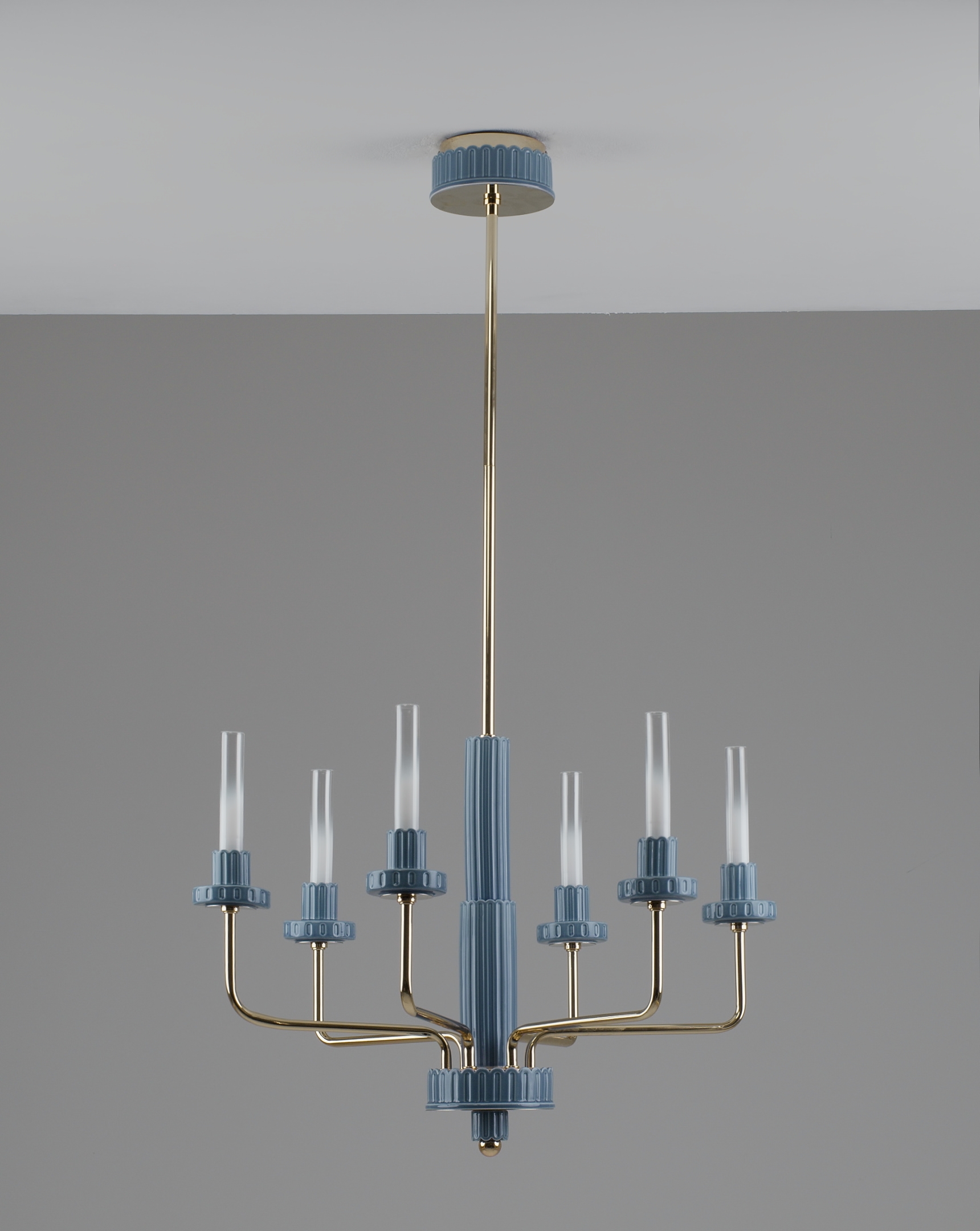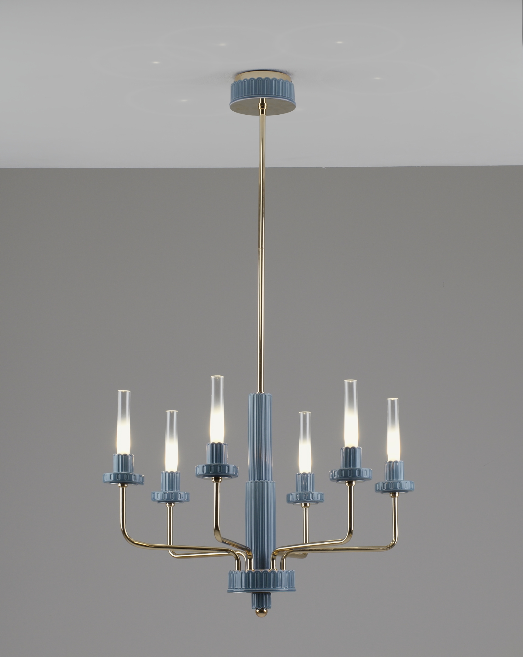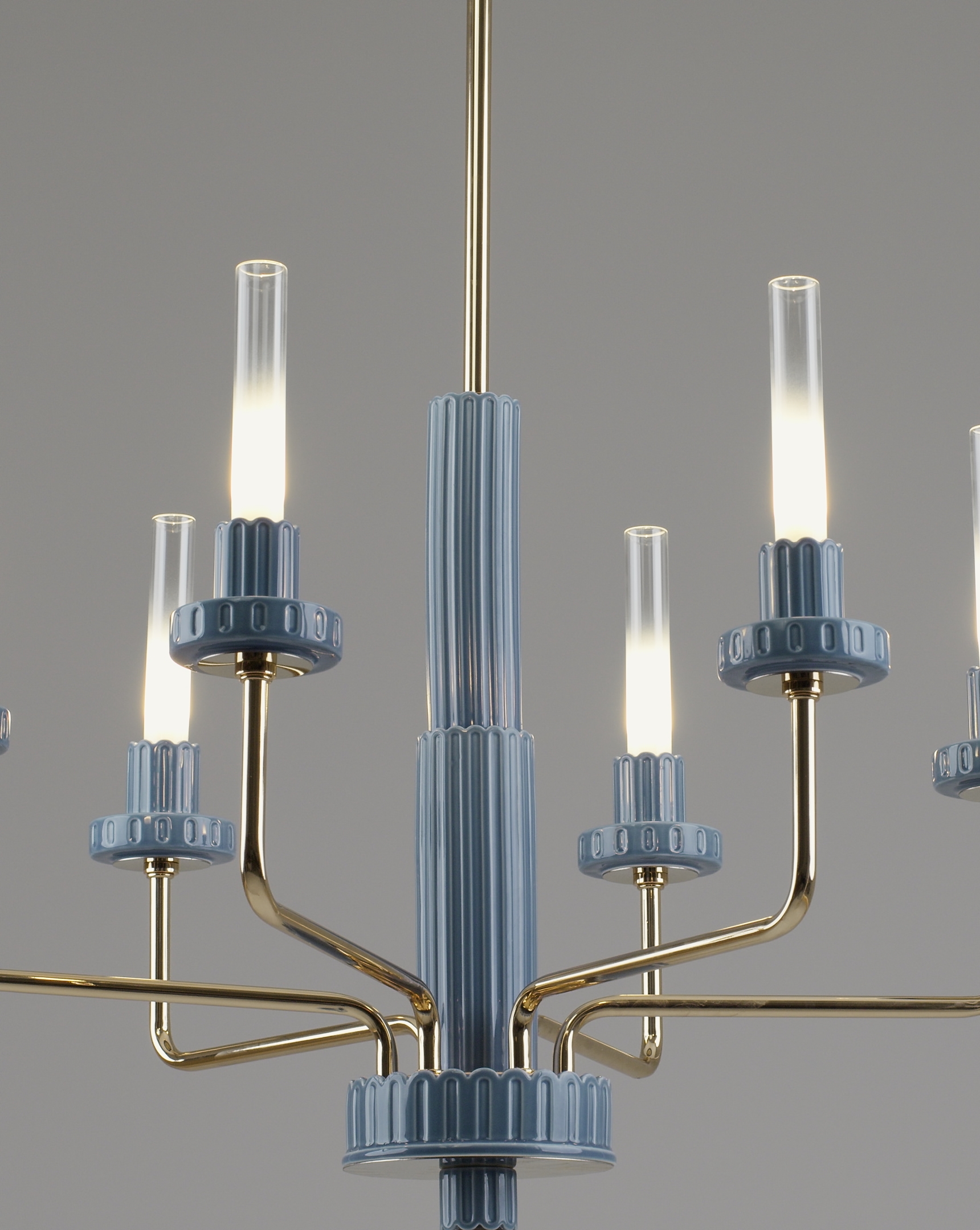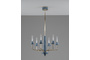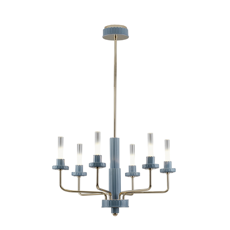 Подвесная люстра Moderli Atelieri — это гармоничное сочетание современных форм и декоративной выразительности. Шесть вытянутых цилиндрических плафонов из прозрачного стекла создают визуальную лёгкость, а аккуратные декоративные элементы из керамики в голубом оттенке придают светильнику характерный акцент. Металлический корпус с благородным золотым покрытием подчёркивает элегантность дизайна и делает люстру уместной в самых разных интерьерах — от минимализма до неоклассики.