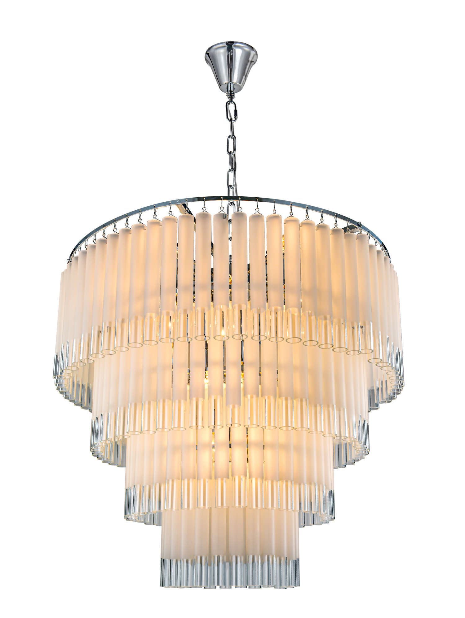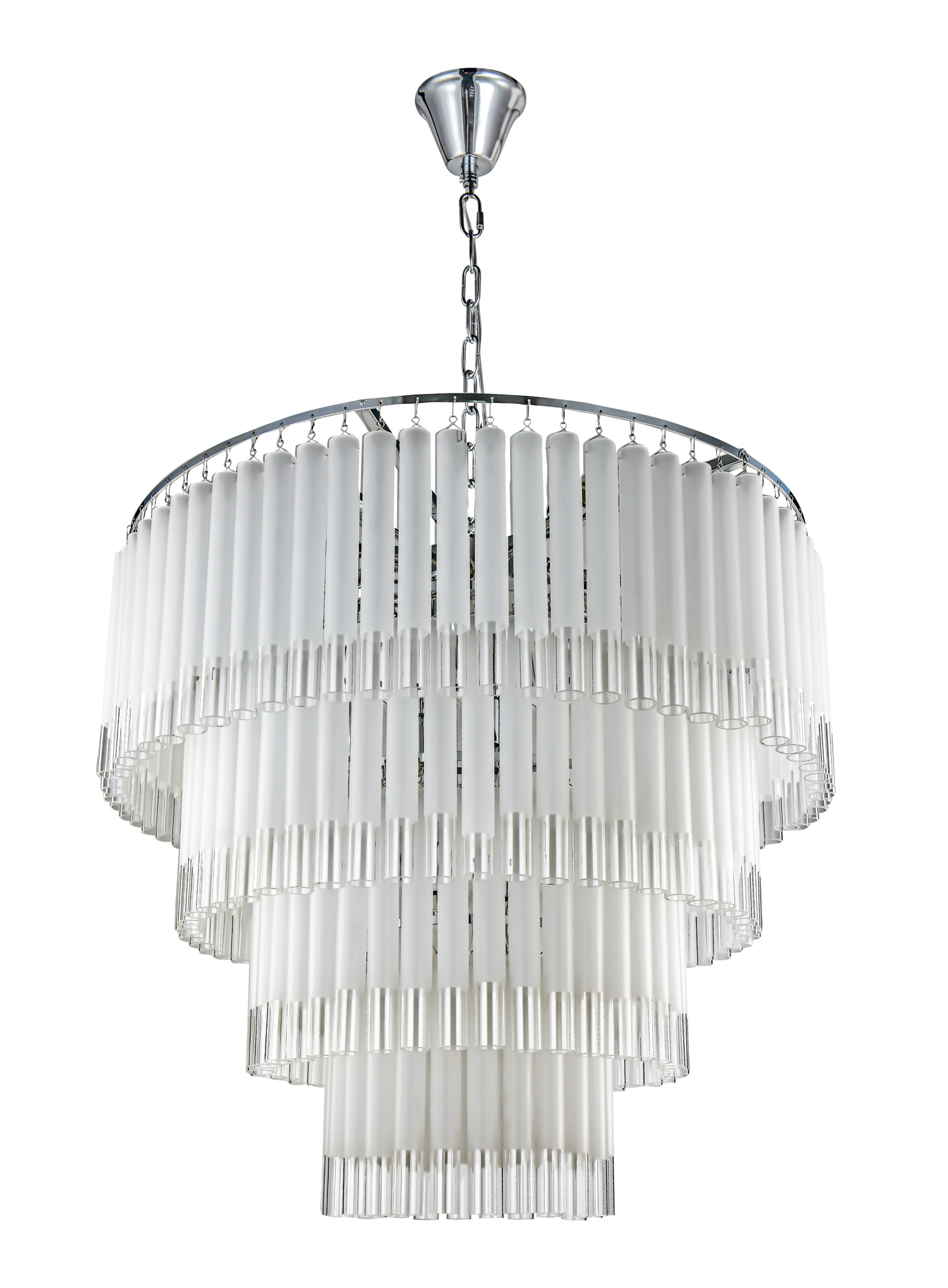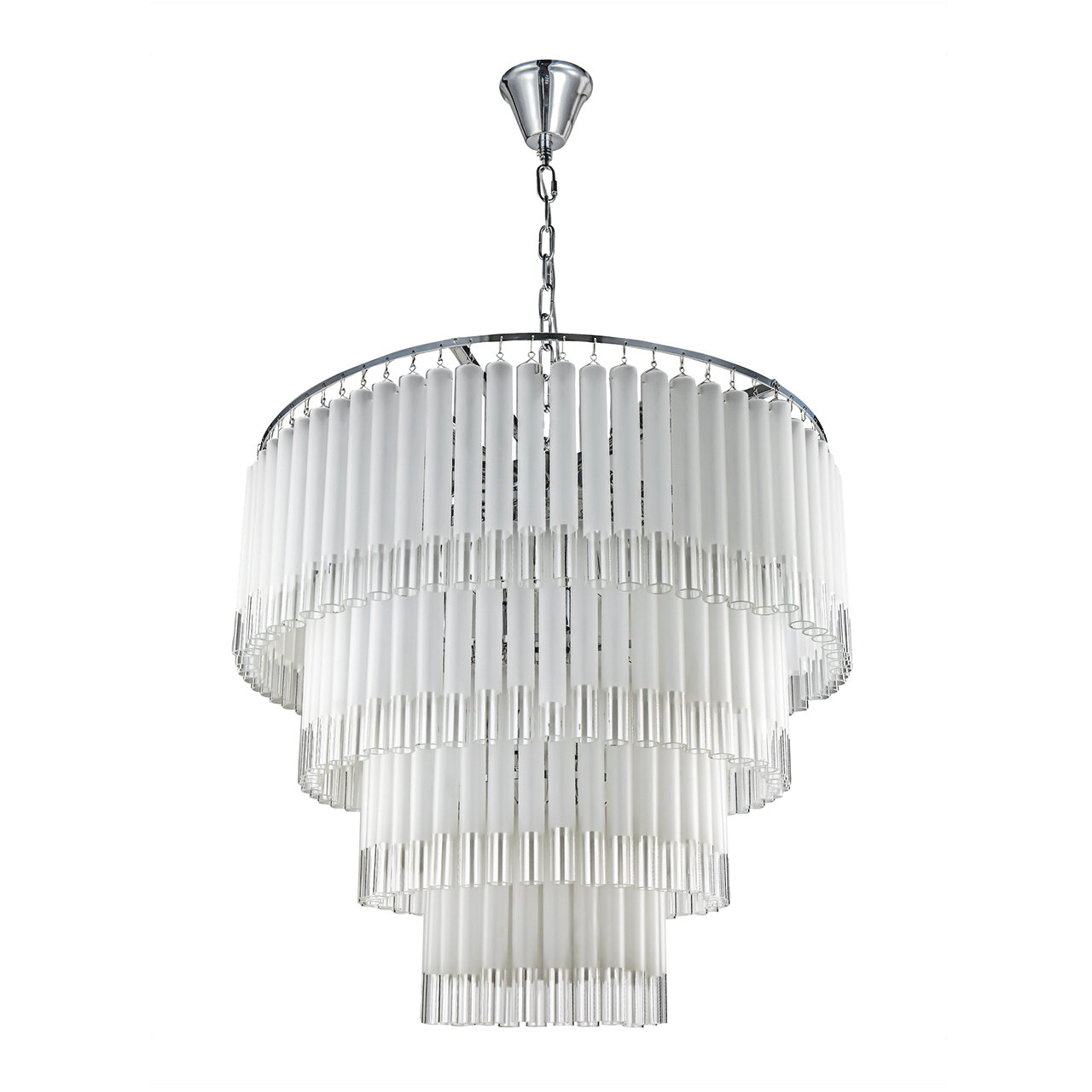 Запросить индивидуальное предложениеТрехъярусная люстра Tyrell на основе металлического каркаса цвета «хром», состоящего из системы колец разного диаметра, расположенных на разных уровнях. На кольцах удерживаются длинные узкие пластины из матового стекла, которые закрывают лампочки и создают преграду для света, частично рассеивают и приглушают его, делают более комфортным для человека. Модель представлена в двух модификациях, с диаметром верхнего яруса 600 и 800 мм и количеством лампочек 16 и 20 соответственно. Подвешивается к потолку за цепочку, идеально вписывается в интерьеры помещений, выдержанных в стиле модерн, ретро или неоклассика.