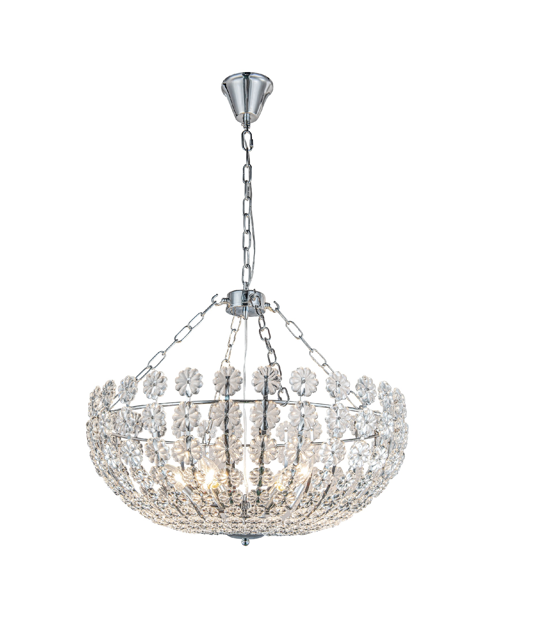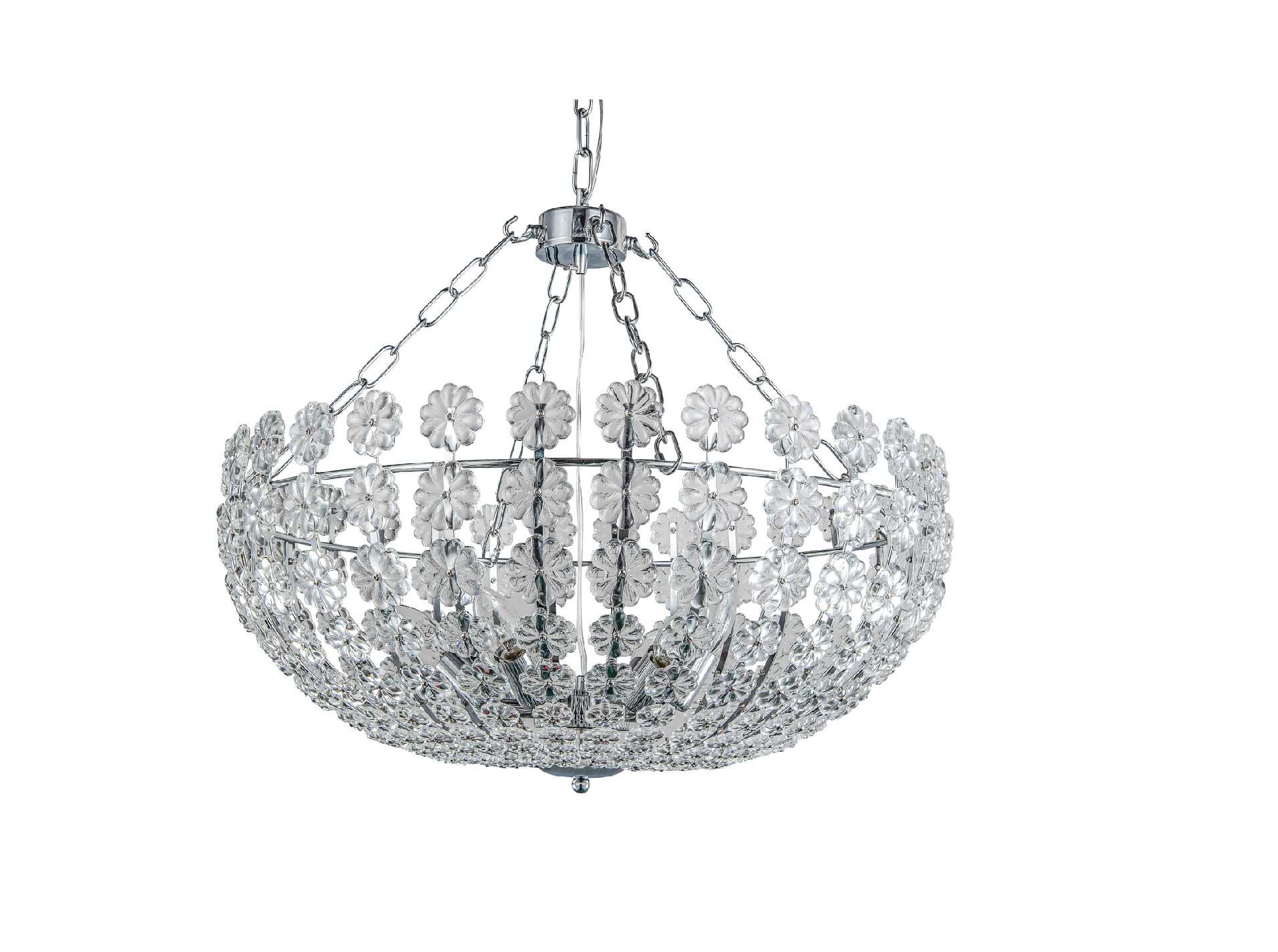 Запросить индивидуальное предложение Шикарная люстра Cleo серебристого цвета, в виде чаши с ажурными стенками. Легкий полувоздушный каркас из хромированной проволоки покрыт сетью изящных цветков, отлитых из прозрачного стекла. Внутри чаши скрыты цоколи Е14 с лампочками, свет которых, проходя сквозь стеклянную преграду, частично преломляется и приглушается, с созданием необычных визуальных эффектов. Модель представлена двумя размерами (диаметром 500 и 600 мм) с разным количеством лампочек (6 и 8 соответственно). Подвешивается к потолочной планке при помощи крепежной системы, состоящей из пяти цепочек и кольца. Подходит для изысканных интерьеров в стиле ретро, классика или модерн.