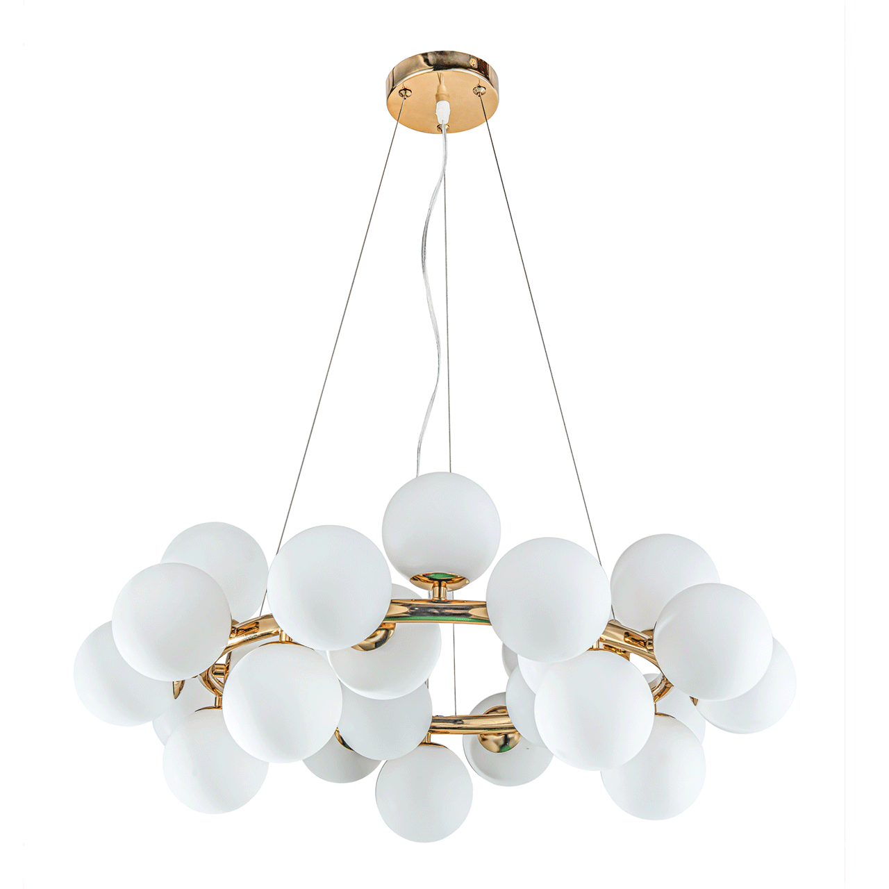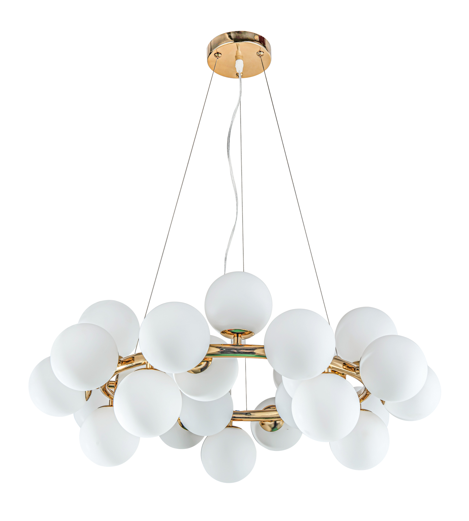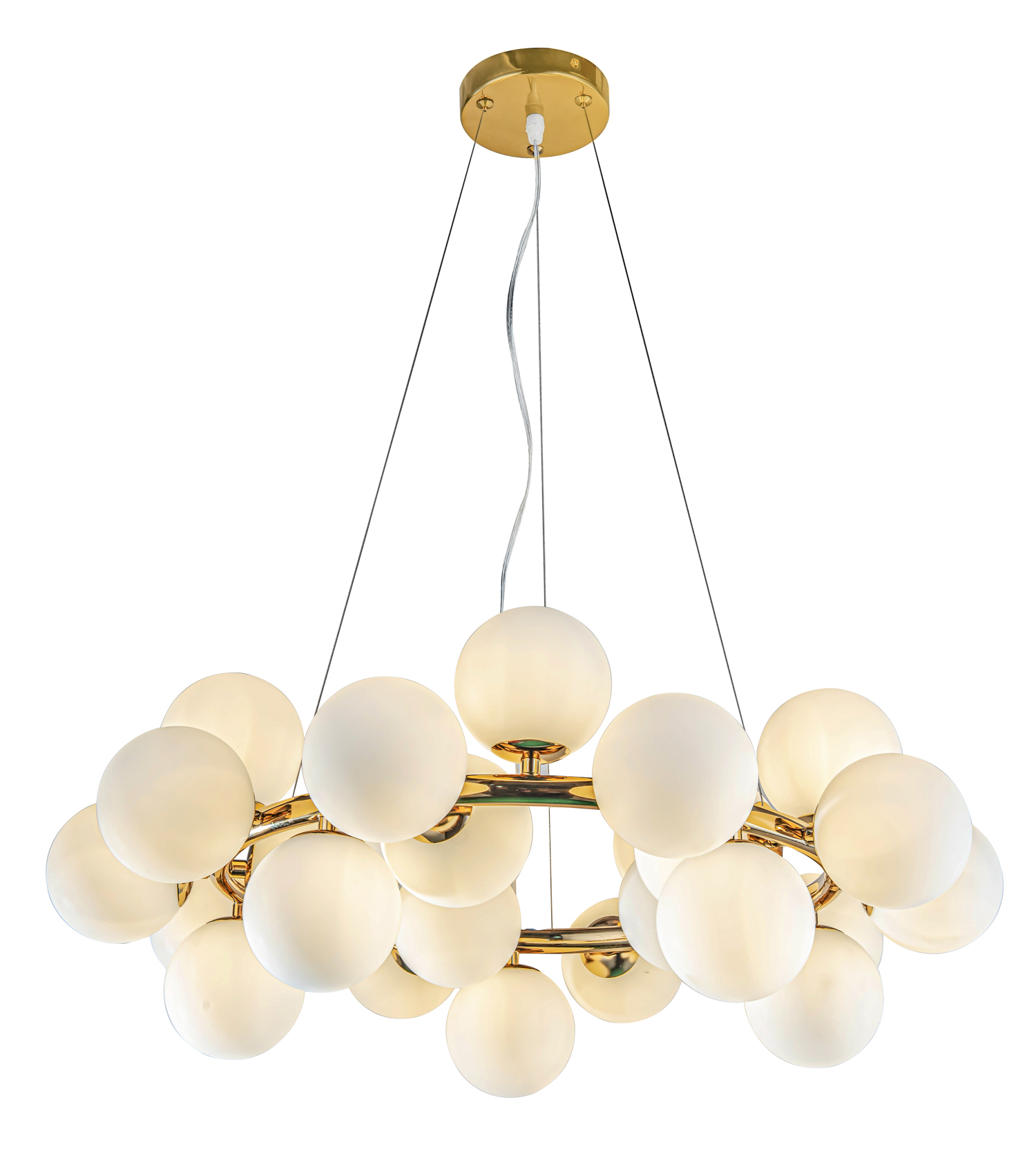 Запросить индивидуальное предложение Люстра Marsiada D680 дискообразной формы изготовлена из стилизованного под золото металла и высококачественного матового стекла. В основе конструкции лежит металлическое кольцо, к которому на коротких держателях крепятся разнонаправленные цоколи G4. Светодиодные лампы закрывают сферические плафоны, которые частично рассеивают и смягчают свет, делают его более приятным для глаз. Модель содержит в своем составе 25 лампочек и подвешивается к круглой потолочной планке тремя металлическими нитями. Подходит для жилых и нежилых помещений, отлично вписывается в любые современные интерьеры со сдержанным декором.