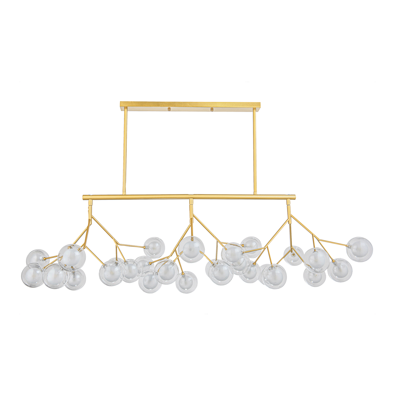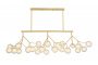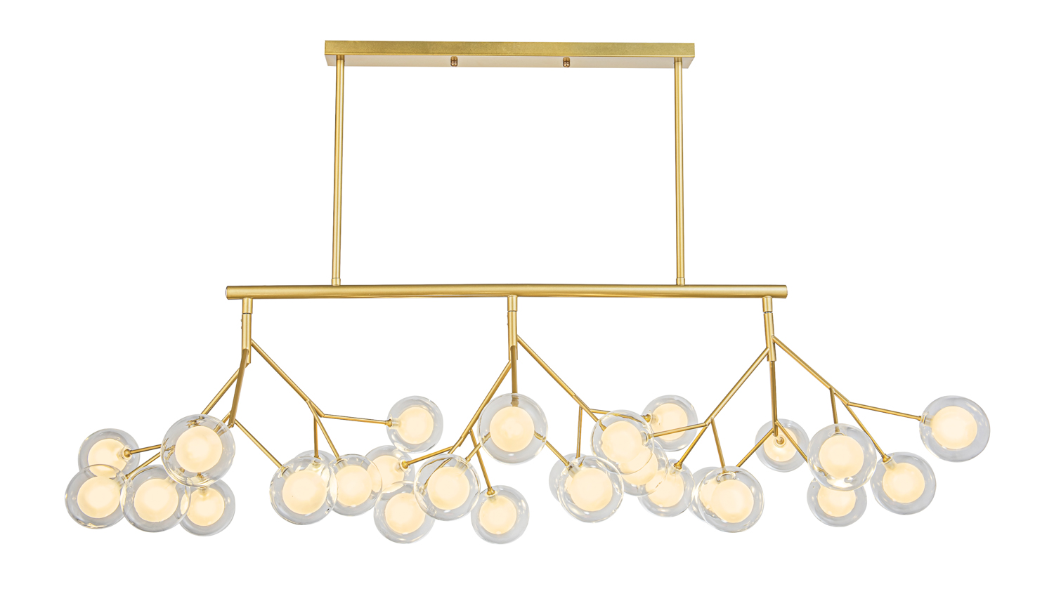 Запросить индивидуальное предложение Люстра Betta выполнена на основе бронзового металла и прозрачного стекла. Каркас модели состоит из одного длинного горизонтального стержня и трех, перпендикулярных ему, коротких стержней, от которых отходят вниз, разветвляясь, 27 держателей для светодиодных лампочек с цоколями G4 на концах. Шарообразные плафоны, прикрывающие собой лампочки, выполняют двойную роль: повышают эстетичность изделия и слегка приглушают свет, делают его менее резким. Светильник крепится к круглой потолочной планке при помощи двух тонких металлических нитей высокой прочности. Его размеры составляют 1 м в длину и 40 см в ширину. Модель подходит для минималистических интерьеров со сдержанным декором, создает в помещении мягкое, приятное для глаз освещение и способствует комфортному отдыху и релаксу.
