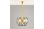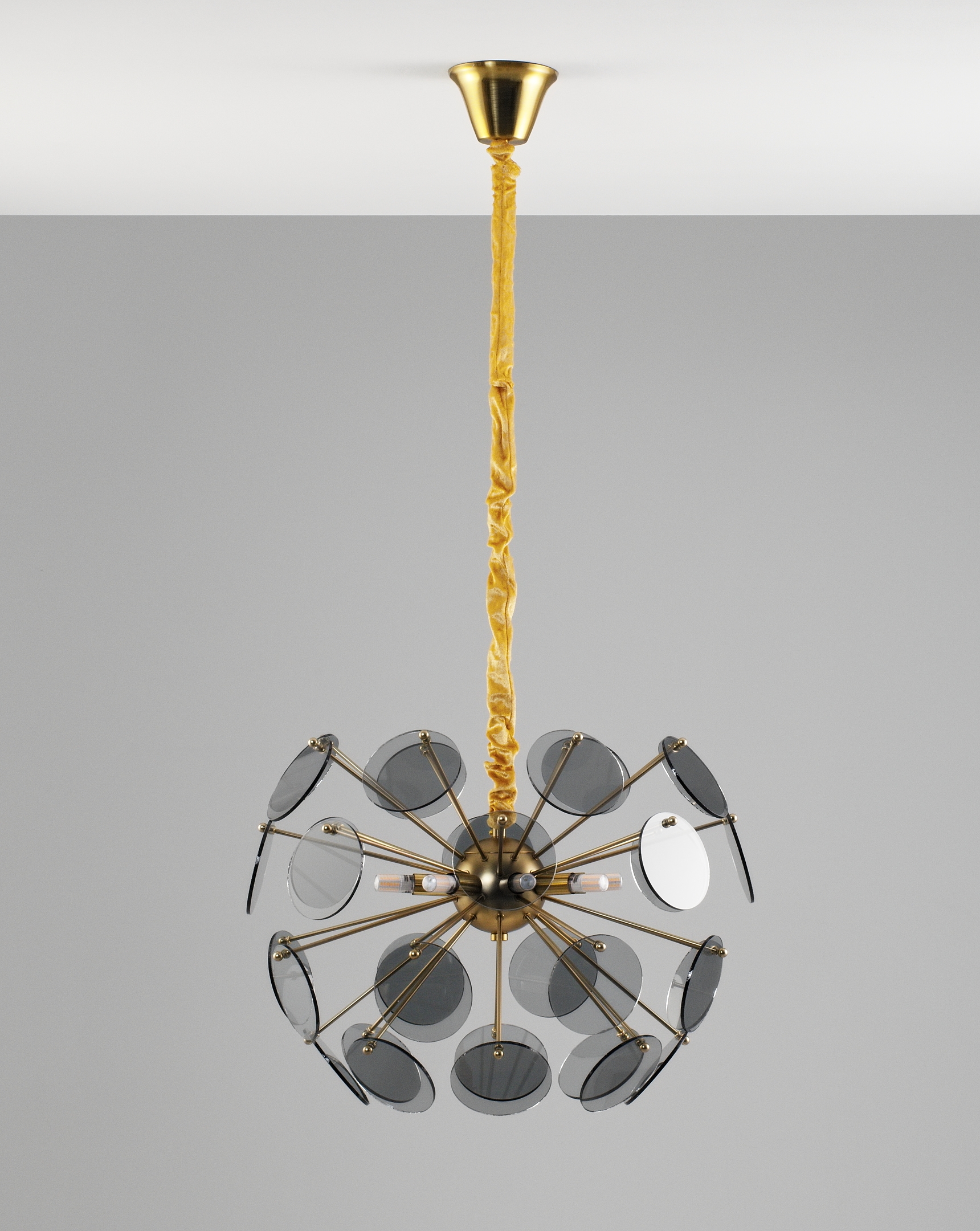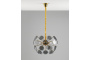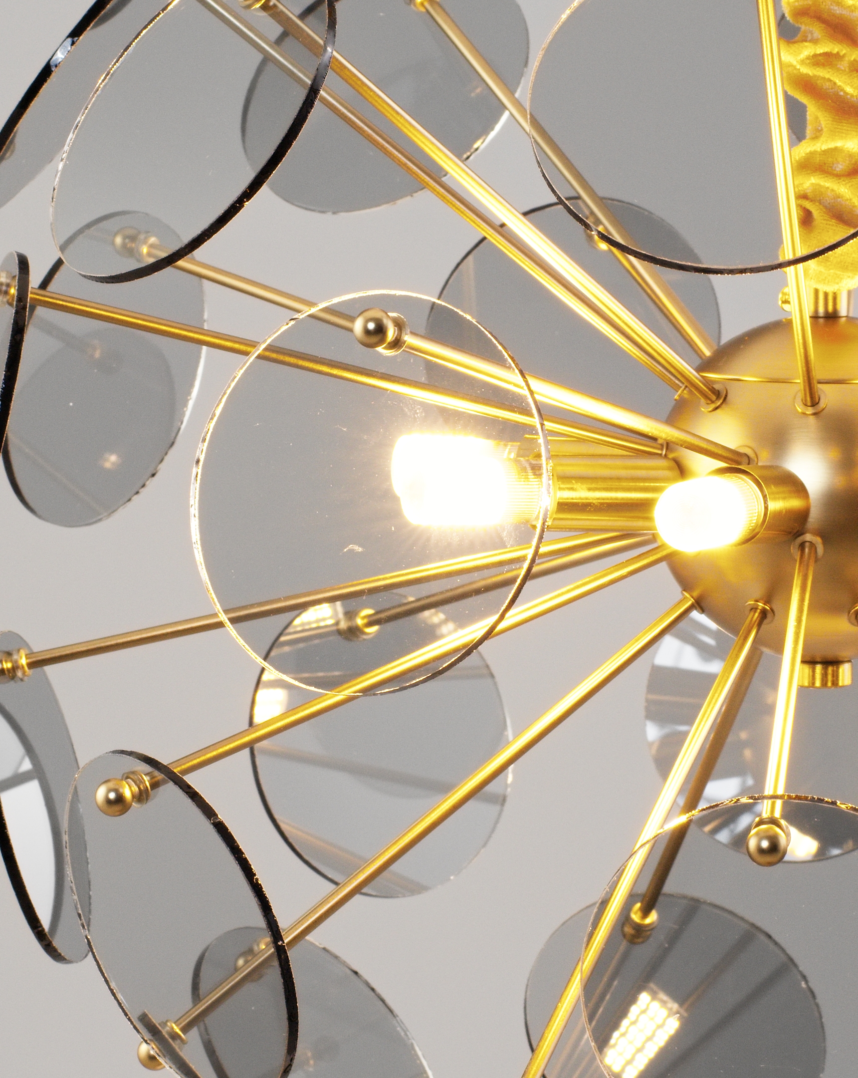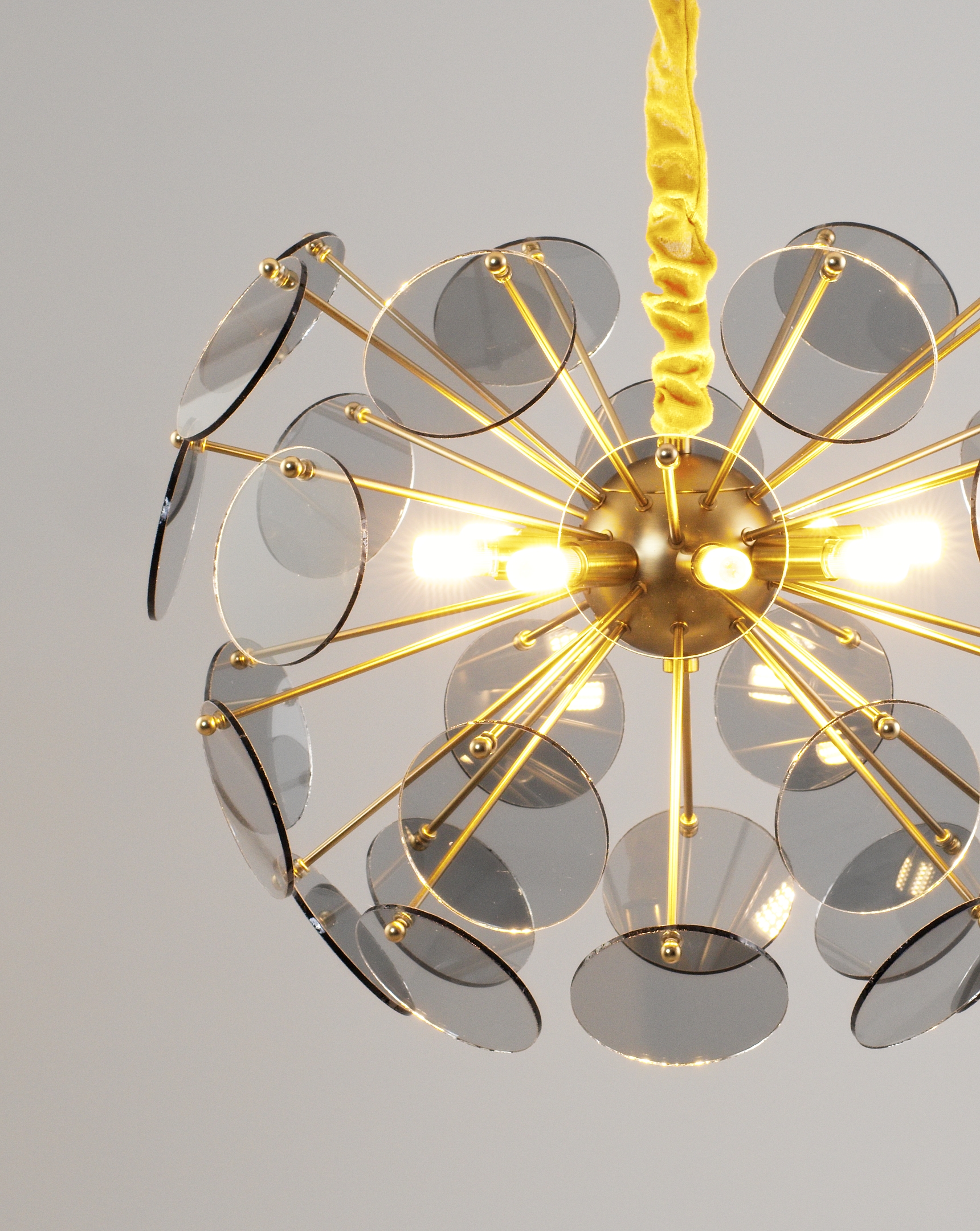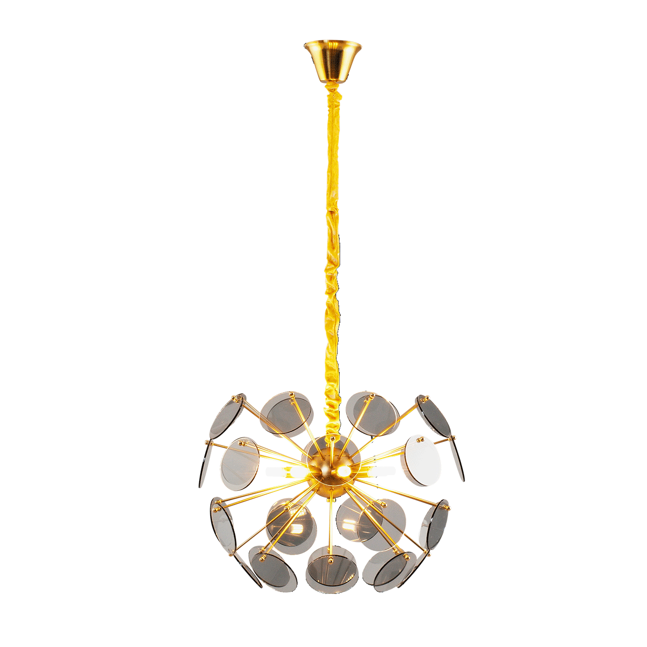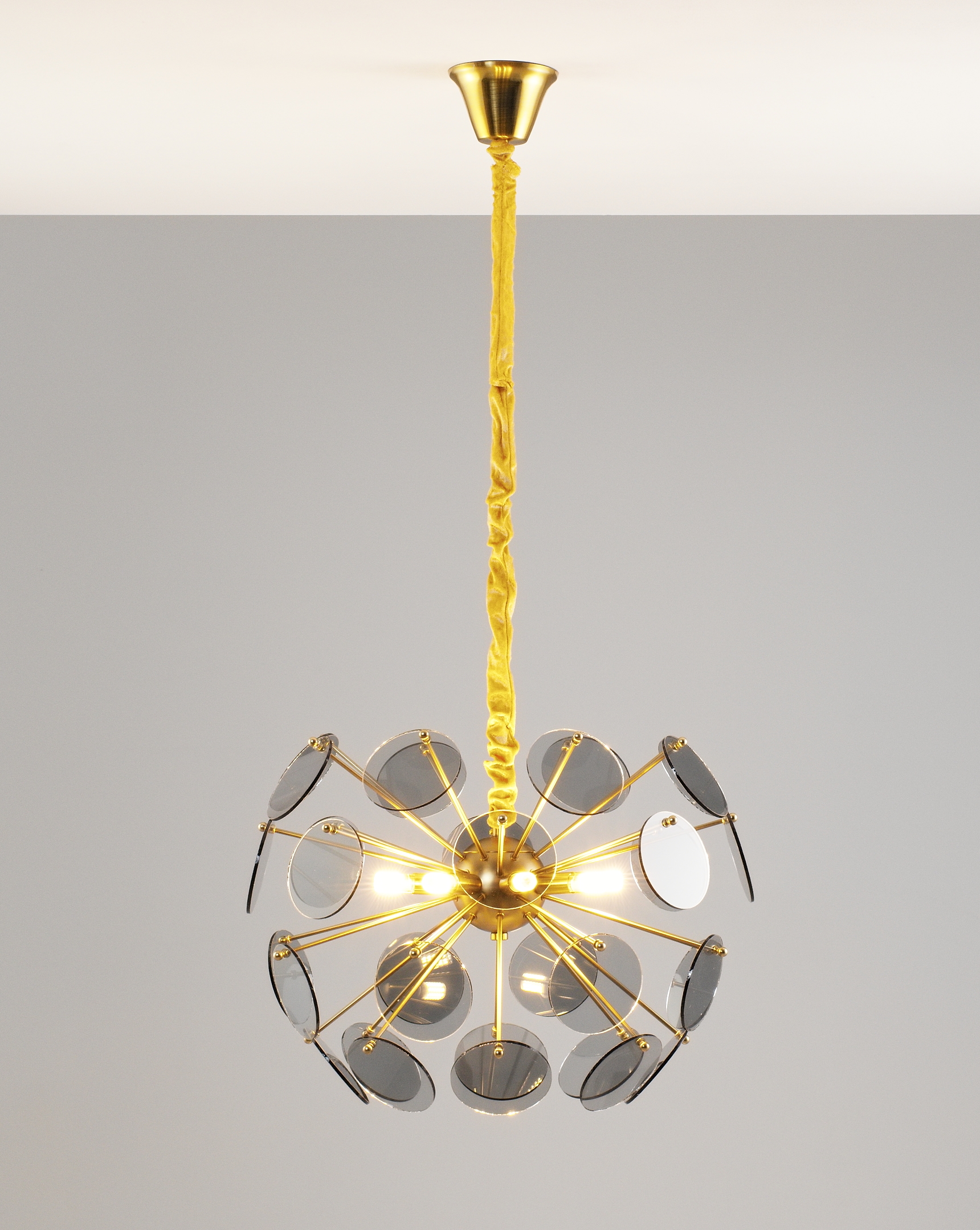 Запросить индивидуальное предложениеСовременная подвесная люстра в стиле модерн. Каркас золотого цвета в форме шара декорирован вставками из дымчатого стекла, которые придают люстре объемность и создают приглушенное освещение. В качестве источника света подойдут лампы с цоколем G9. Люстра крепится к потолку с помощью планки и удерживается цепью, которую при необходимости можно отрегулировать по высоте. Тканевый кожух поверх цепи снимается.