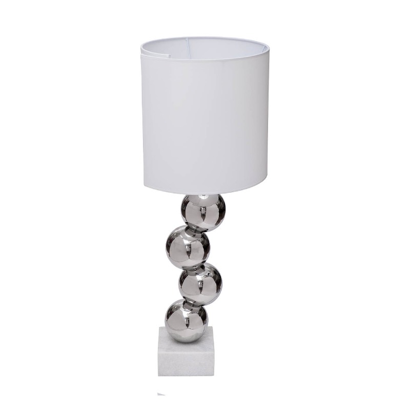 Запросить индивидуальное предложениеИнтерьерная настольная лампа выполнена в оригинальном дизайне, благодаря чему будет отлично смотреться в современных обстановках. Светильник изготовлен из высококачественных материалов. Абажур держится на оригинальной ножке, состоящей из нескольких металлических шариков цвета хром и мраморного основания, что создает невероятно привлекательную композицию. Белый абажур из натуральной ткани прекрасно рассеивает световой поток, создавая мягкое освещение. Эта элегантная и красивая настольная лампа станет отличным интерьерным решением для всех типов помещений: спален, прихожих, гостиных и офисов. Модель подходит для современных стилей интерьера – арт-деко, контемпорари, бохо, эклектика, лофт, фьюжн.